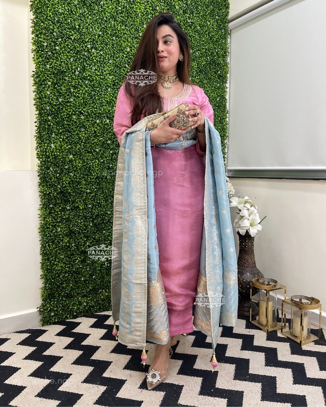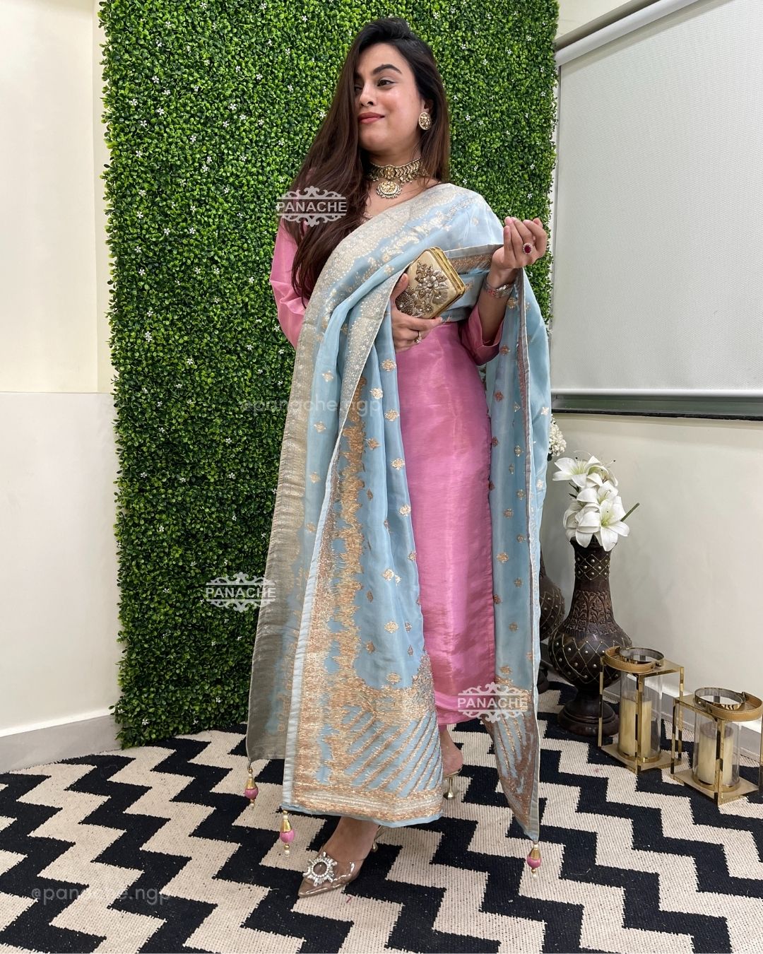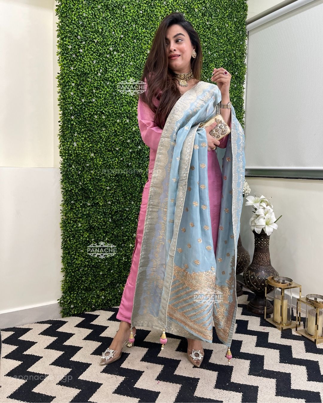 🟣 Intricate neckline, simple undertones and a beautiful woven banarsi dupatta all in pastels