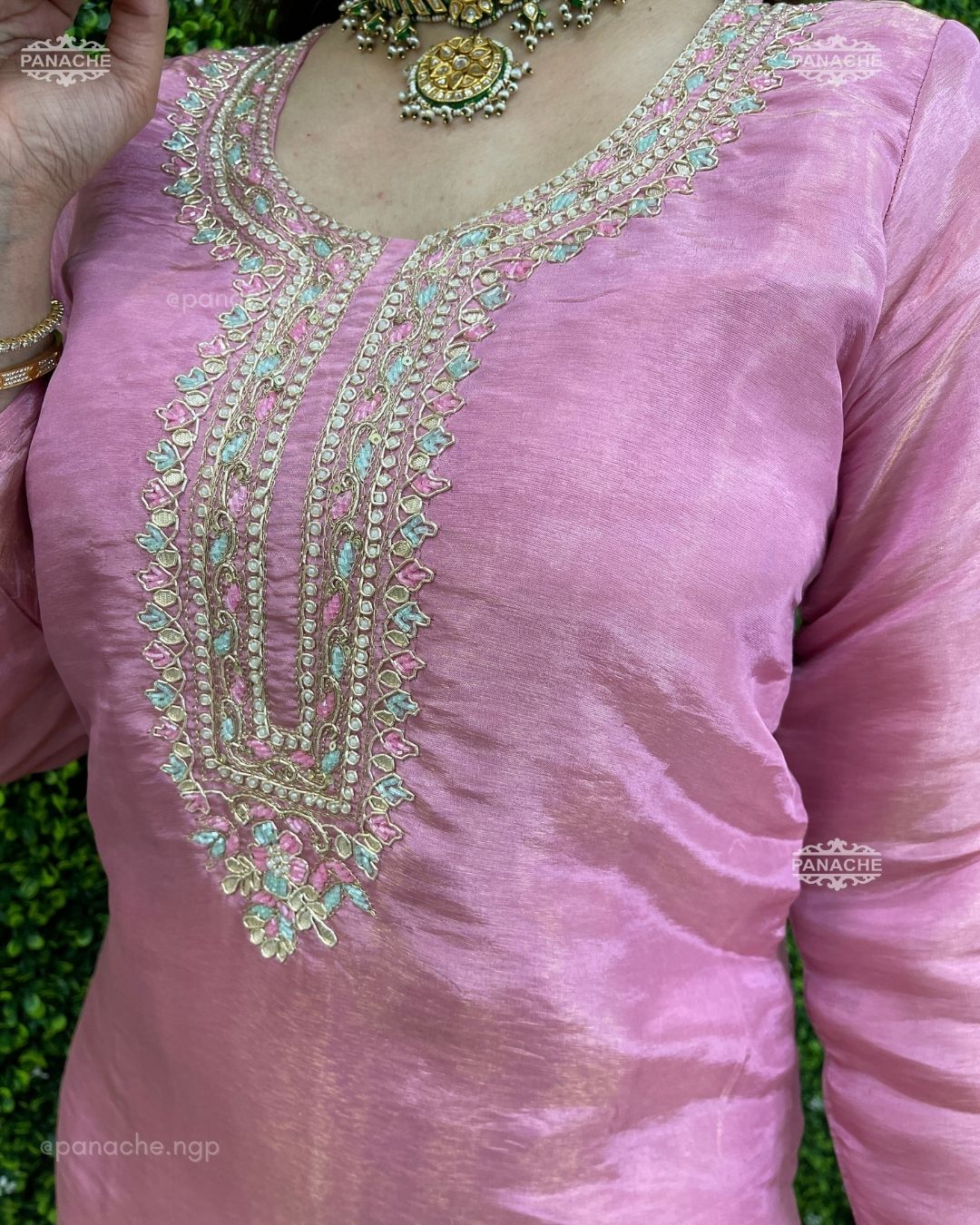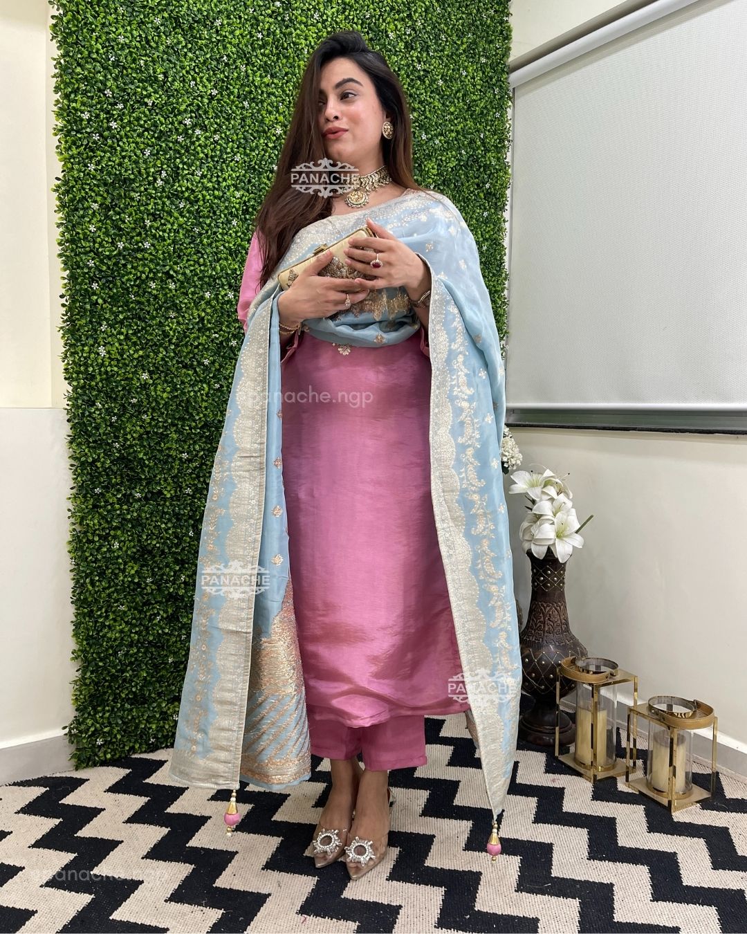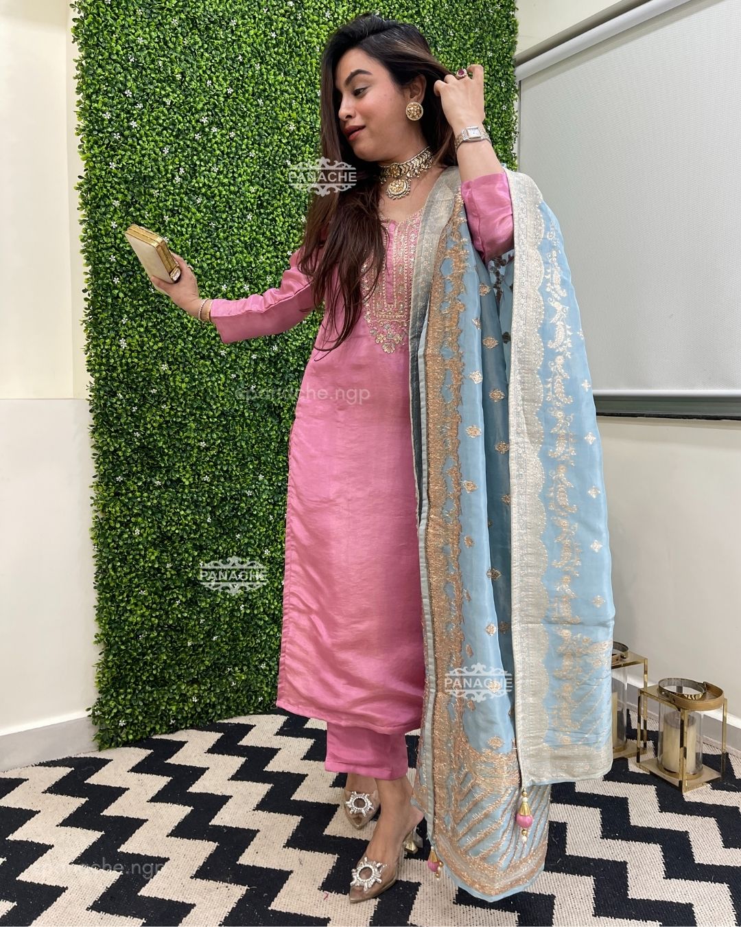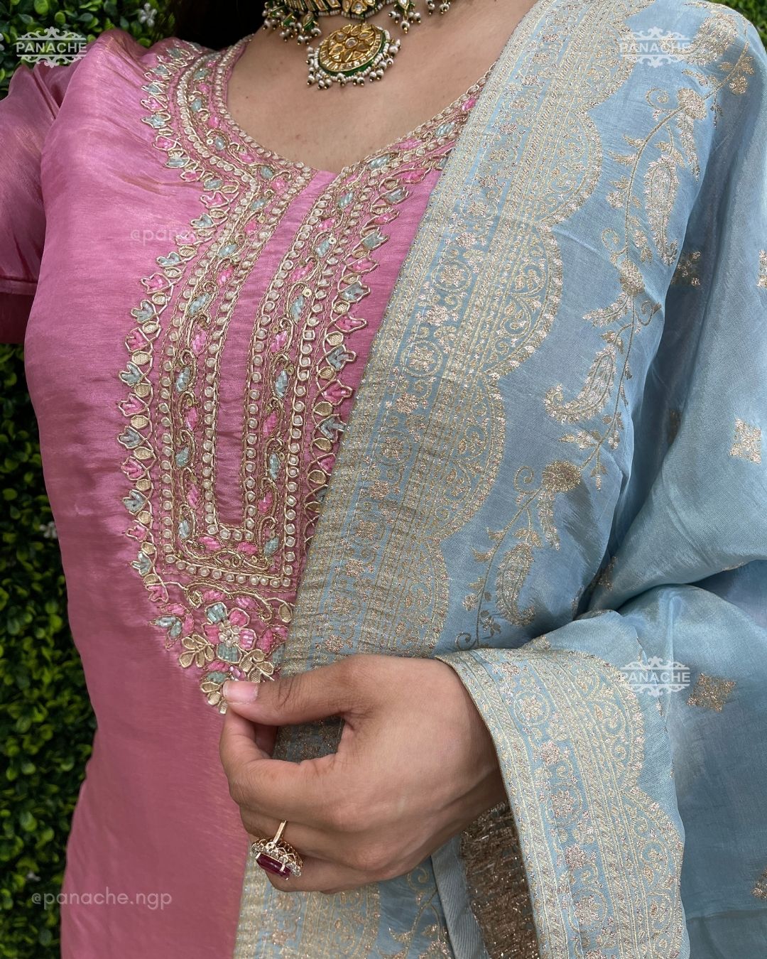 🟣 Intricate neckline, simple undertones and a beautiful woven banarsi dupatta all in pastels