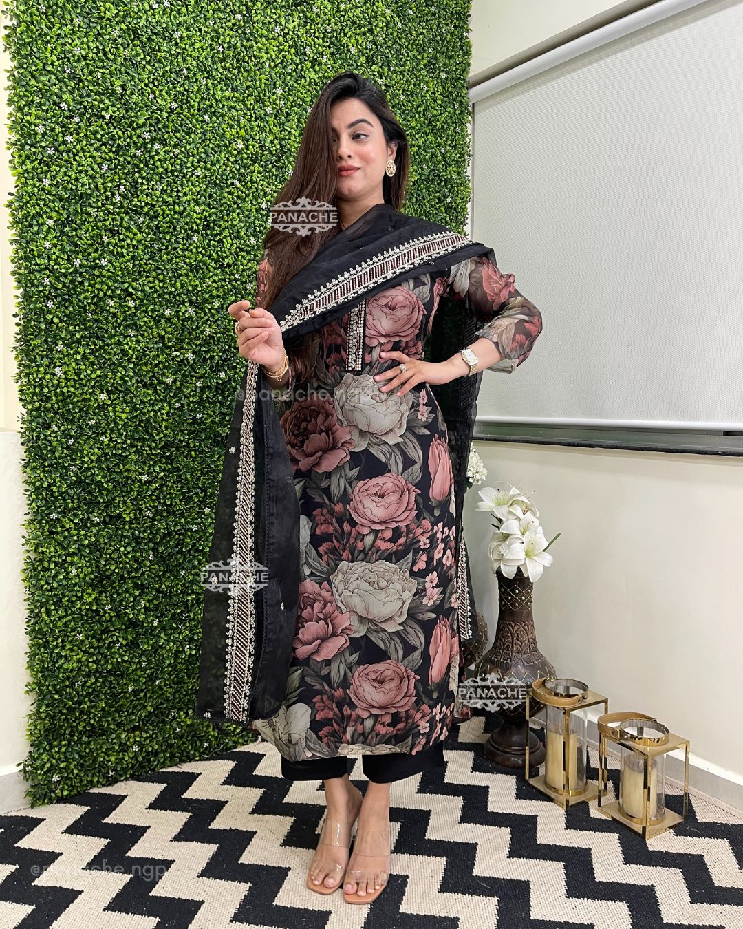 🟣 A elegant dupatta giving classy vibes with v neckline embroidered kurta in a English color palette and plain pants,