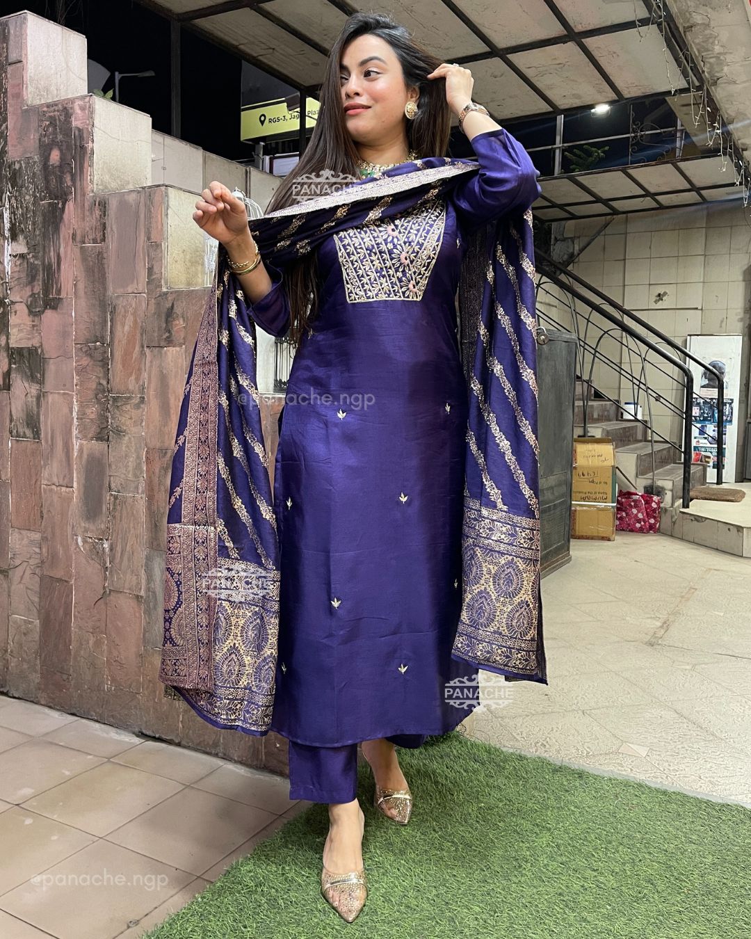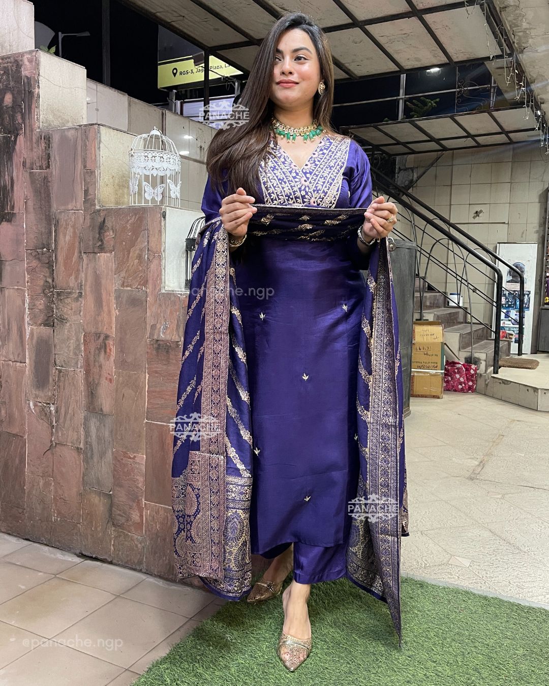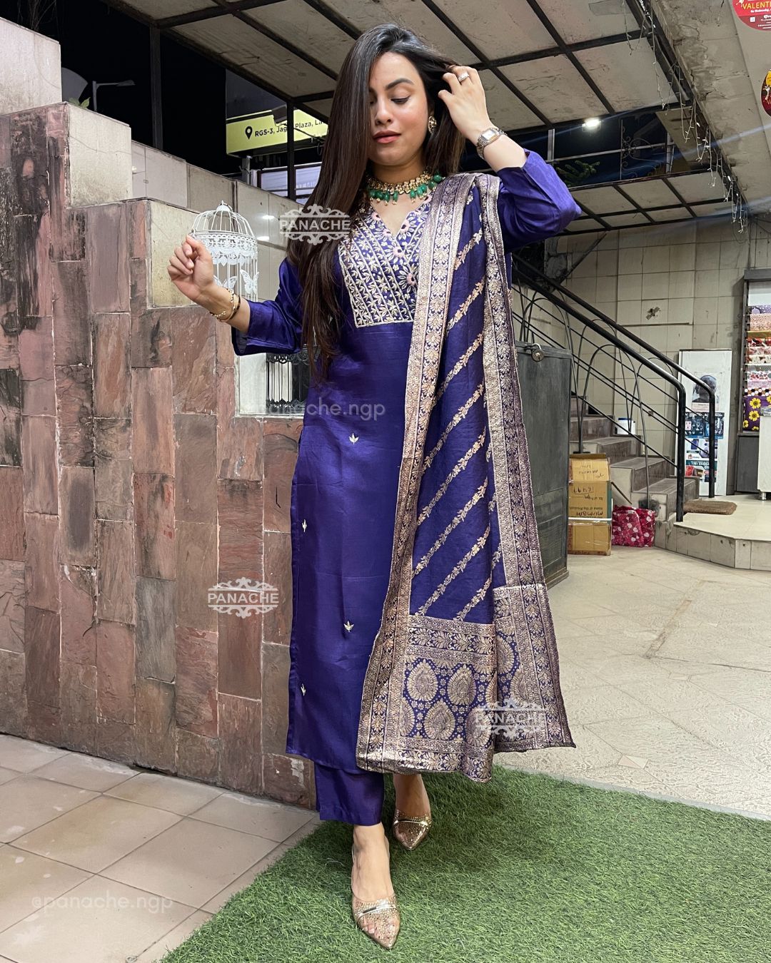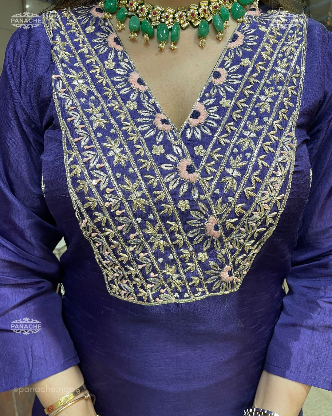 🟣 Introducing a whole near neckline with zardoz frenchknot and small buttas all over kurta, a wooven banarsi dupatta with plain pants