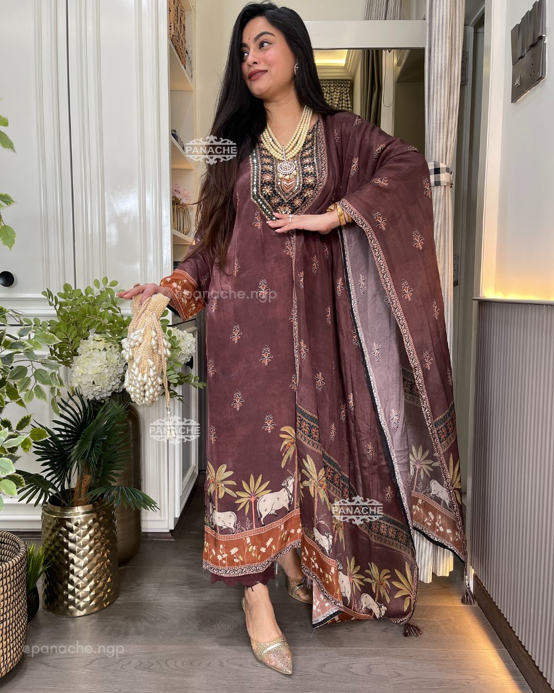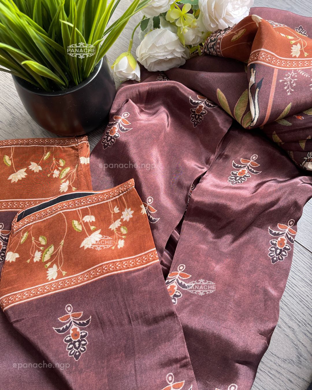 🟣 Softest fabric with the loveliest print details on Ajrak and a handwork neckline with plain pangs and georgette dupatta