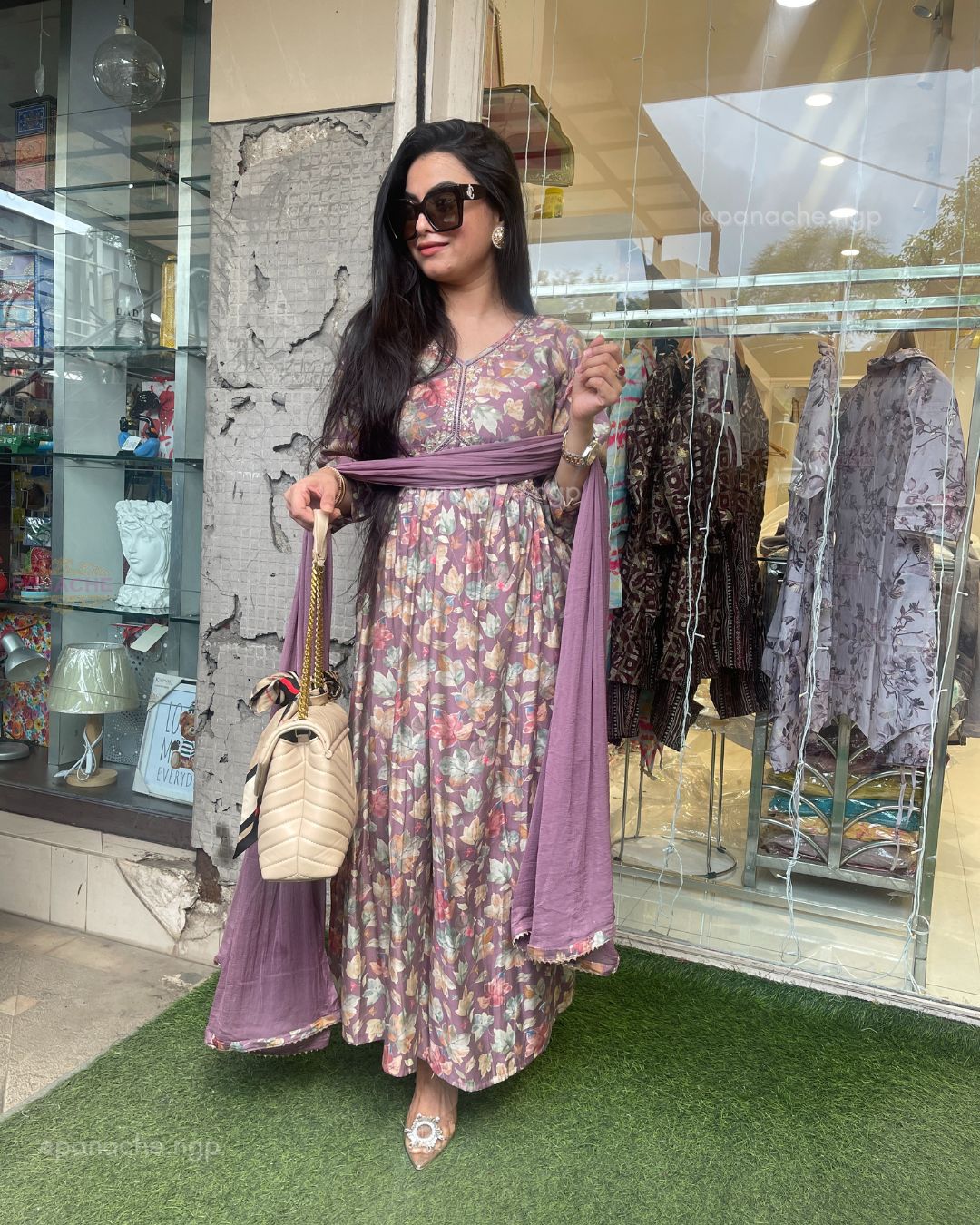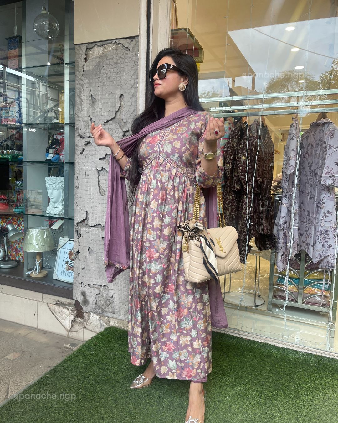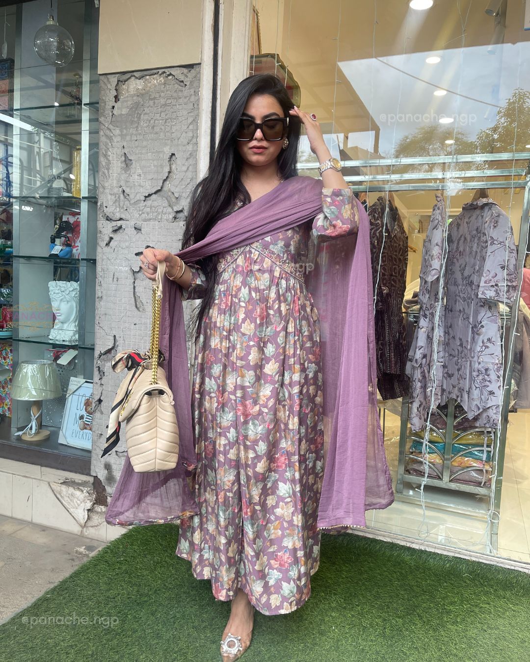 🟣 Floral printed Alia Nyra cut kurta with plain pants and plain dupattas