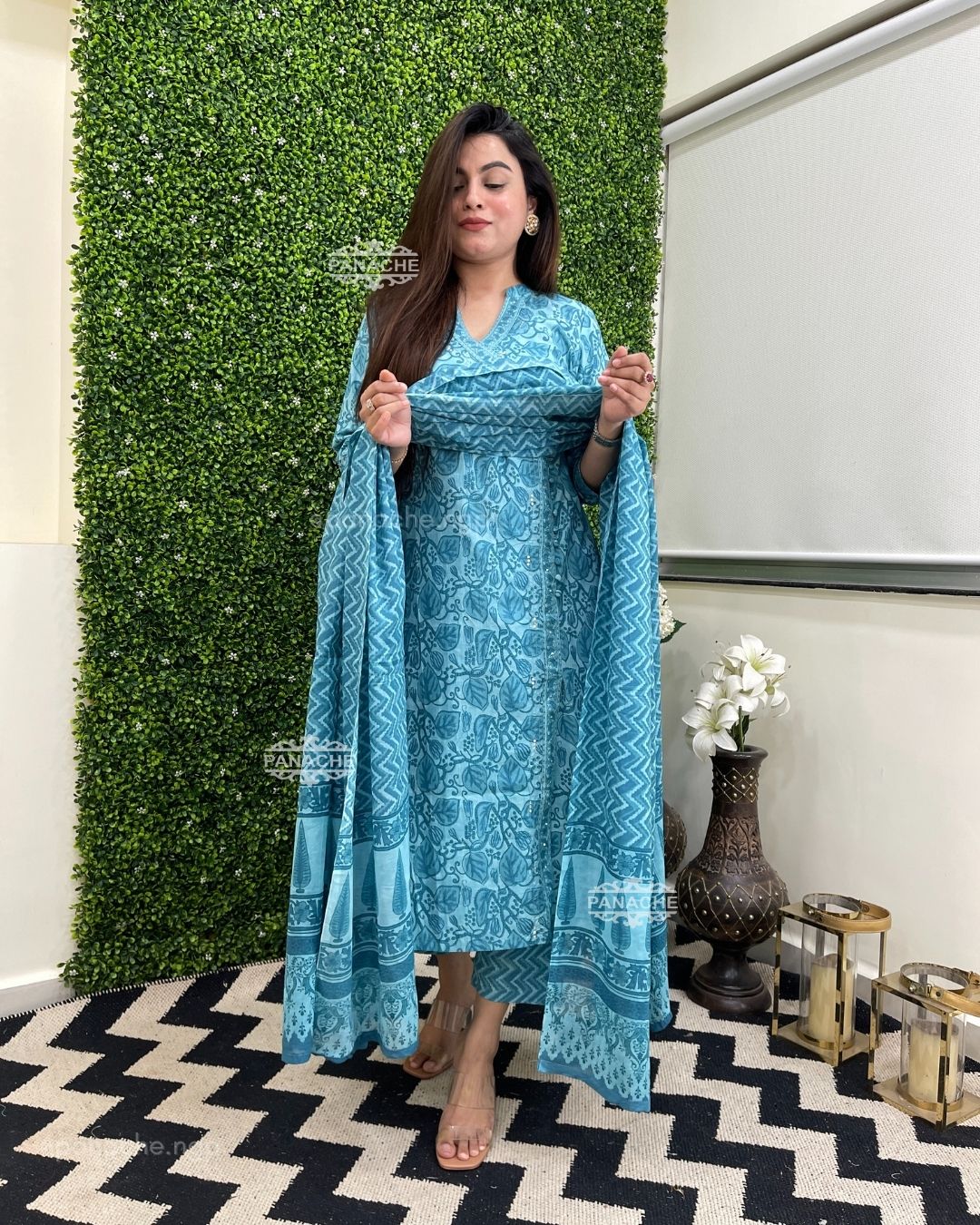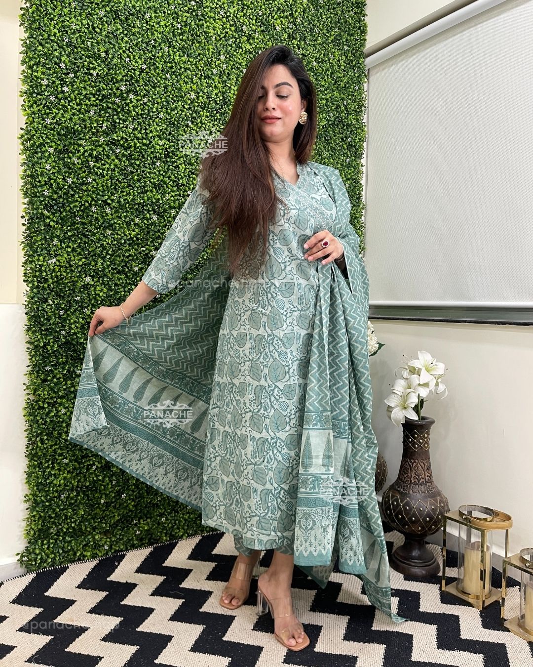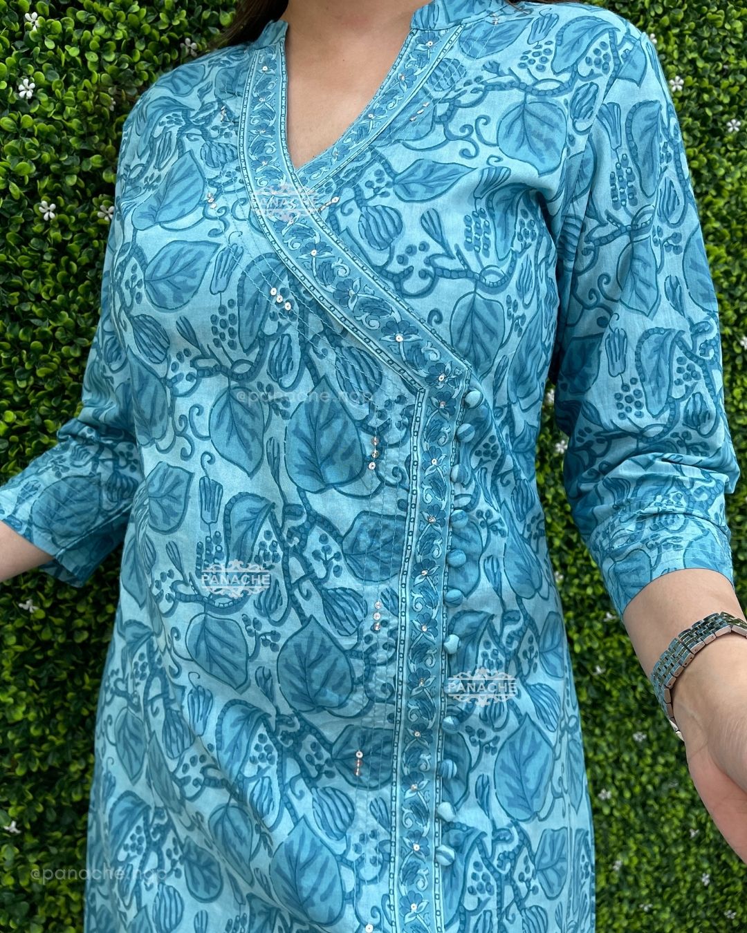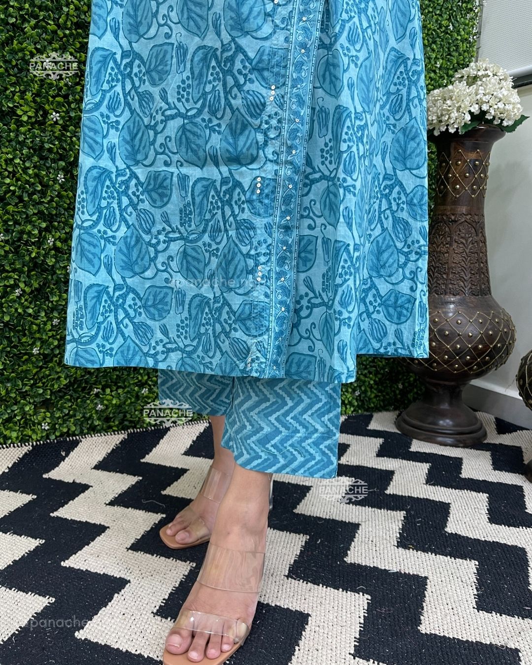 🟣 A daily wear suit set print on print angrakha style kurta pant dupatta, sequein highlights on angrakha pattern