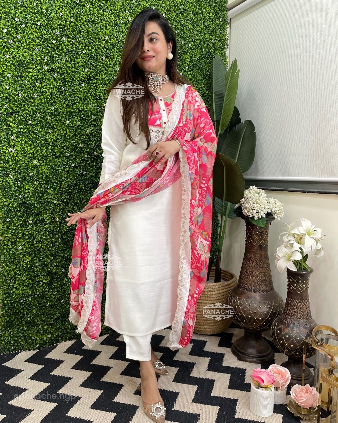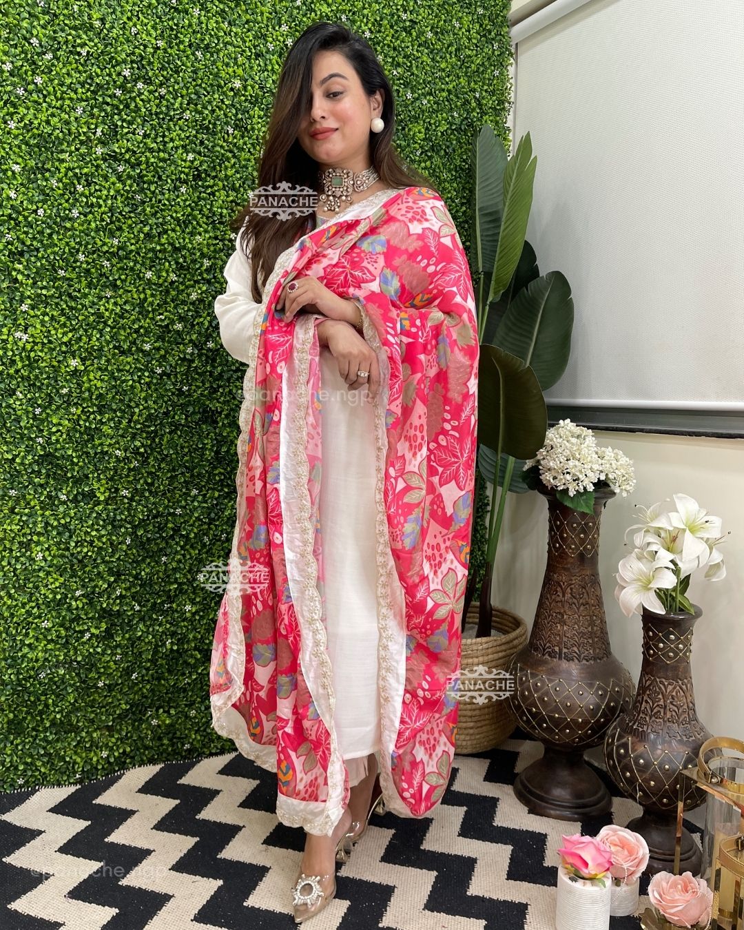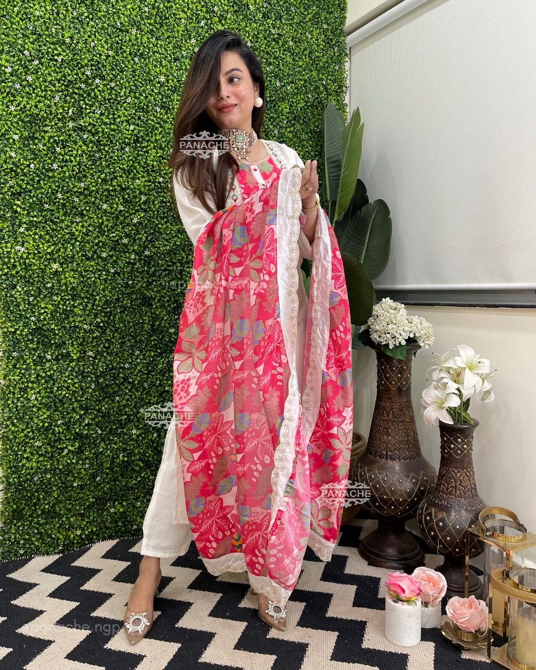 🟣 Appliqué neckline of kurta, lace on dupatta, beautiful print on dupatta