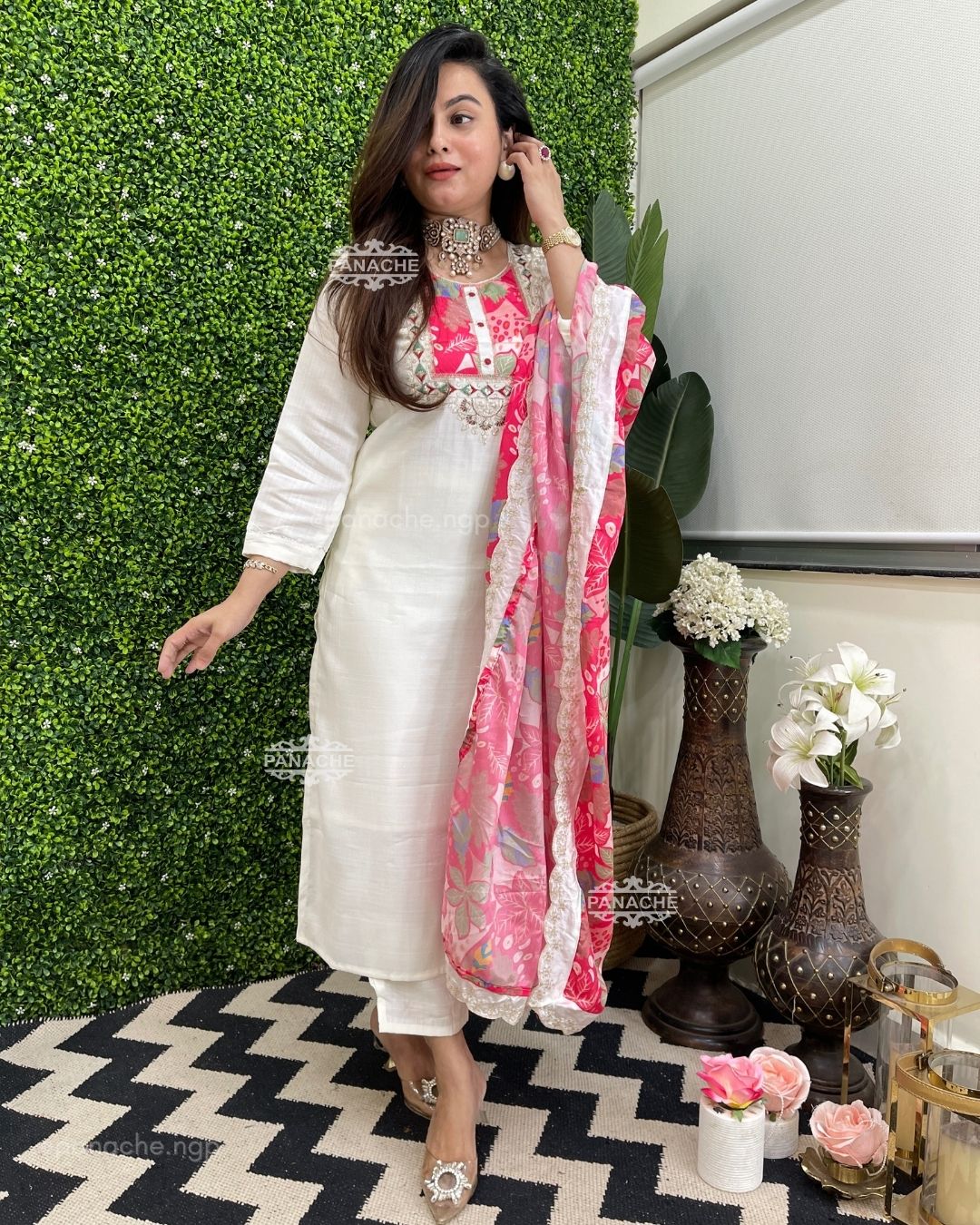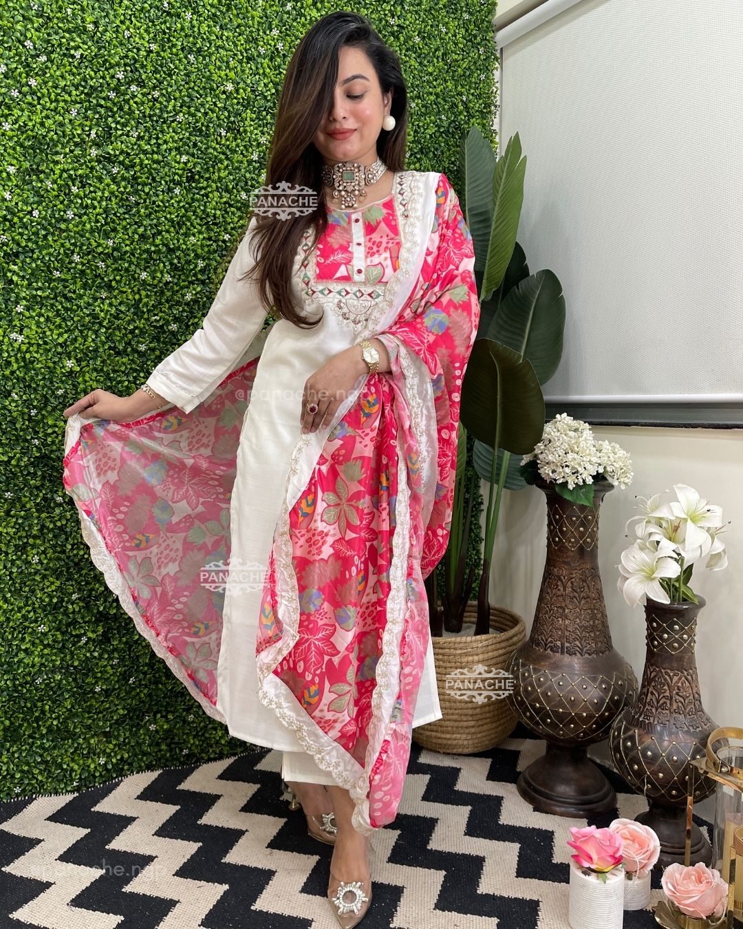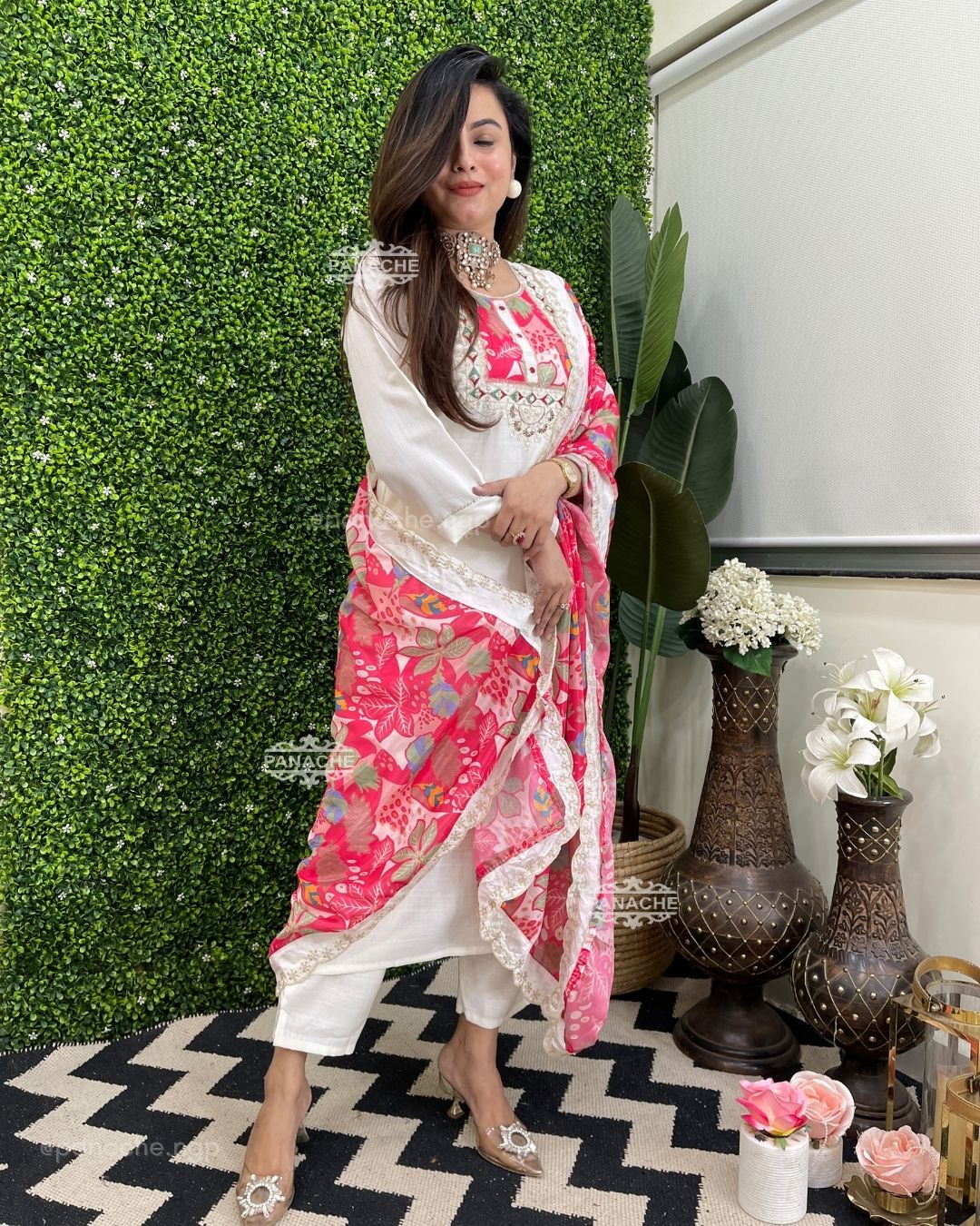 🟣 Appliqué neckline of kurta, lace on dupatta, beautiful print on dupatta