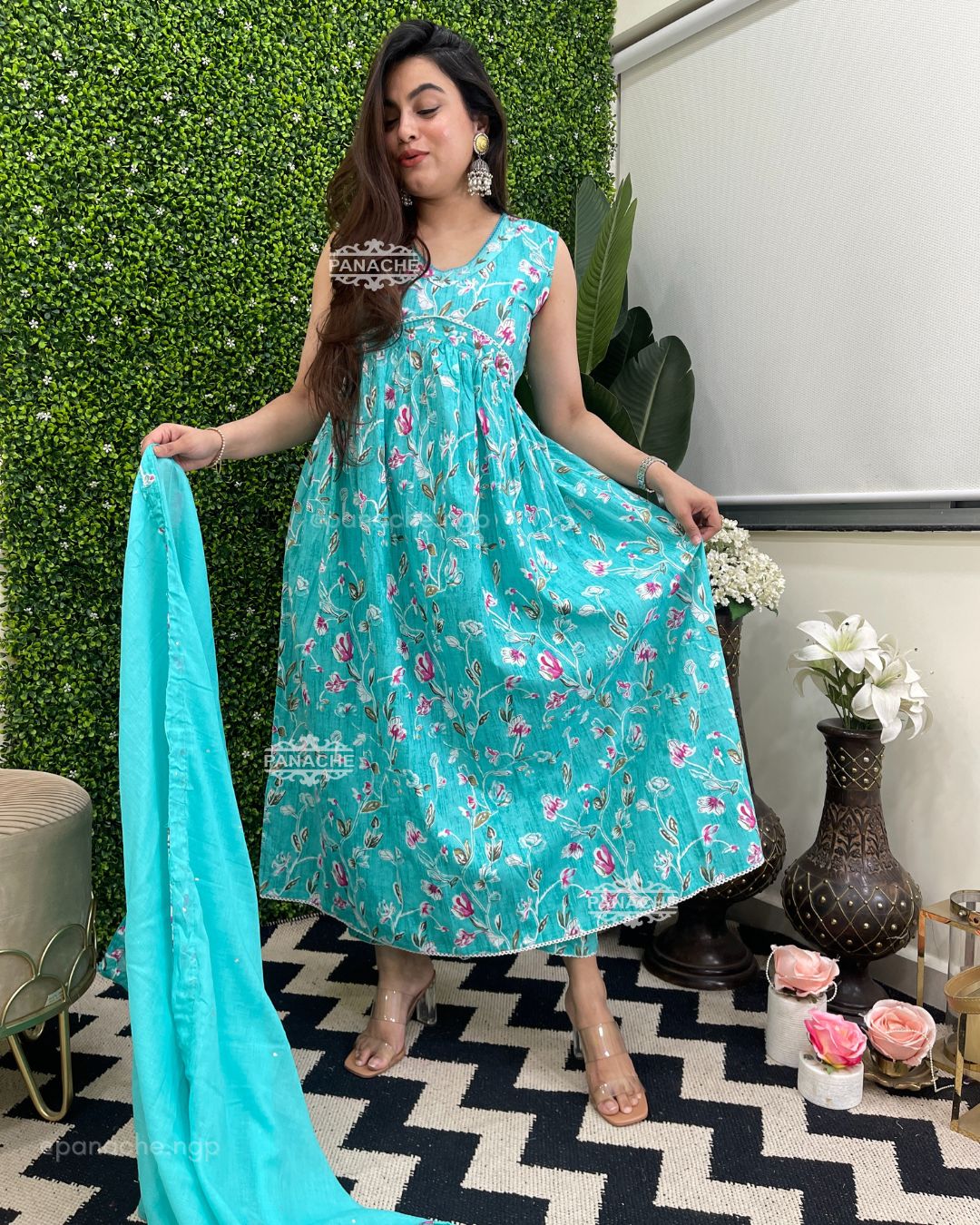 🟣 A mul cotton floral print Alia neckline with print on print and style and plain mul dupatta fabric - mul cotton
