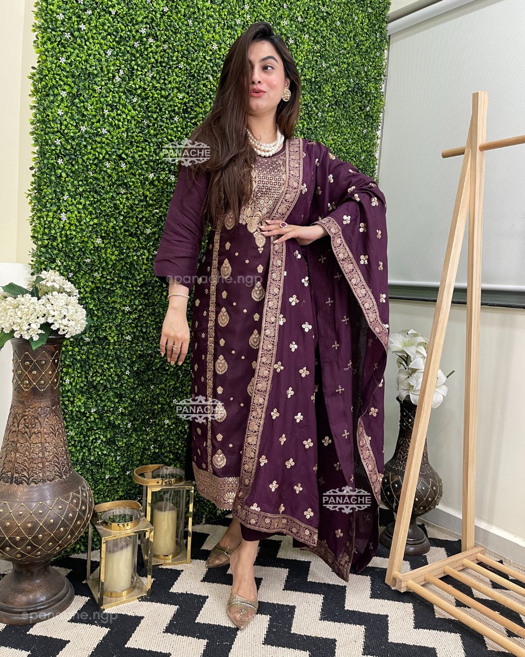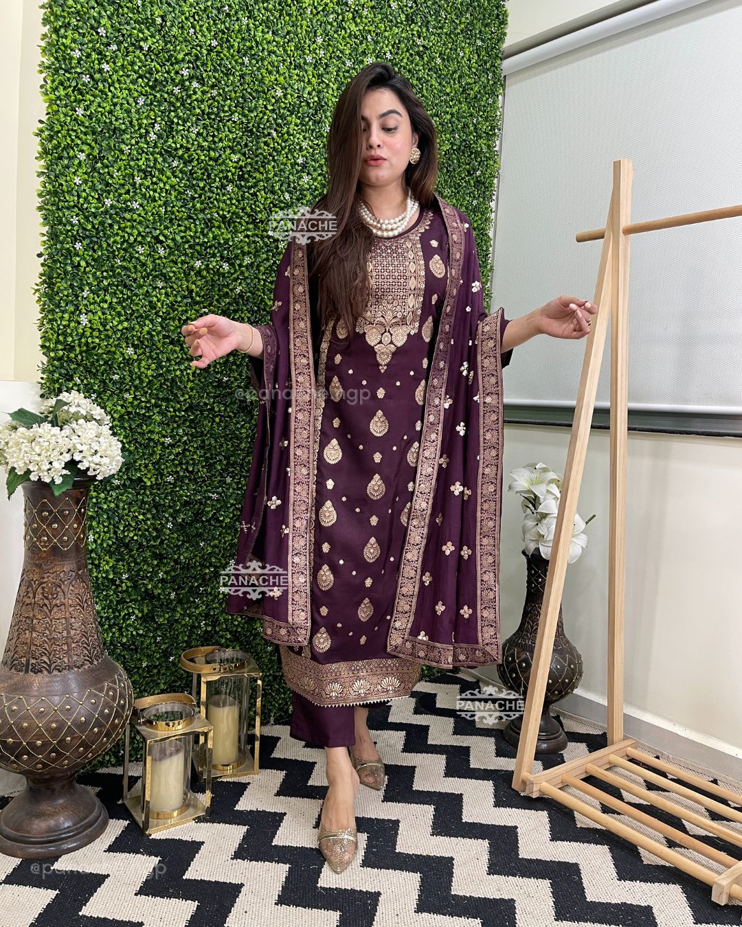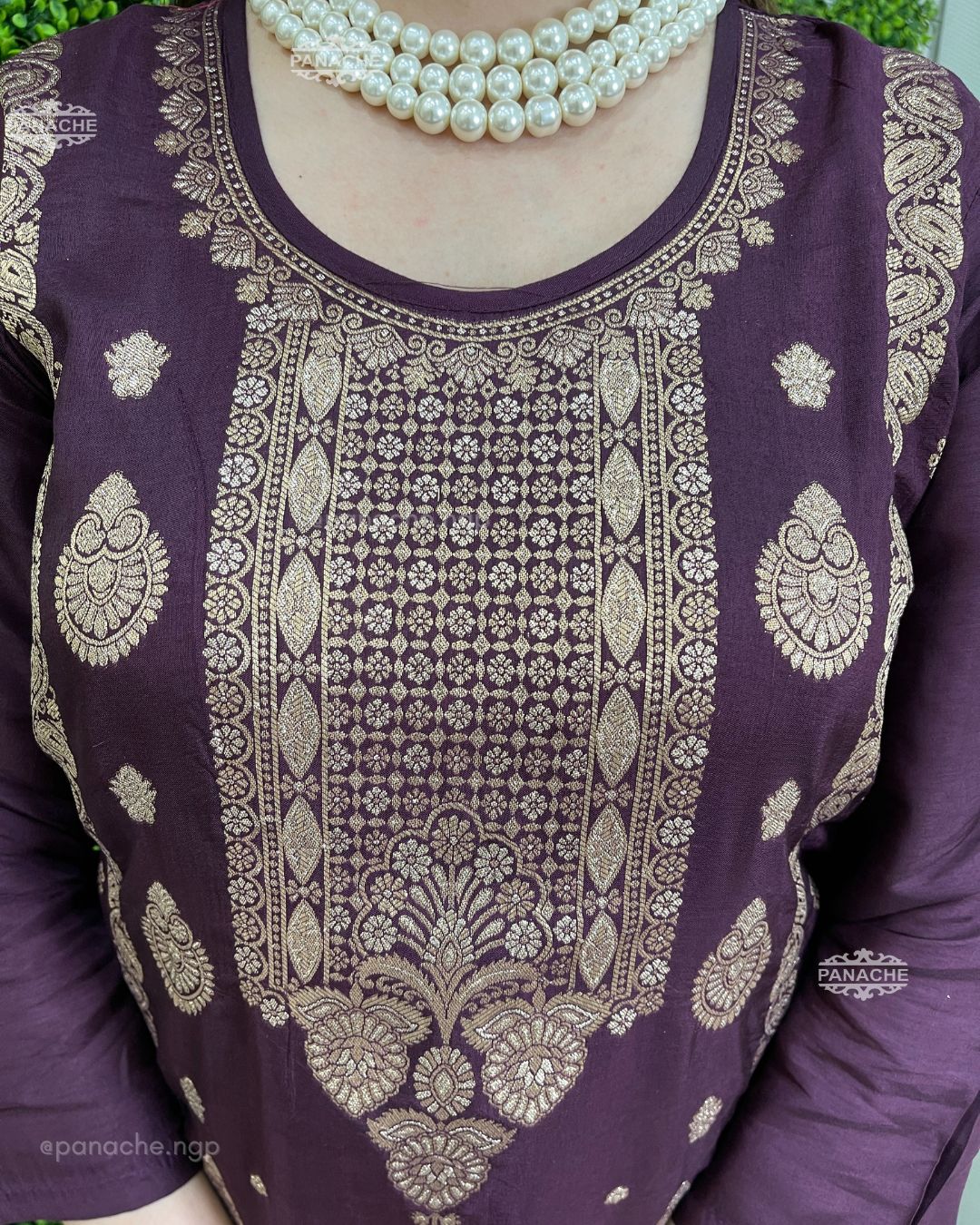 🟣 Zari banarsi neckline jaal kurta daman, sequin handwork on dupatta with zari borders