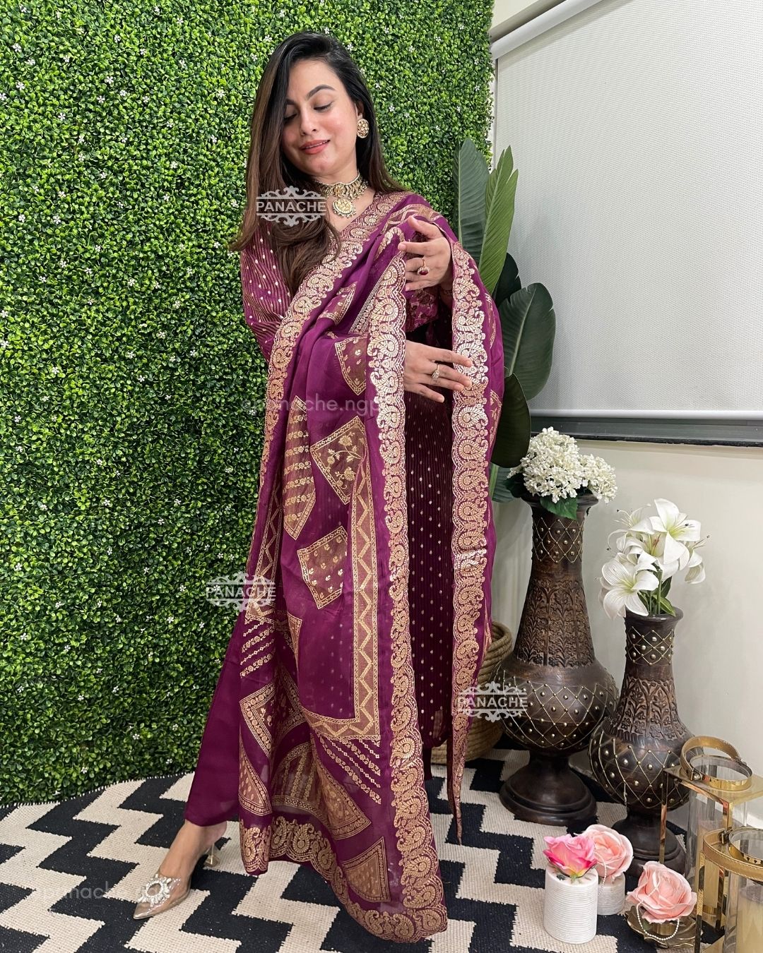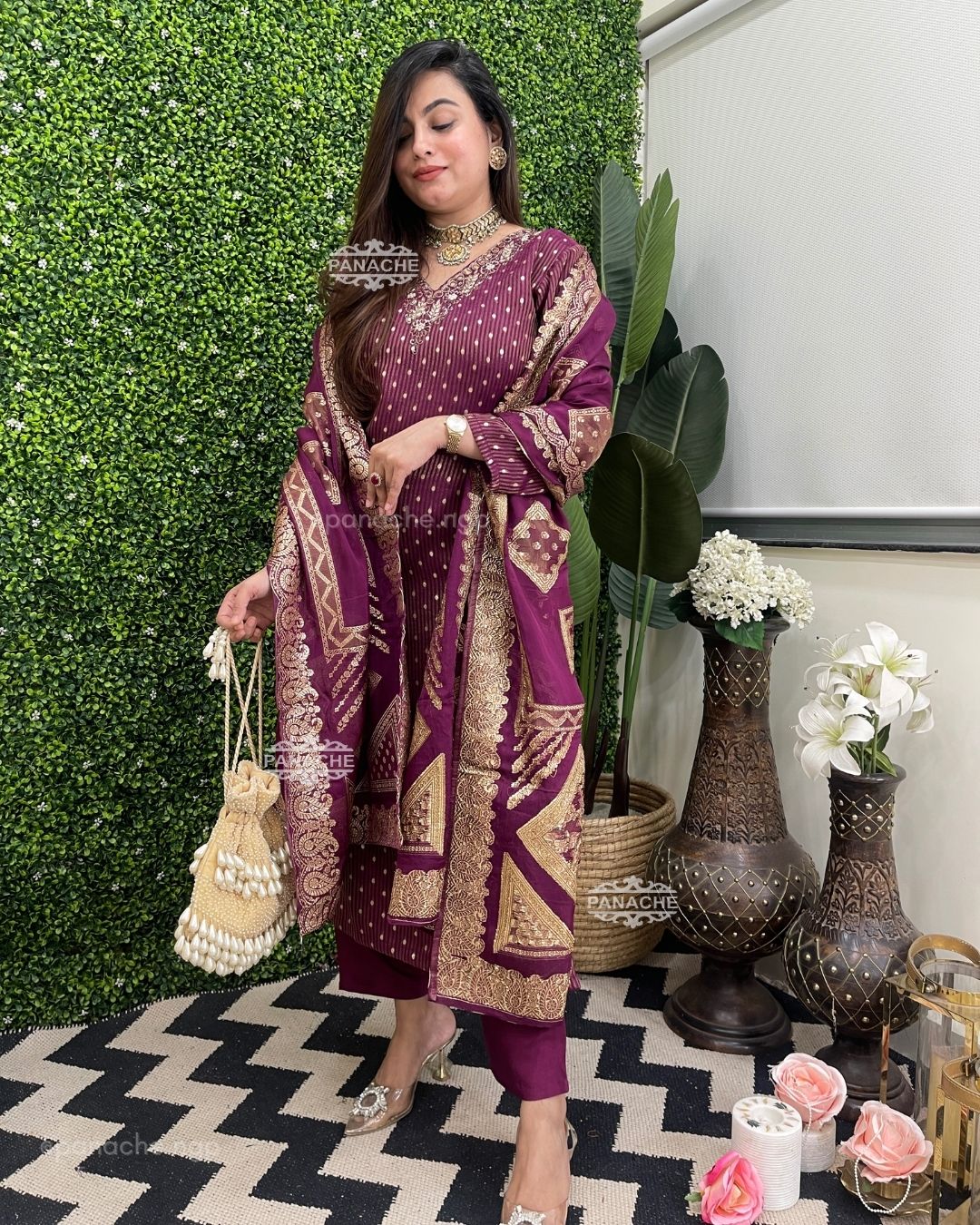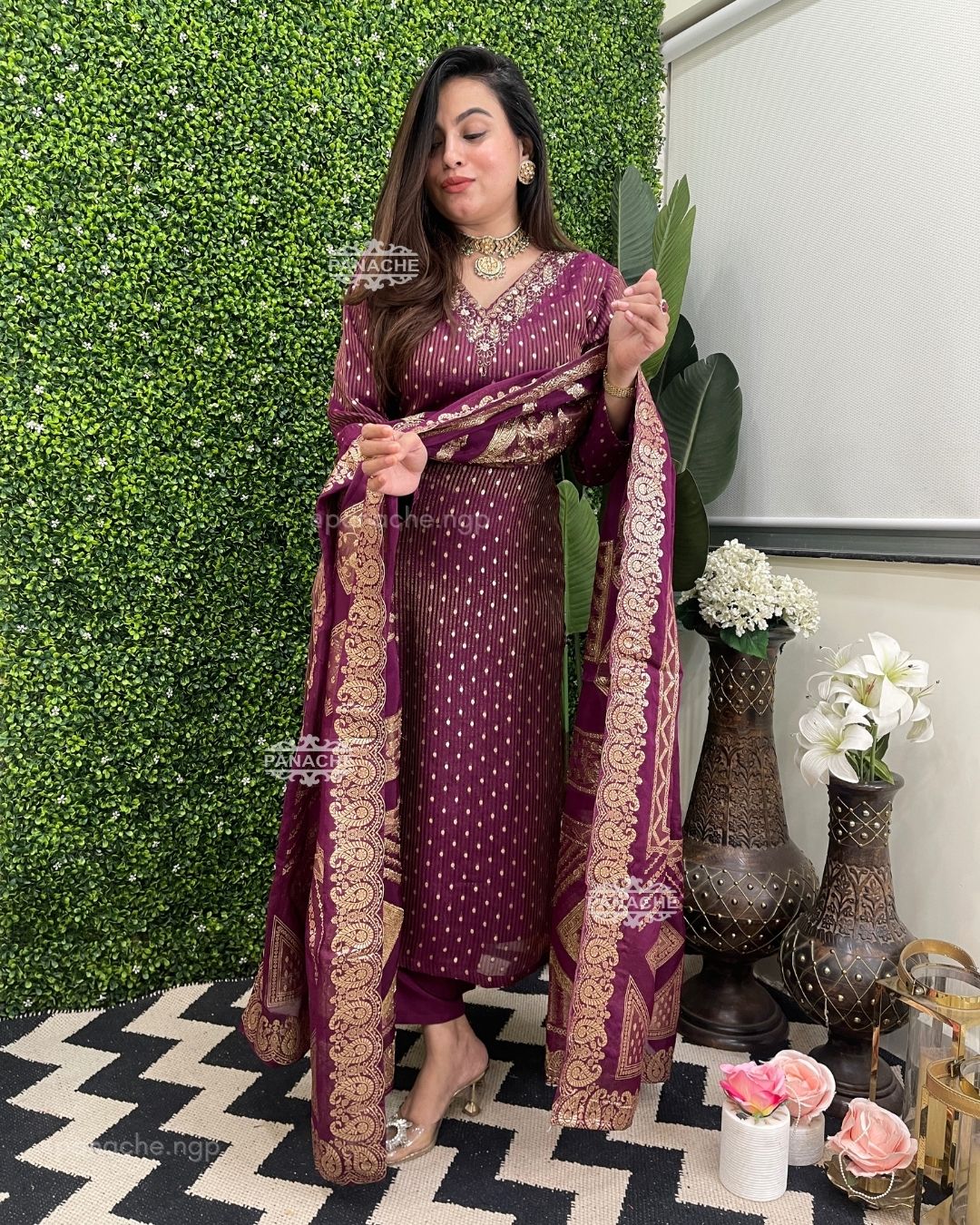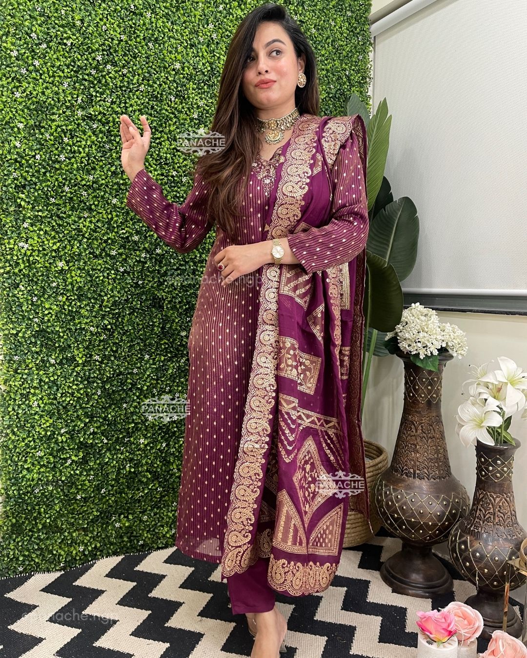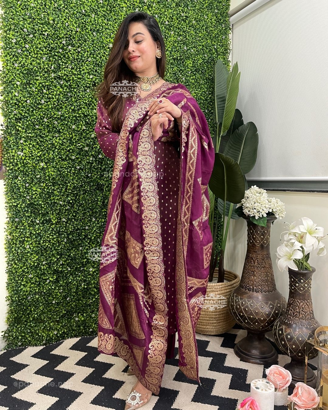 🟣 Banarasi buttas and a zari dupatta in since tone dhupchao, zardoz handwork on neckline and a beautiful dupatta