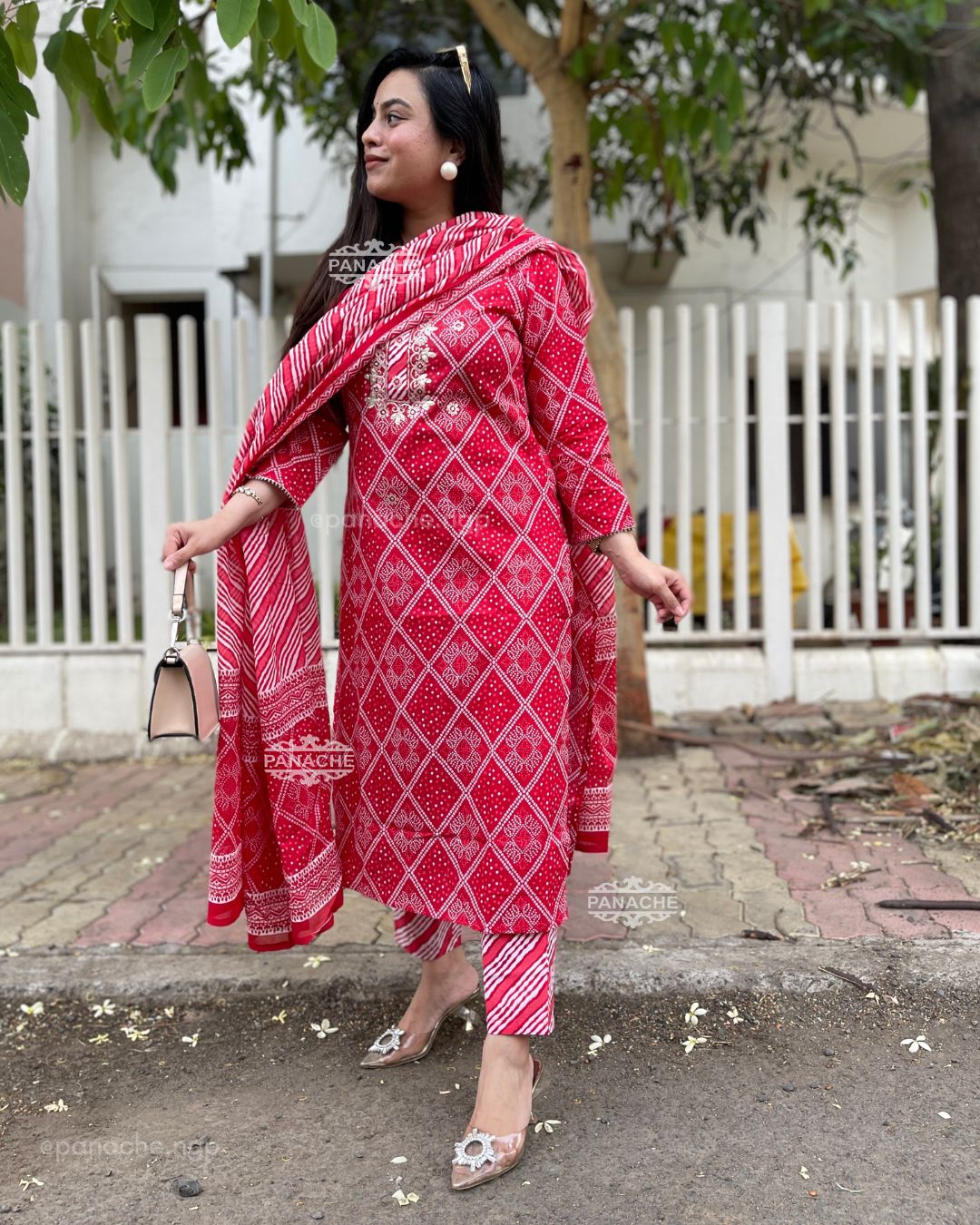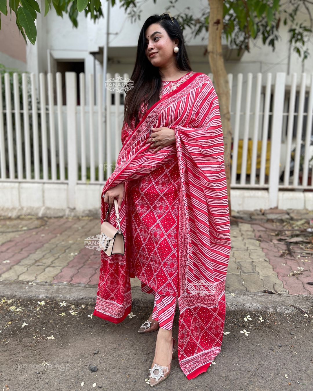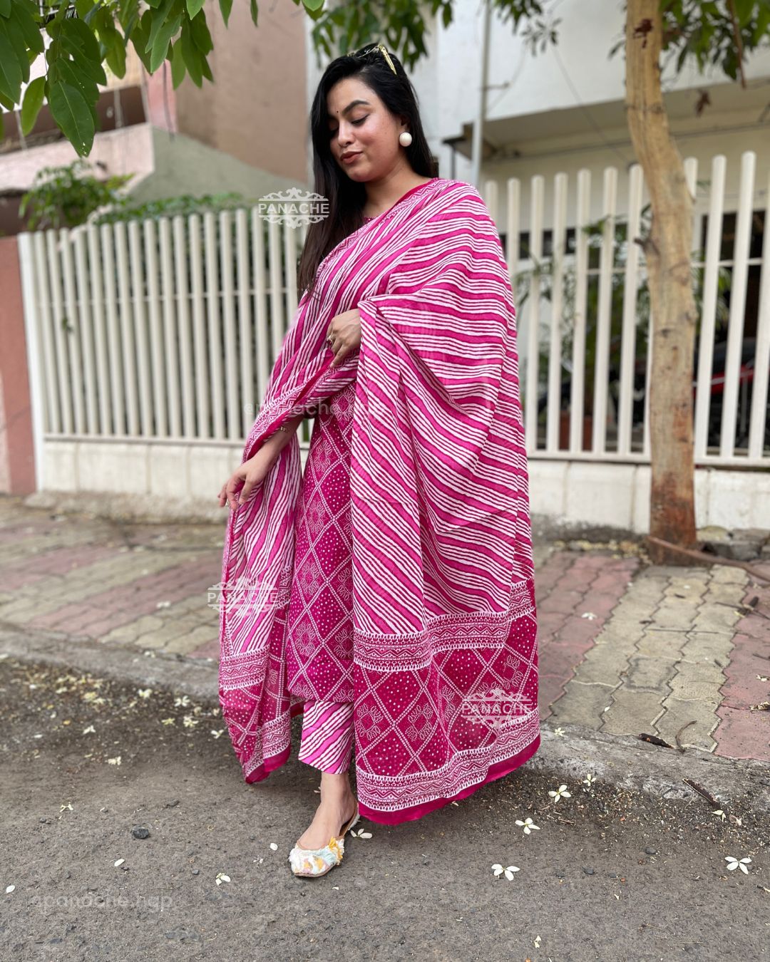 🟣 Gota neckline with every green Bandhani and leheriyan prints