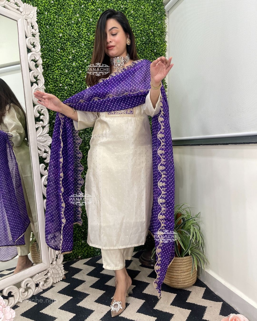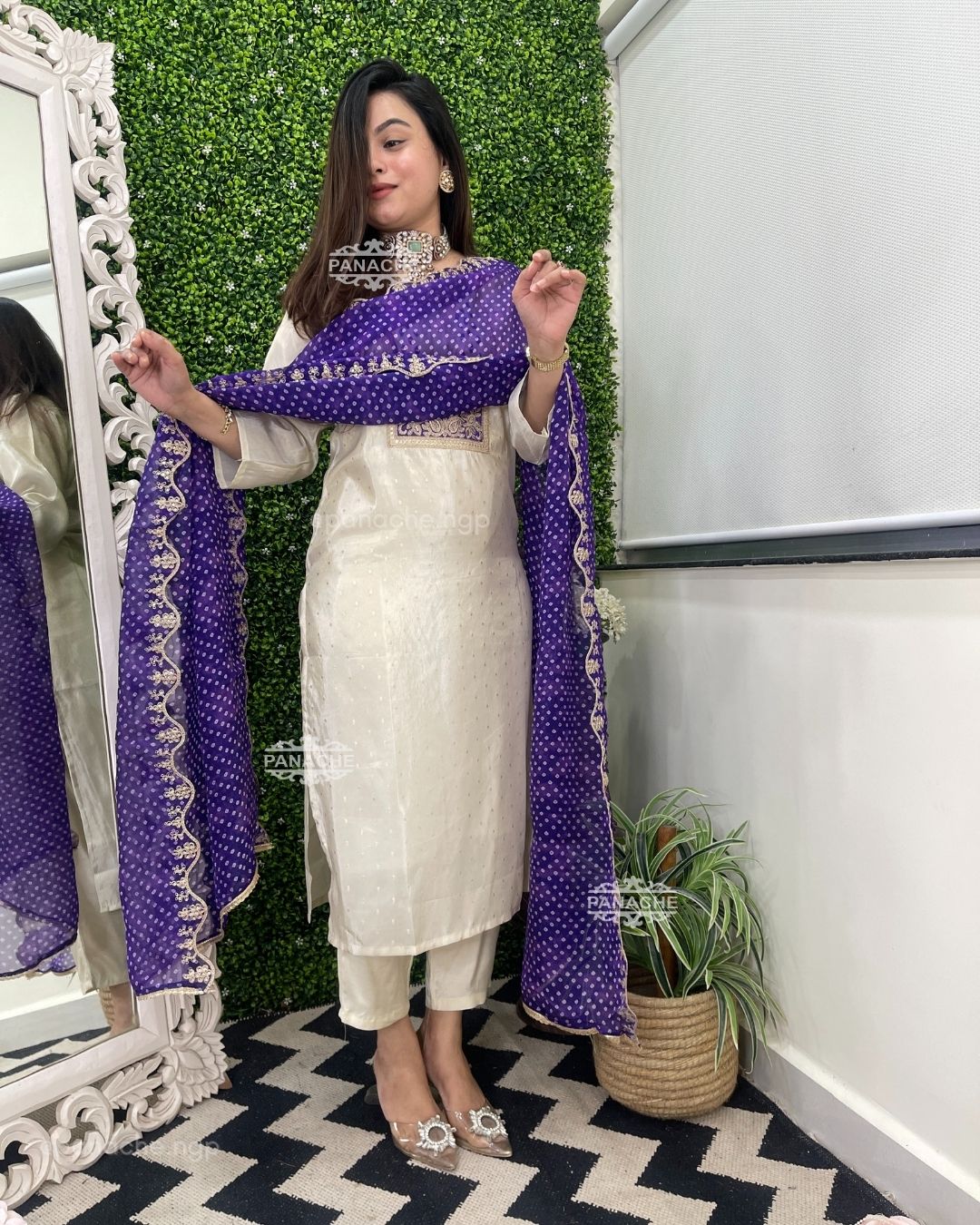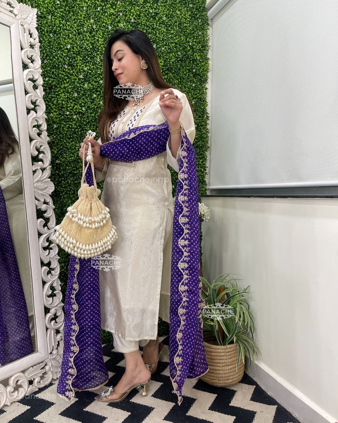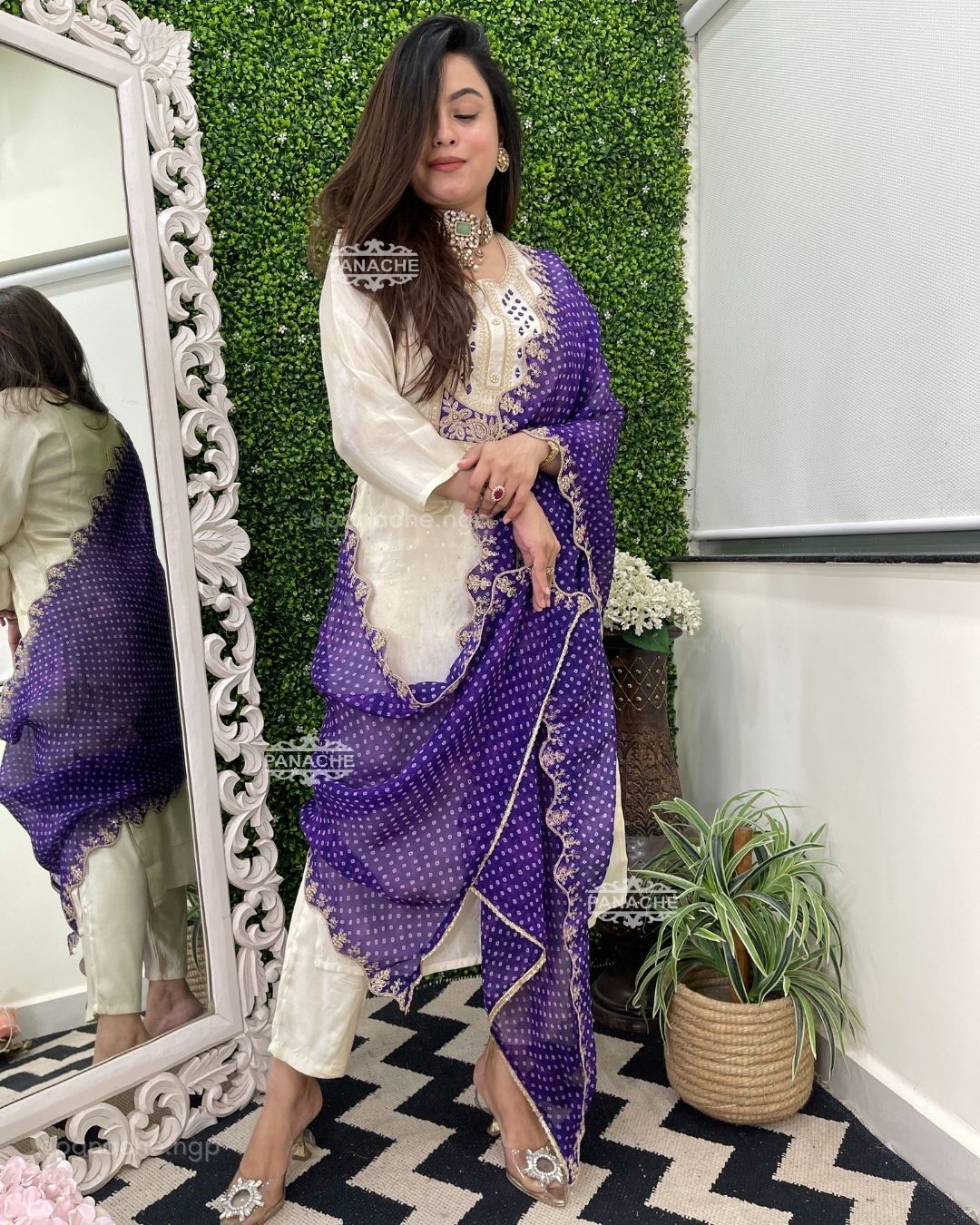 🟣 Hand and applique Work on neckline of kurta with small buttas all over and scalloped bandhani dupatta