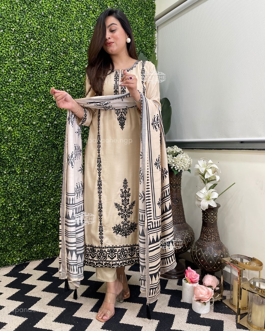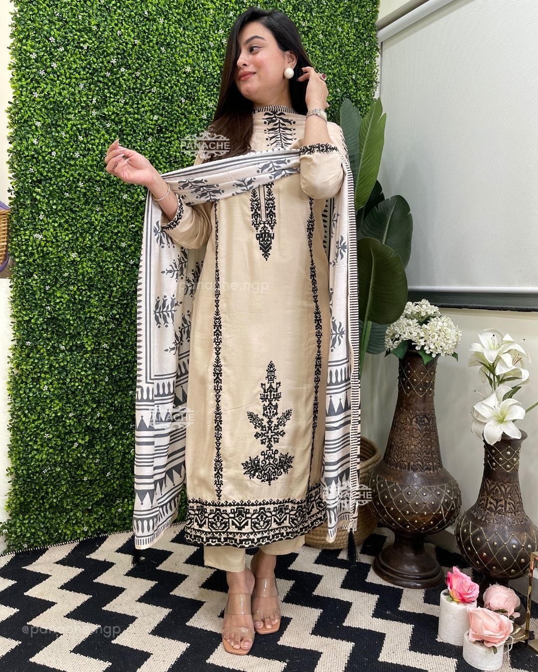 🟣 All over thread embroidery and a beautiful printed dupatta with tassels