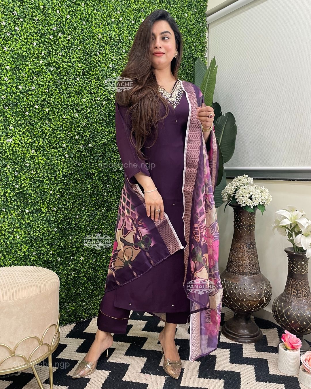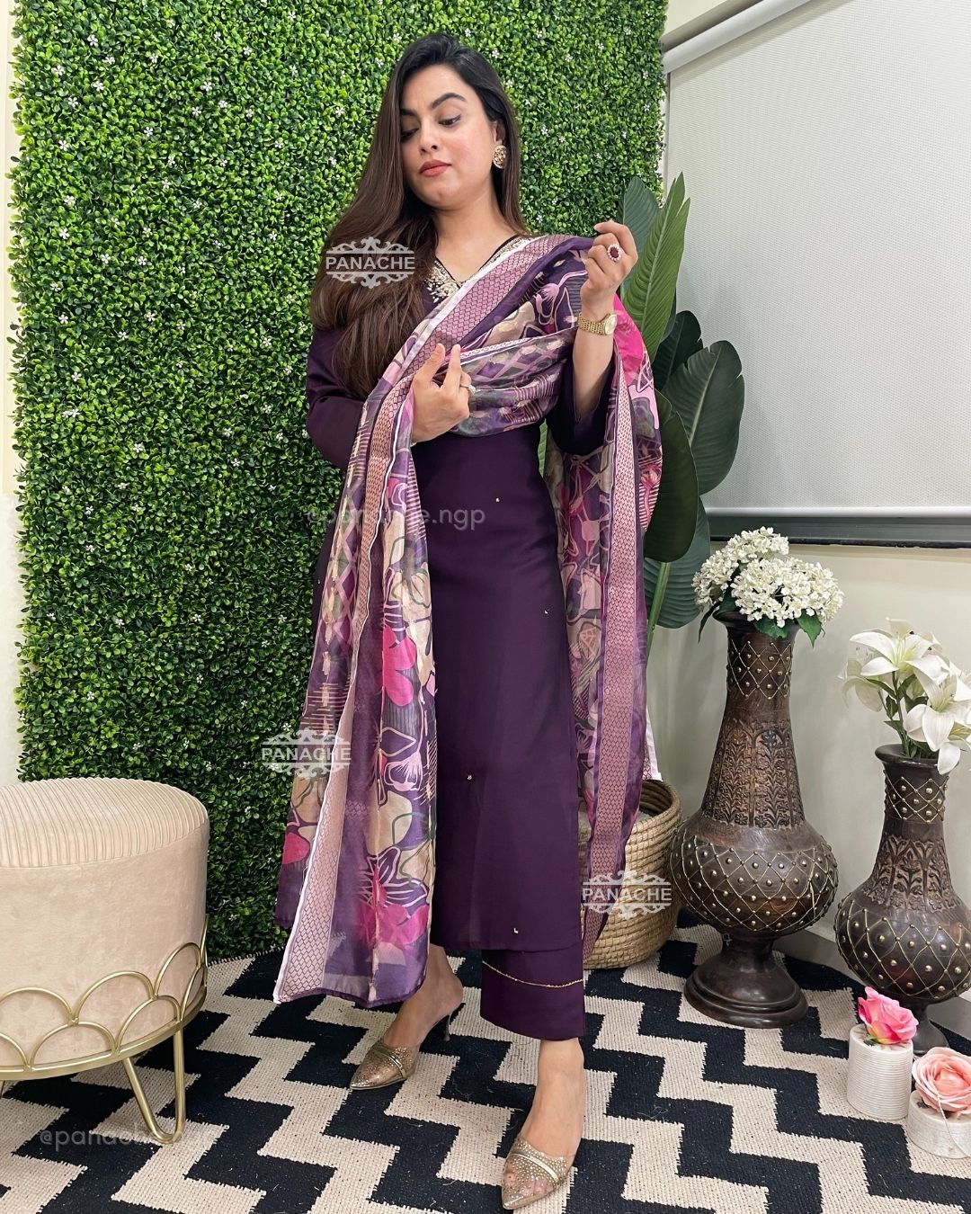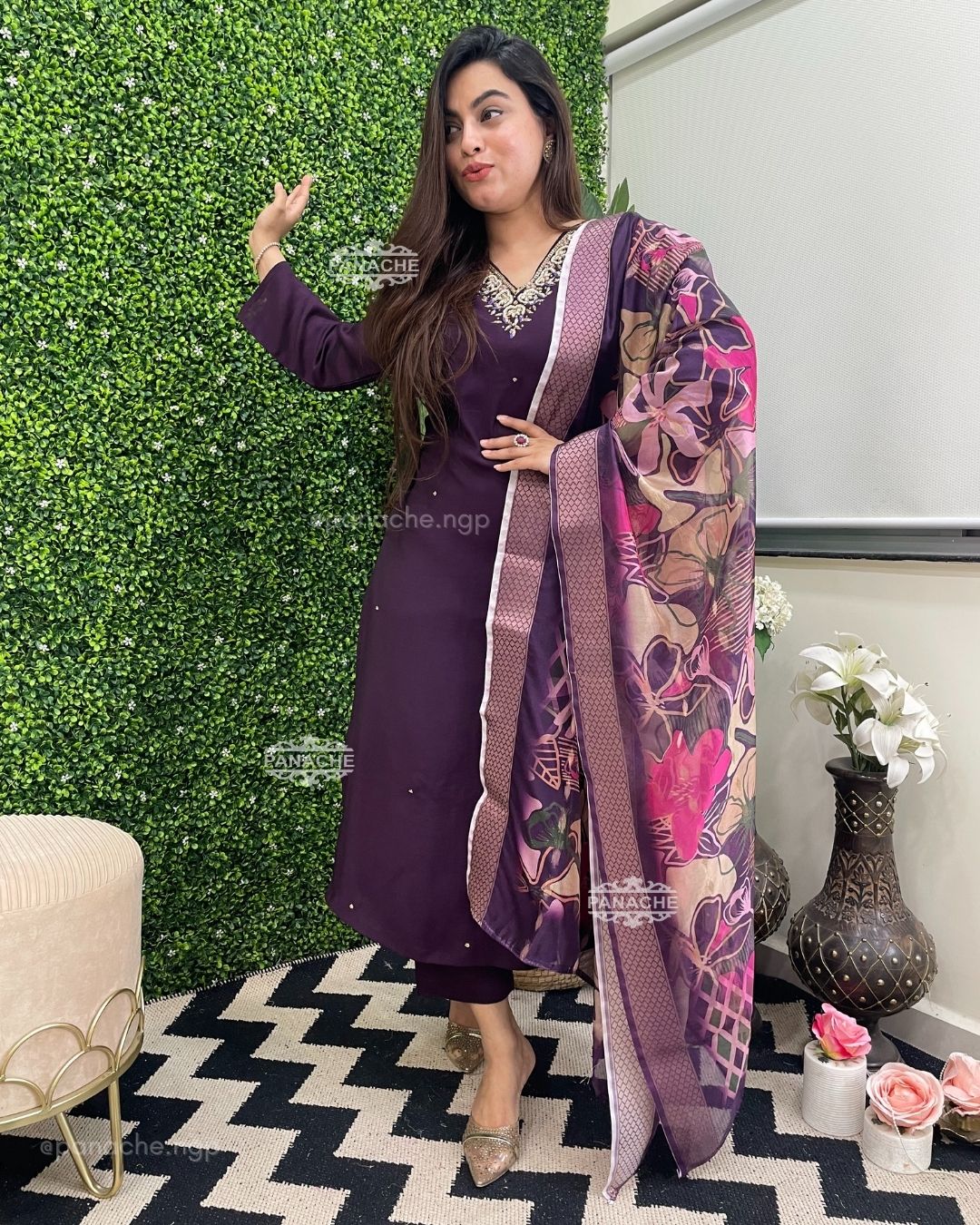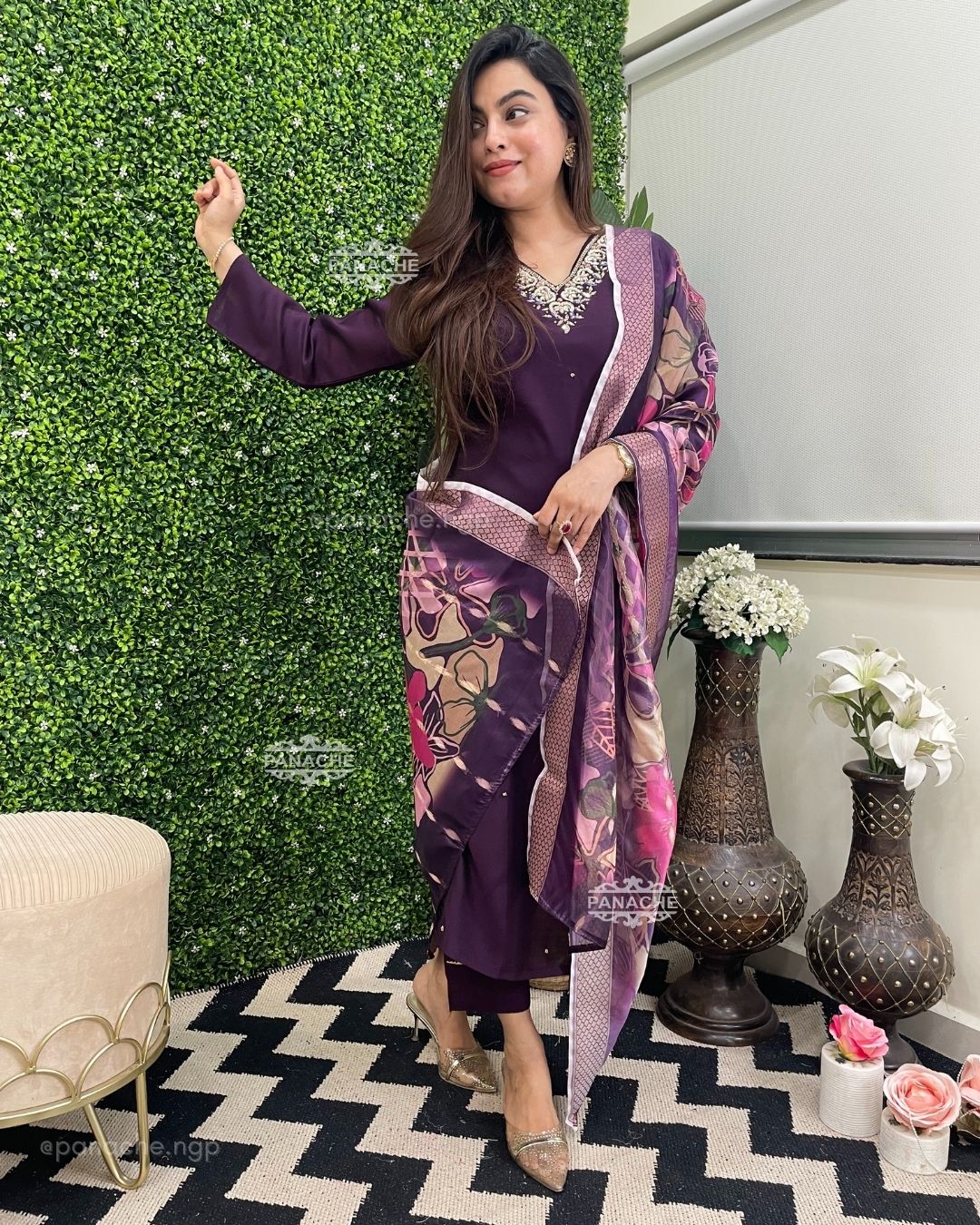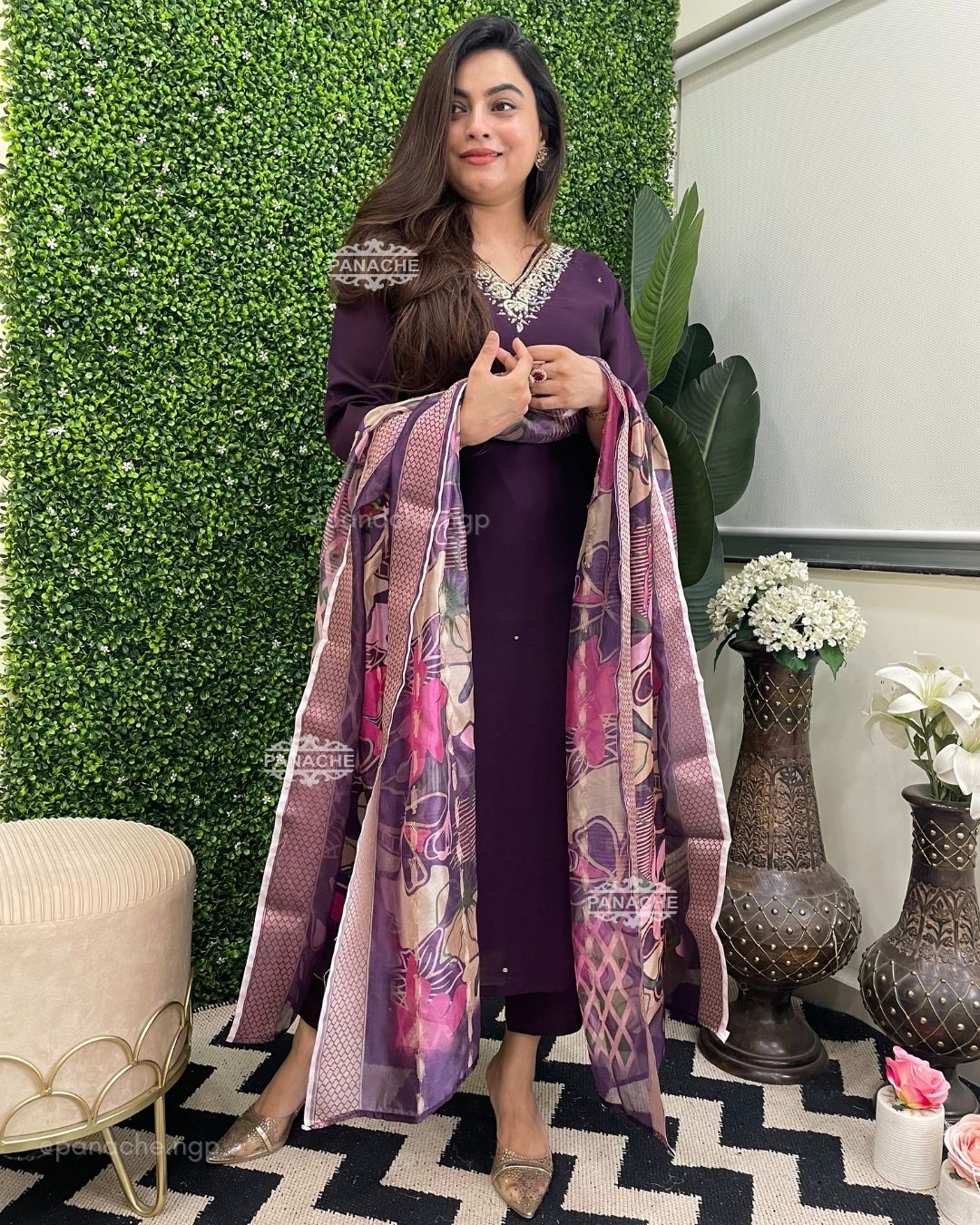 🟣 Slightly festive in its color and a vibrant dupatta with handwork v neckline