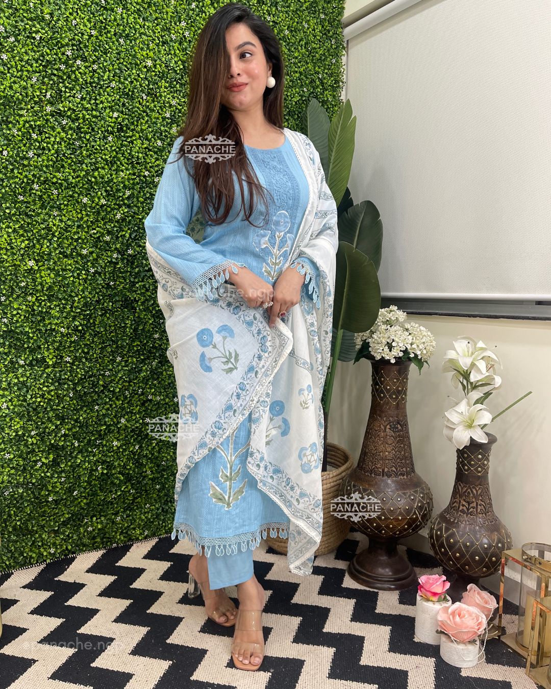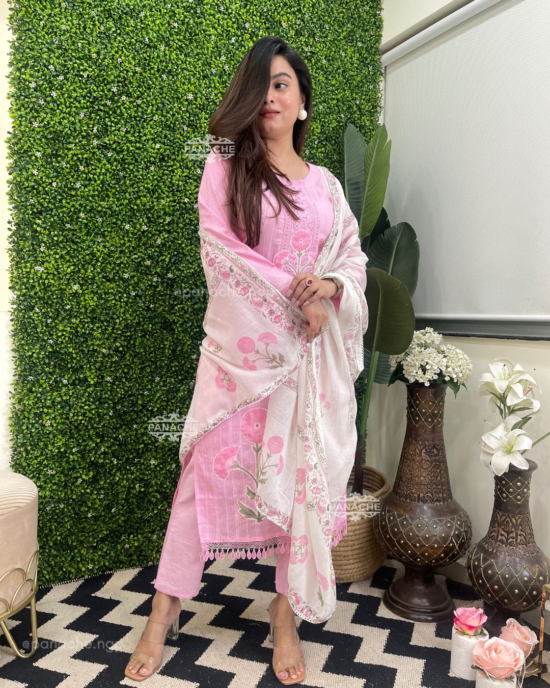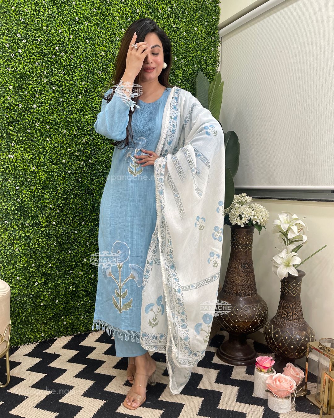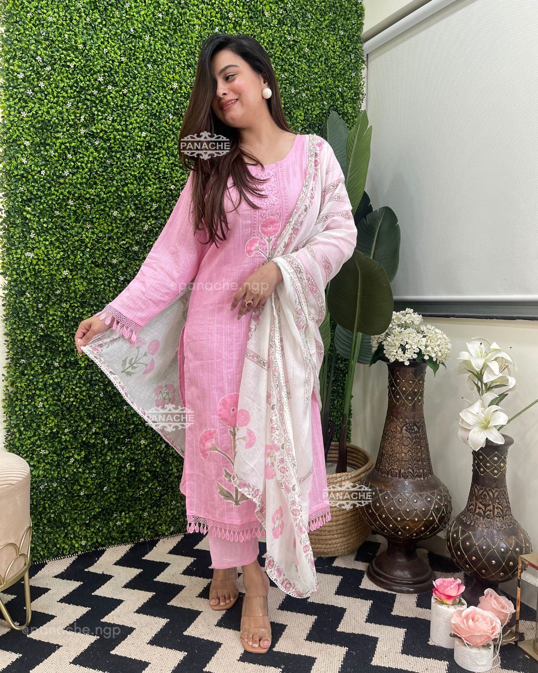 🟣 Cotton sets in lovely colours with appliqué flowers and printed dupatta, lace details on sleeves and daman of kurta