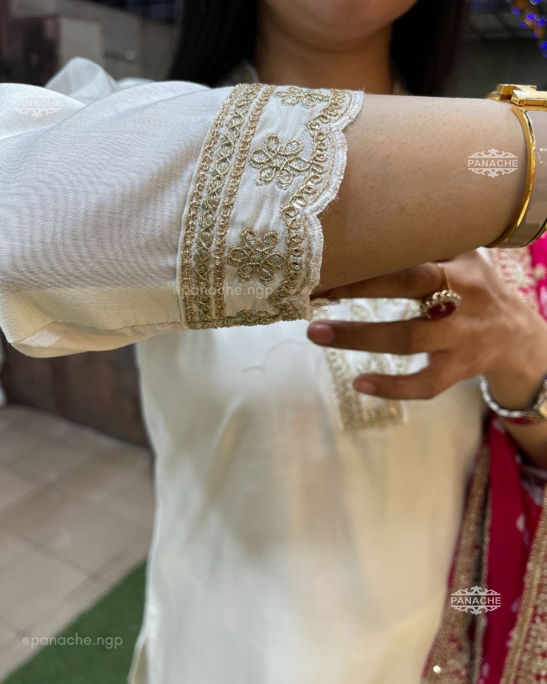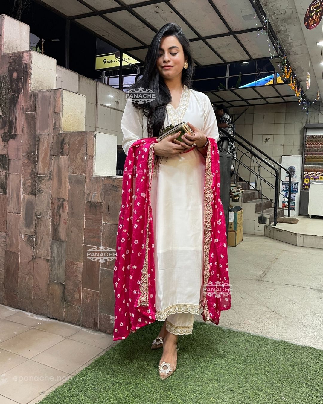 🟣 A embroidered V neckline and lace on sleeves daman of kurta and pants Border on bandhani dupatta