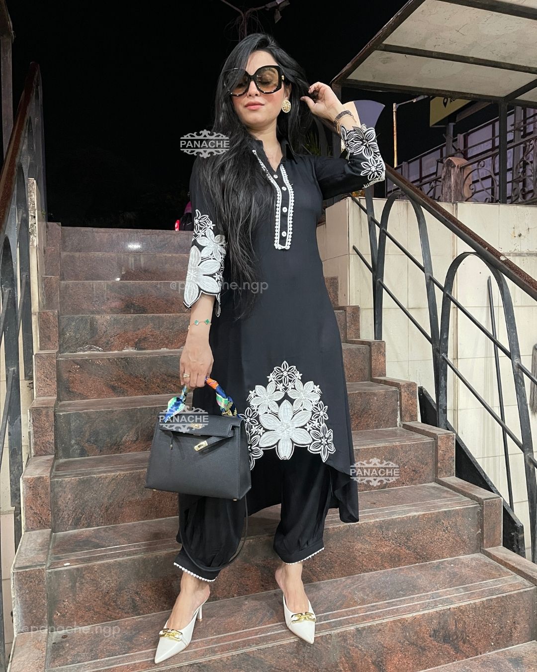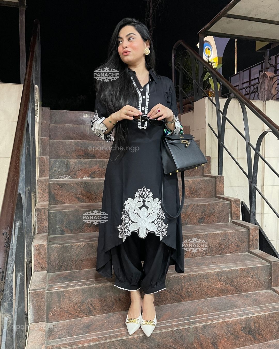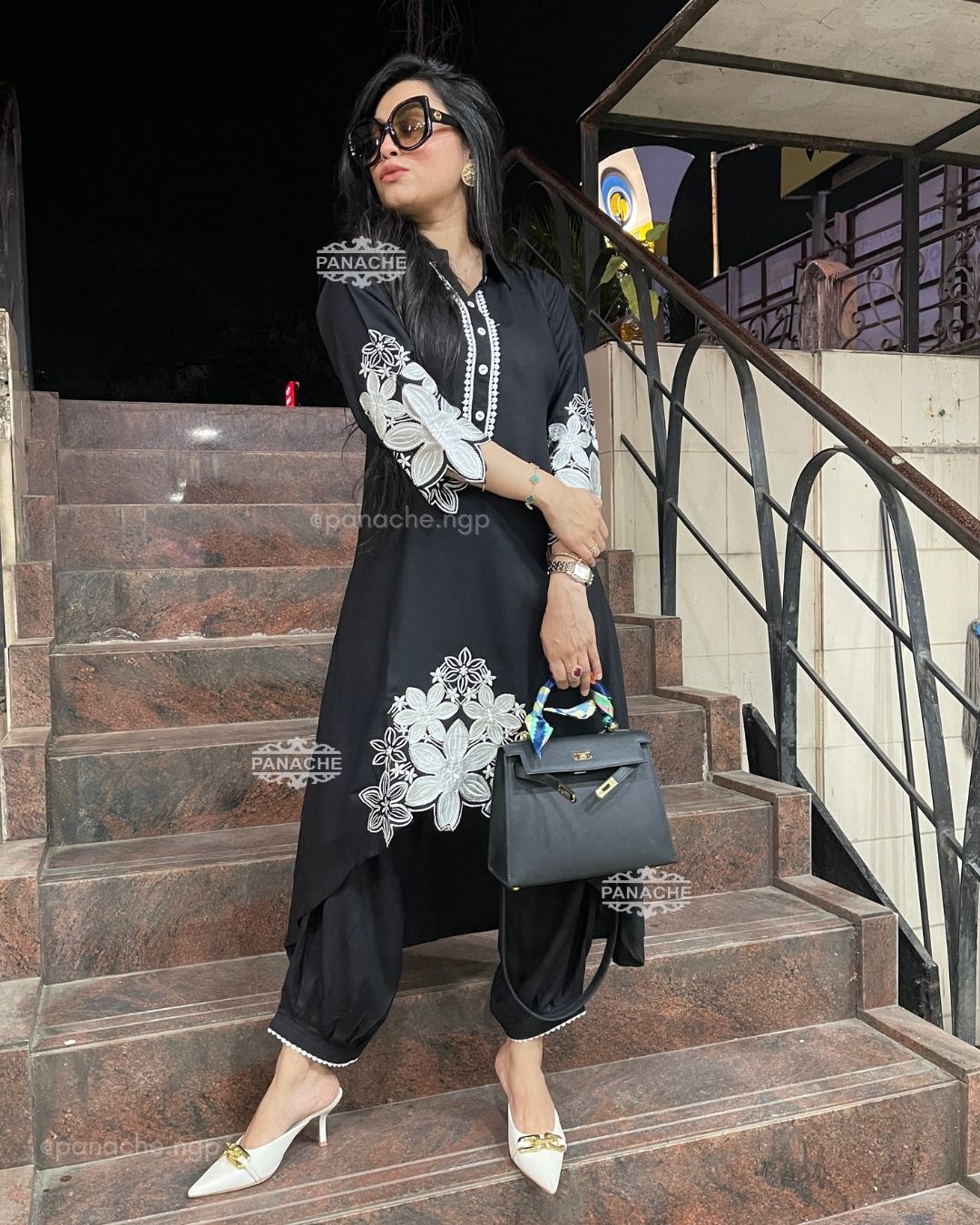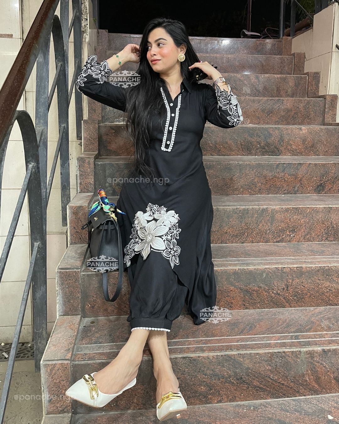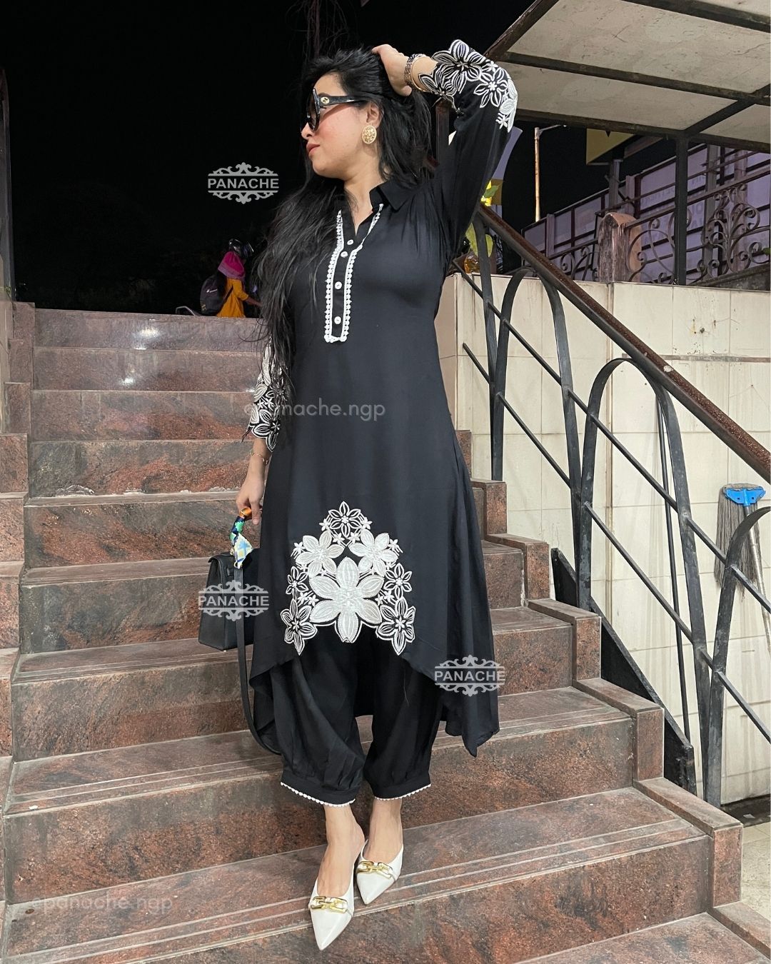 🟣 Monochromes are always in! Full black with Crosia details and cutwork on asymmetrical kurta and cutowkr sleeves with Afghani pants is super comfy