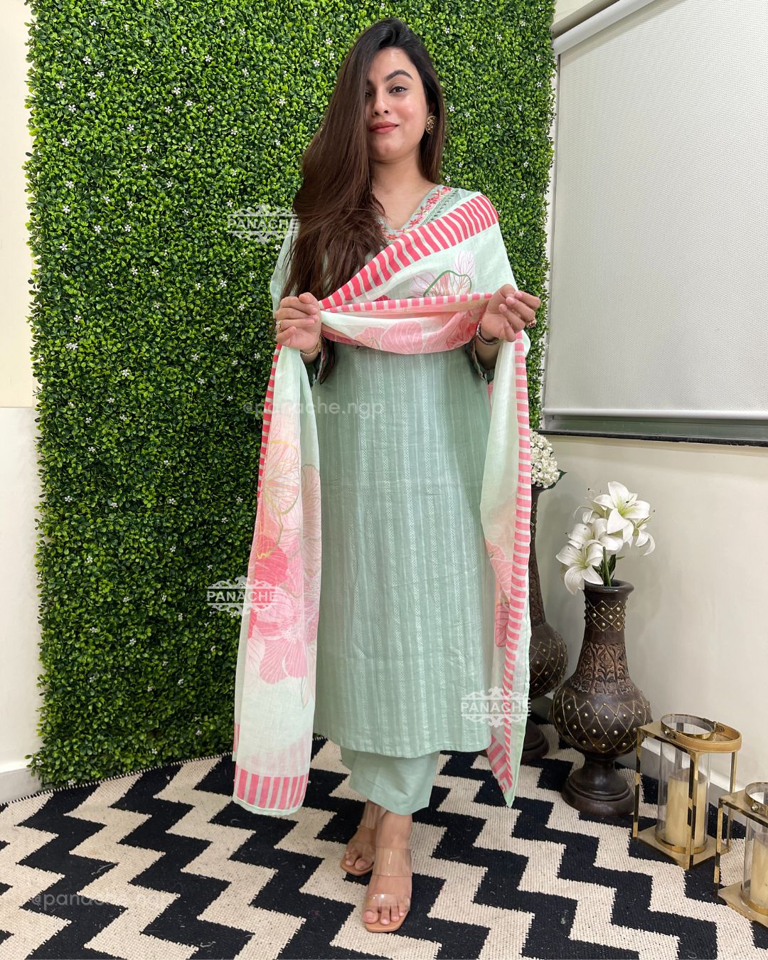 🟣 Self-print kurta with plain pants and a dupatta rich with elegant flowers