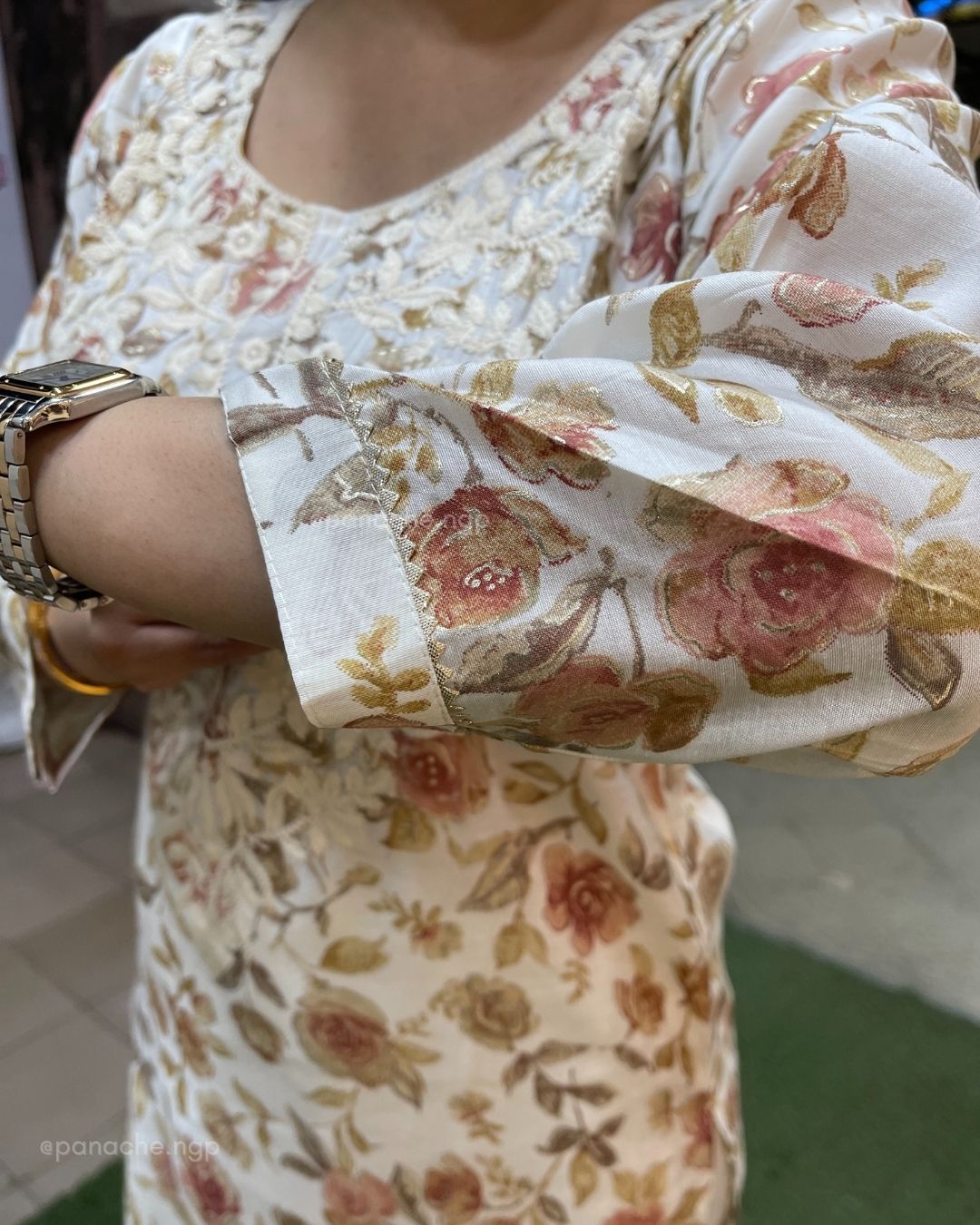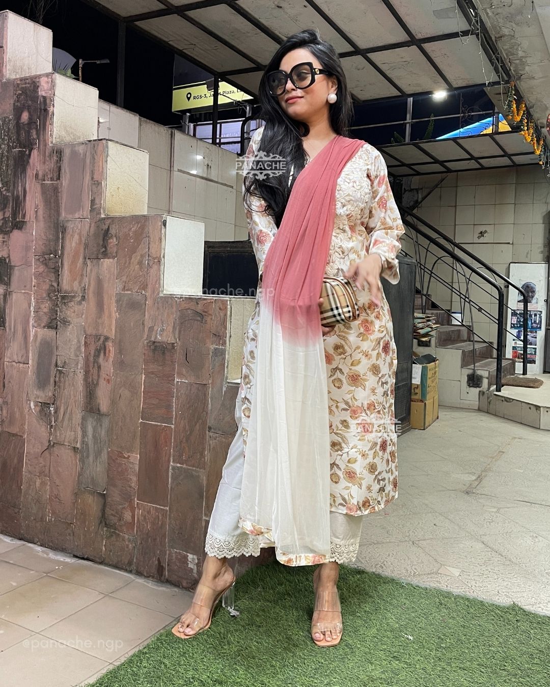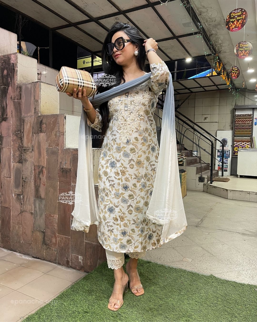 🟣 Dabka embroidery on floral kurta neckline with lace on pants daman and shaded dupatta with printed borders