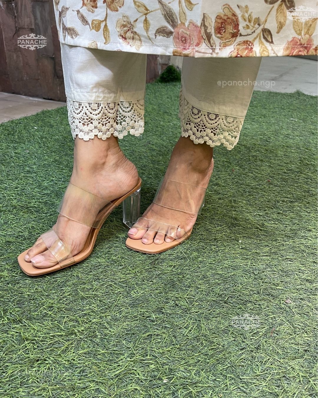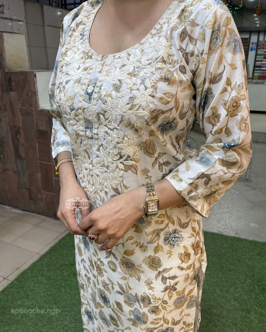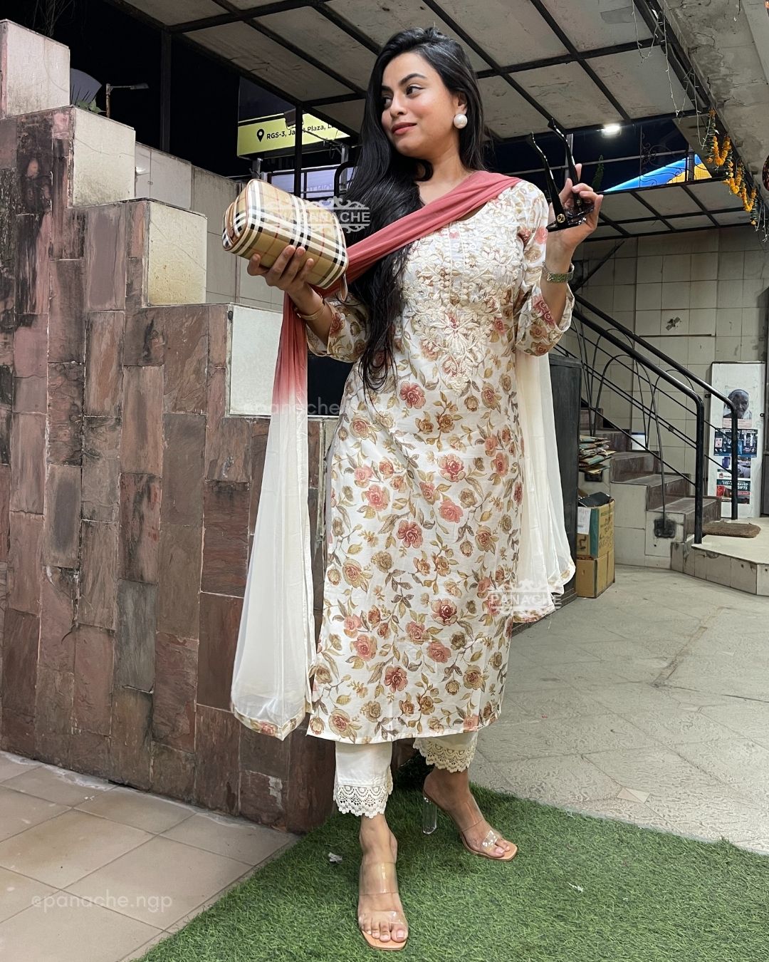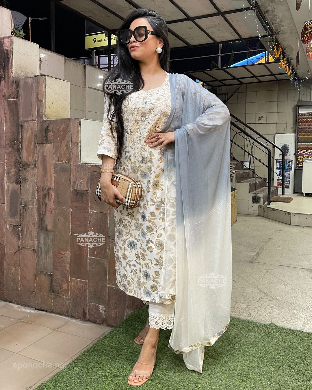 🟣 Dabka embroidery on floral kurta neckline with lace on pants daman and shaded dupatta with printed borders