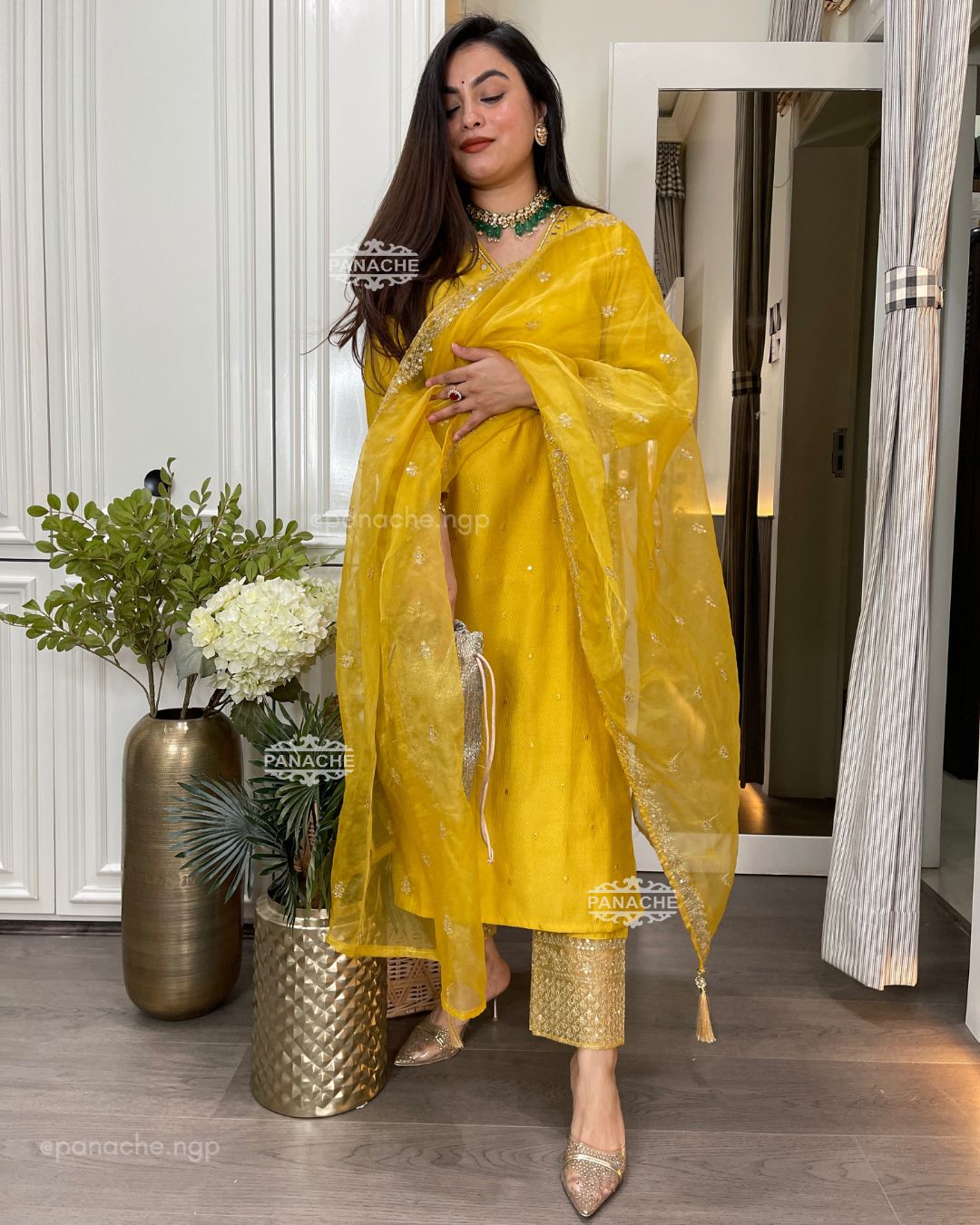 🟣 Mirrored neckline on self fabric with detailed sleeves, pants and a percent dupatta to match