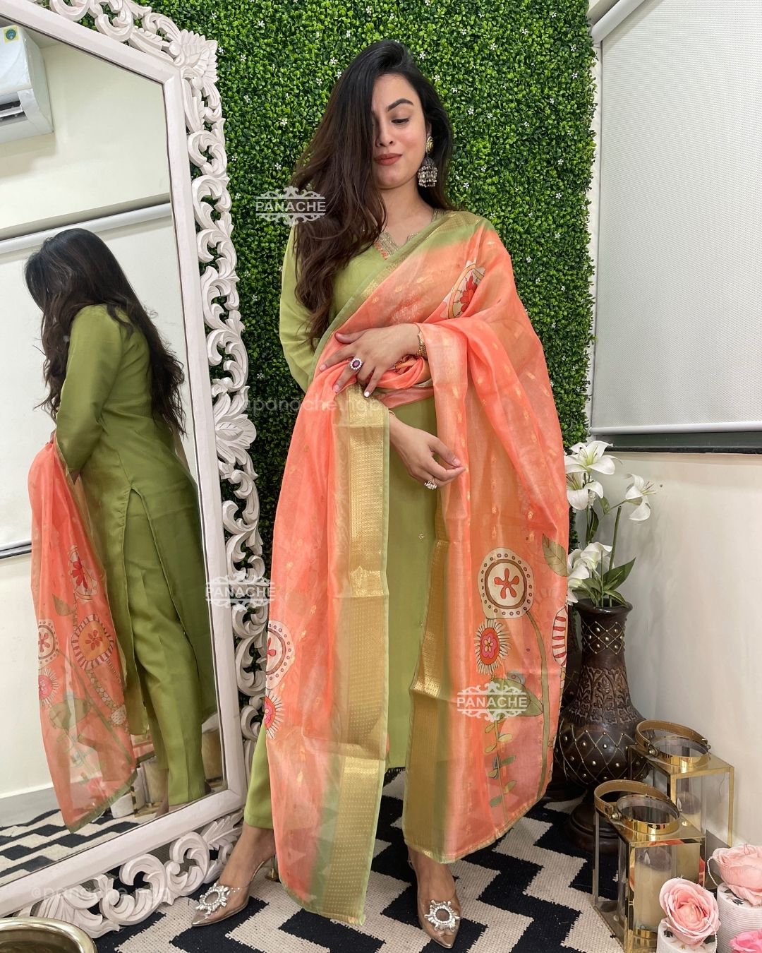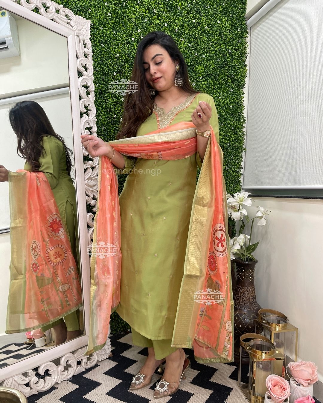 🟣 A subtle neckline with contrasts and a heavy dupatta with borders