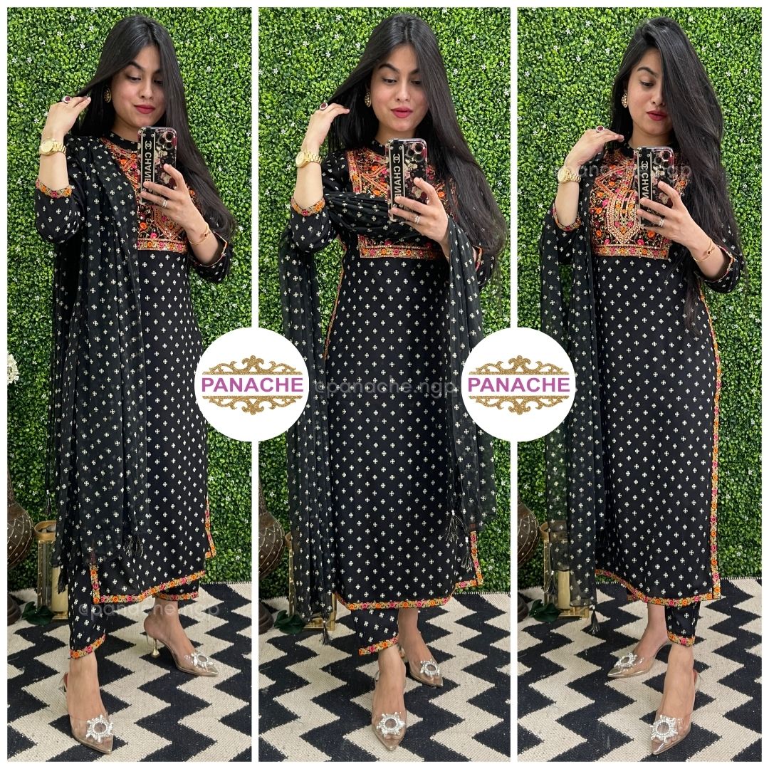 🟣 Print on print kurta pant set with high slit embroidery borders with embroidery on yolk and pants daman with stand collar in kurta and tassels on dupatta