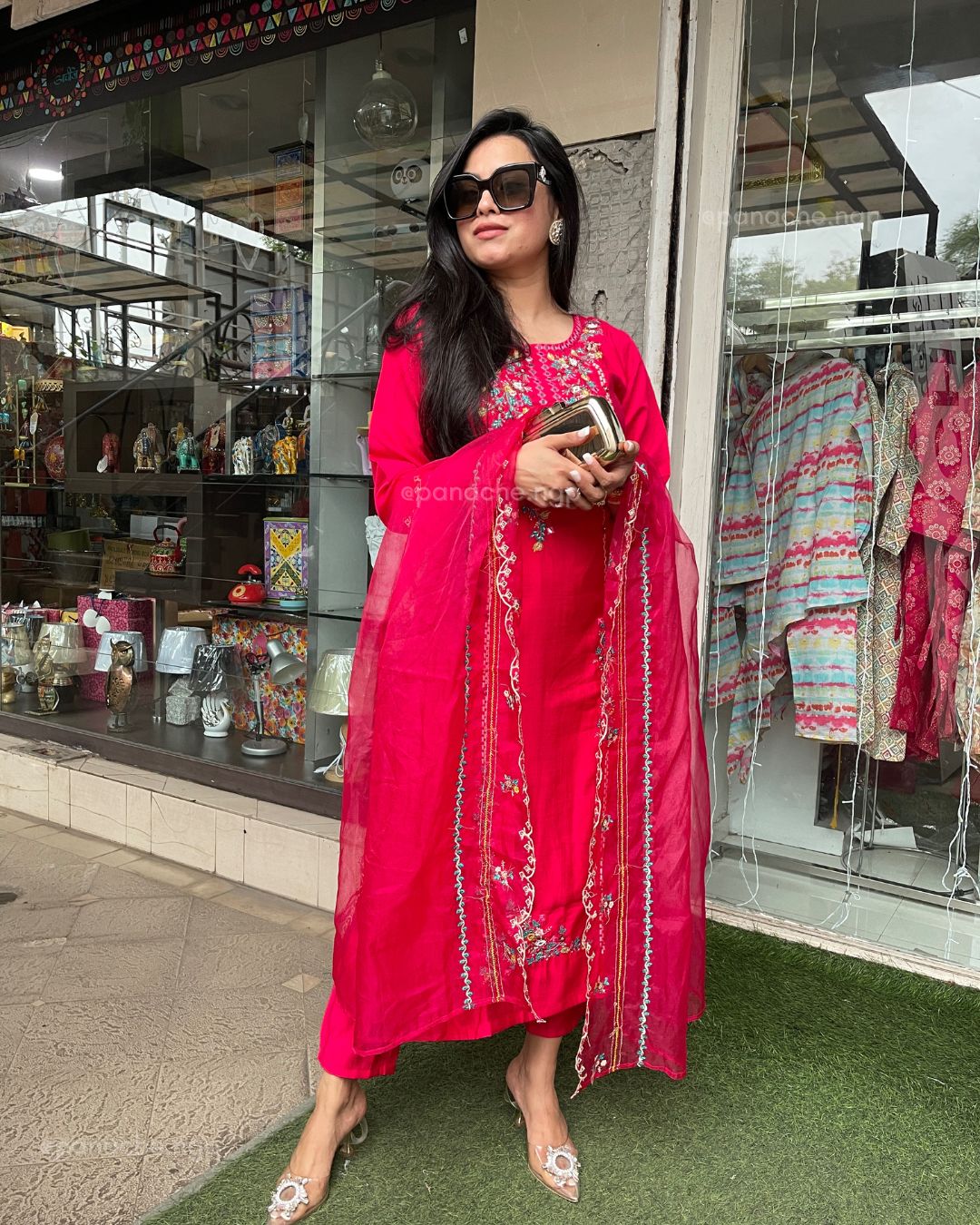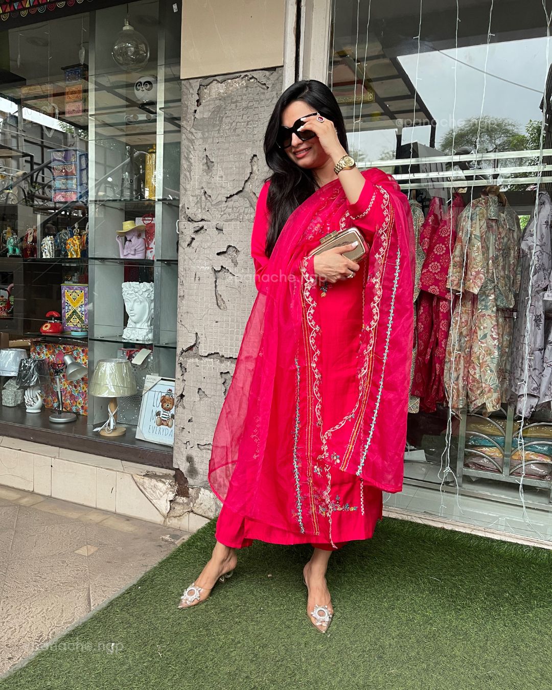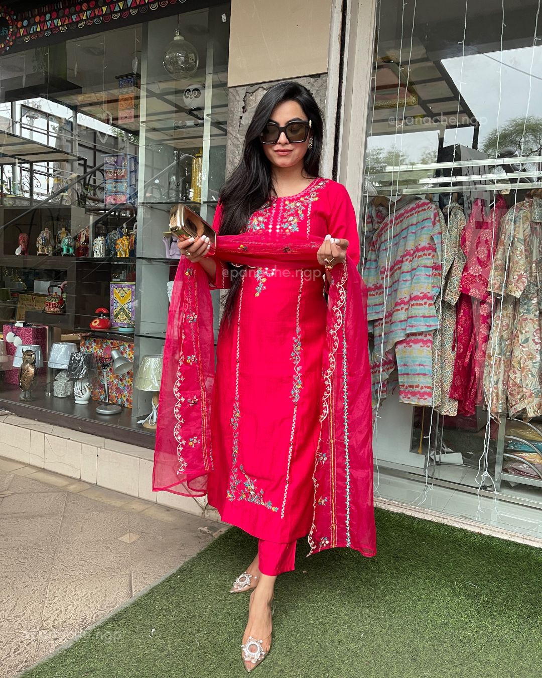 🟣 Embroidery on kurta yolk , sleeves , and dupatta scallop one side with more embroidery details on 2nd side