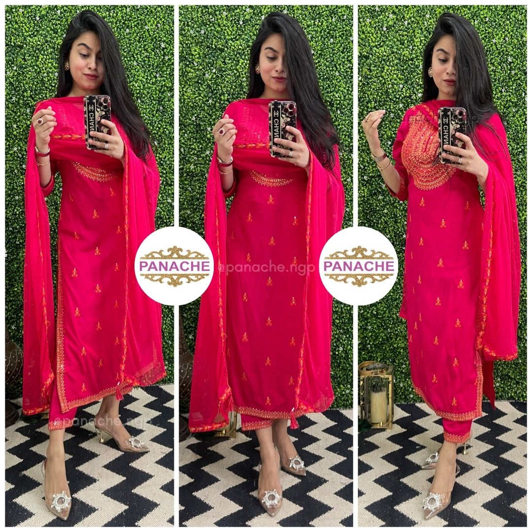 🟣 Details - Orange embroidery in neckline of kurta with buttas all over, daman of kurta, all sides border on dupatta, and daman of pants