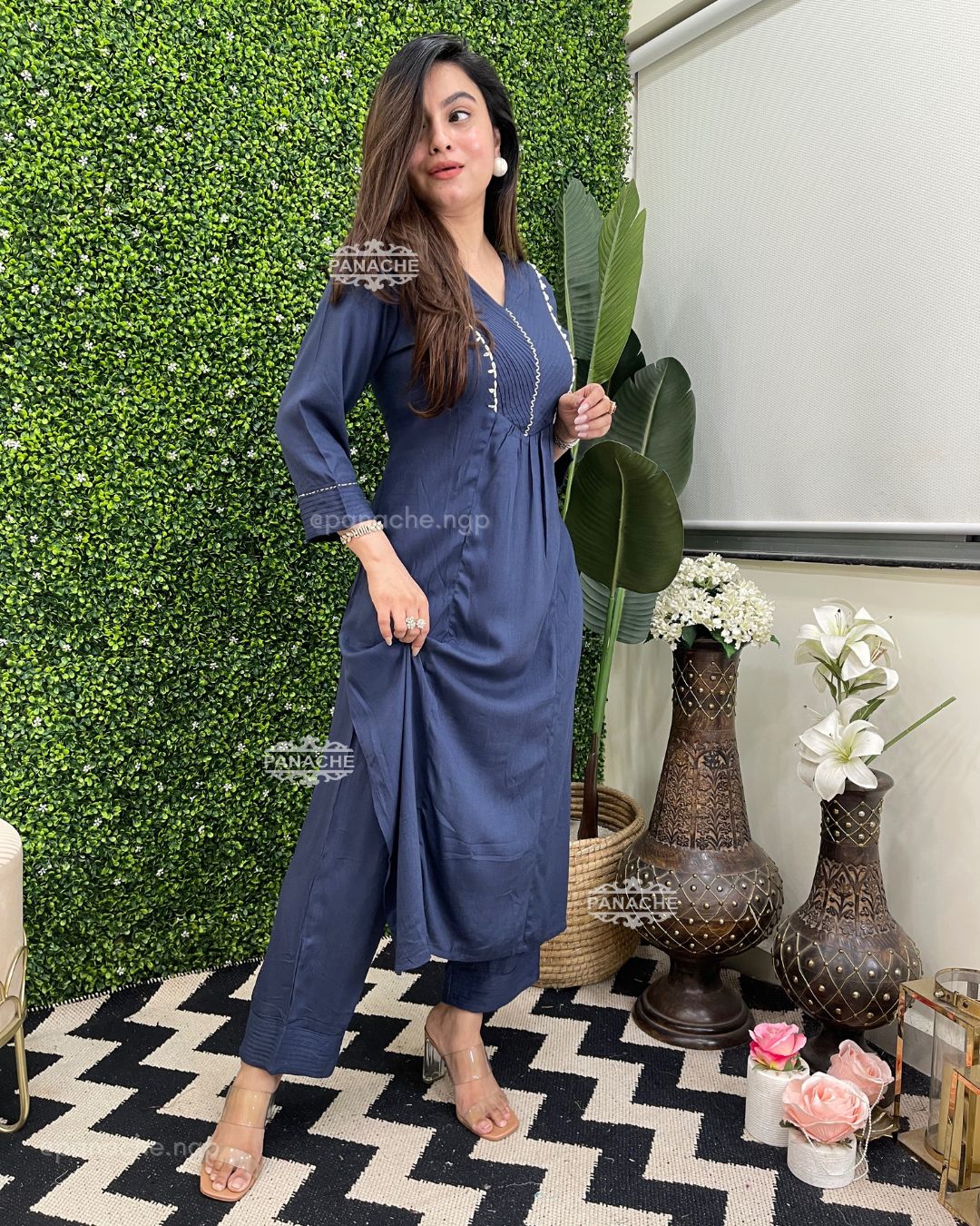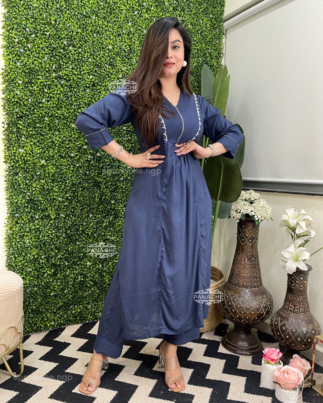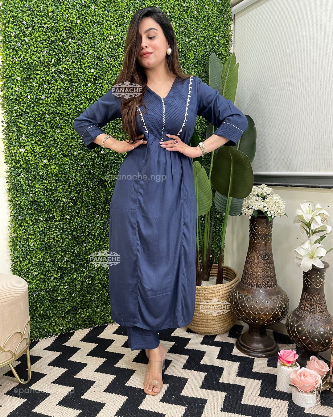 🟣 A cowled pattern kurta with thread work and pintucks on yolk
