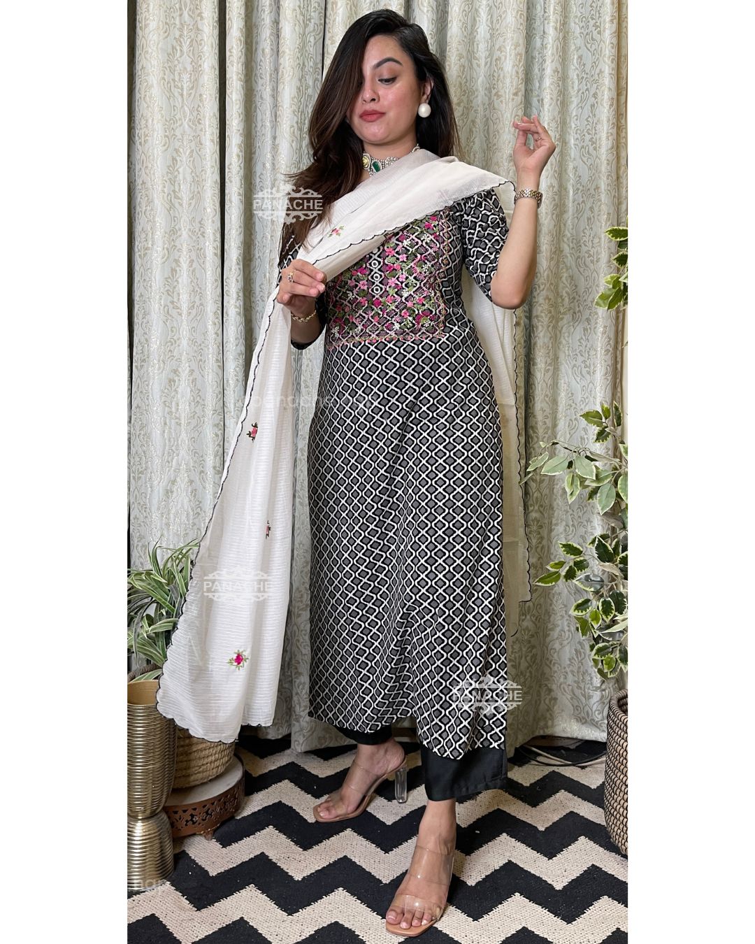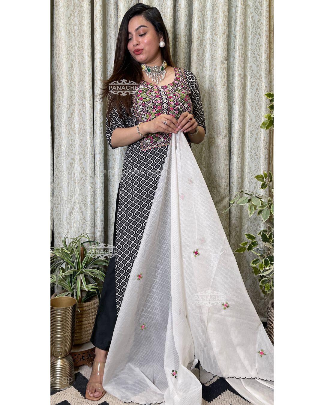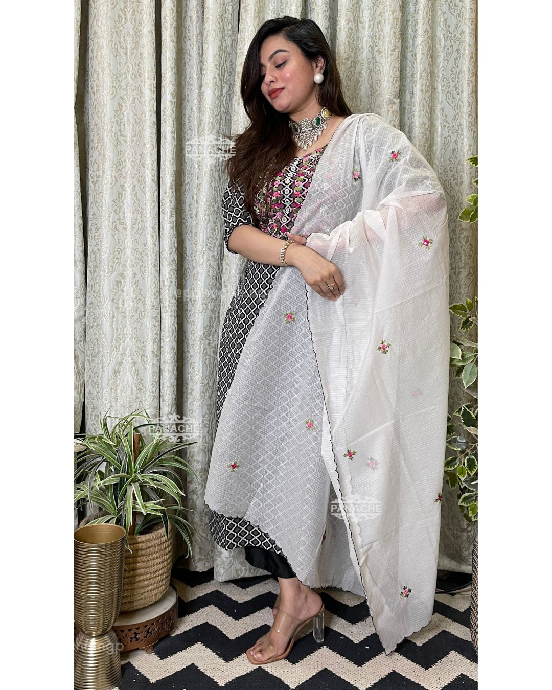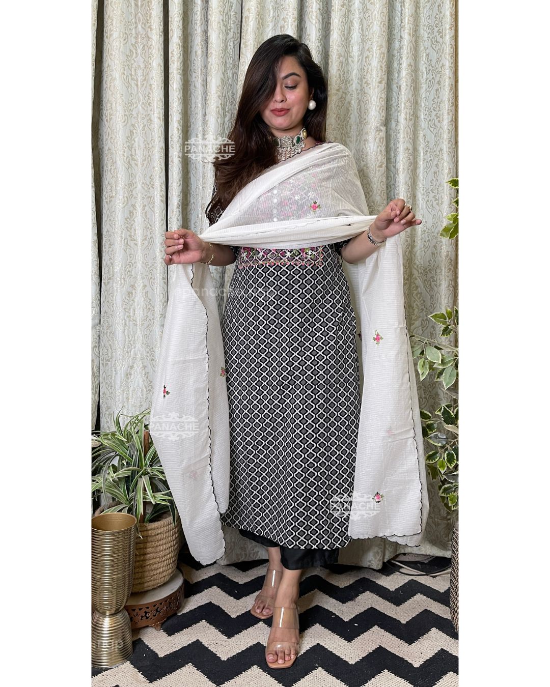 🟣 Frenchknot work on kurta with detailed cotton scalloped dupatta with buttas on it, elbow sleeves and plain pants
