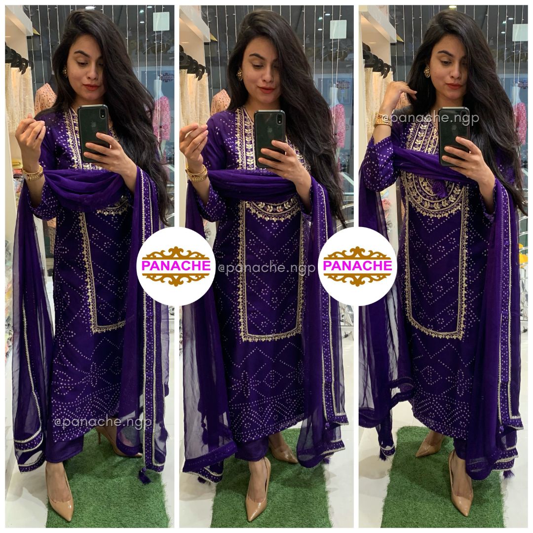 🟣 Bandhani kurta pant dupatta set with beautiful handwork embroidery on neckline and front tassels