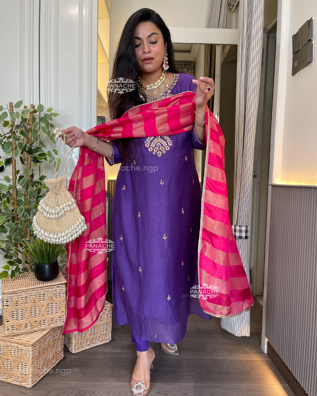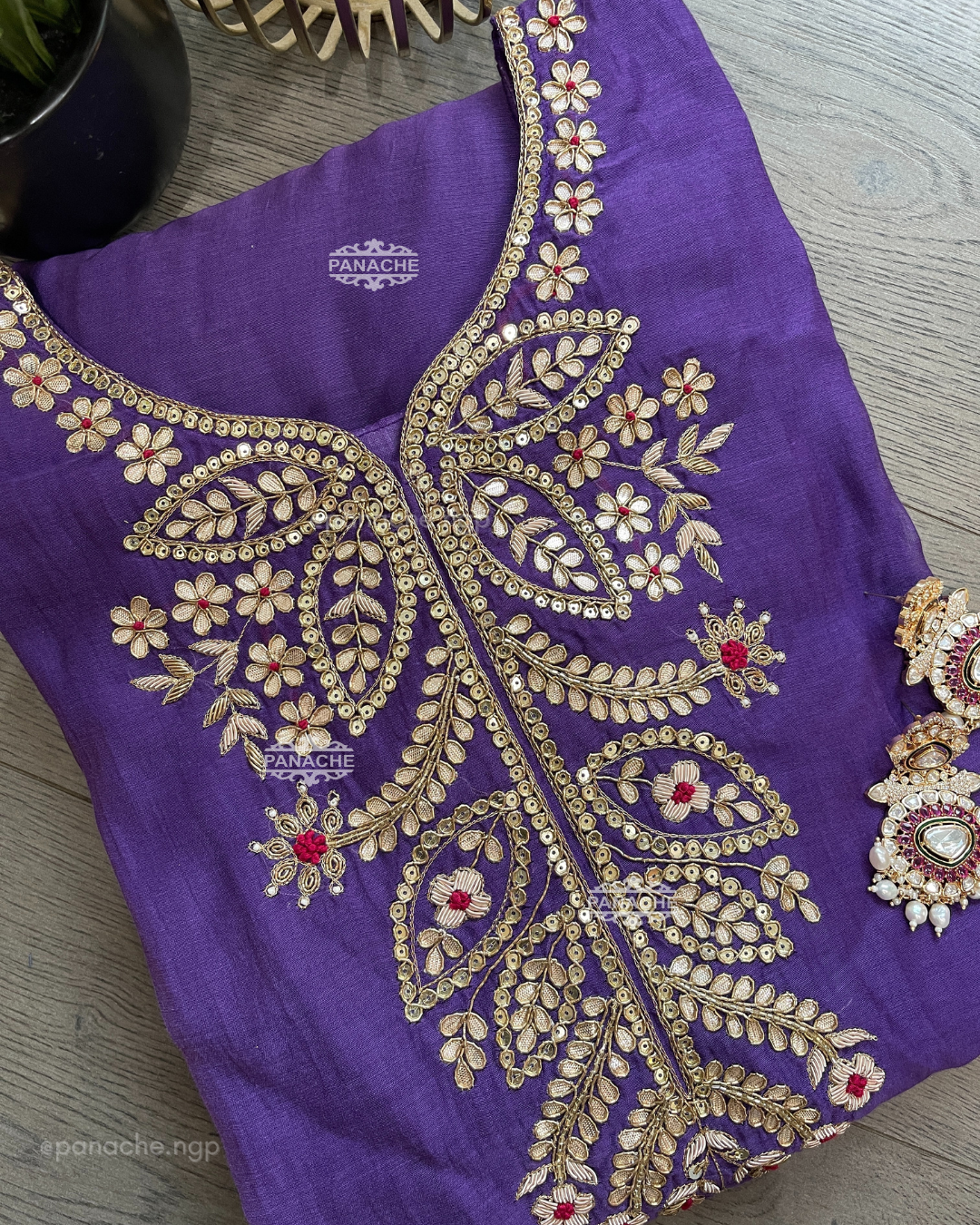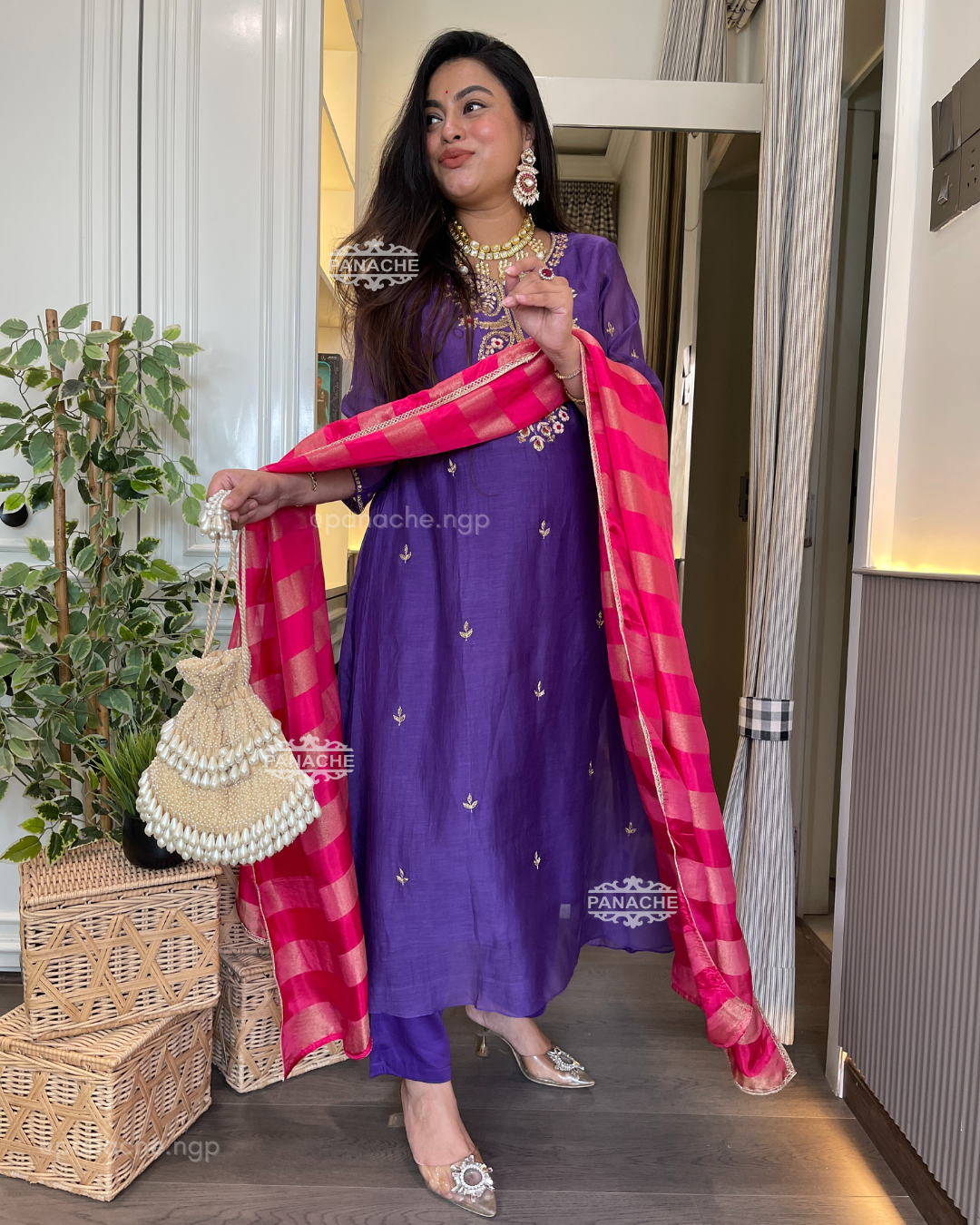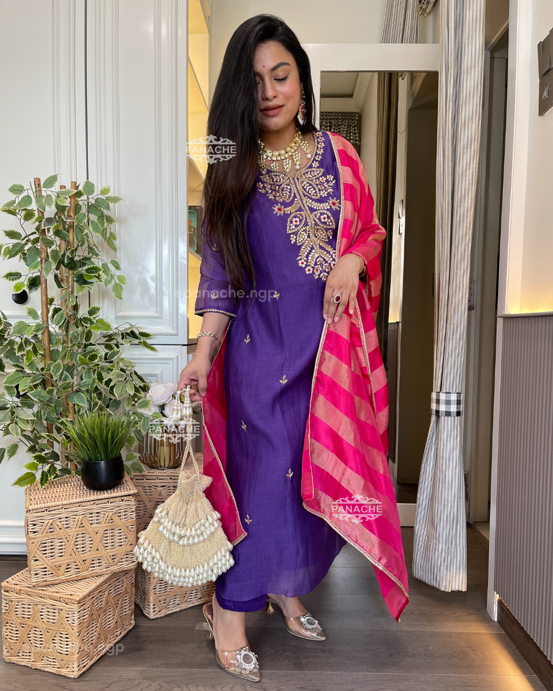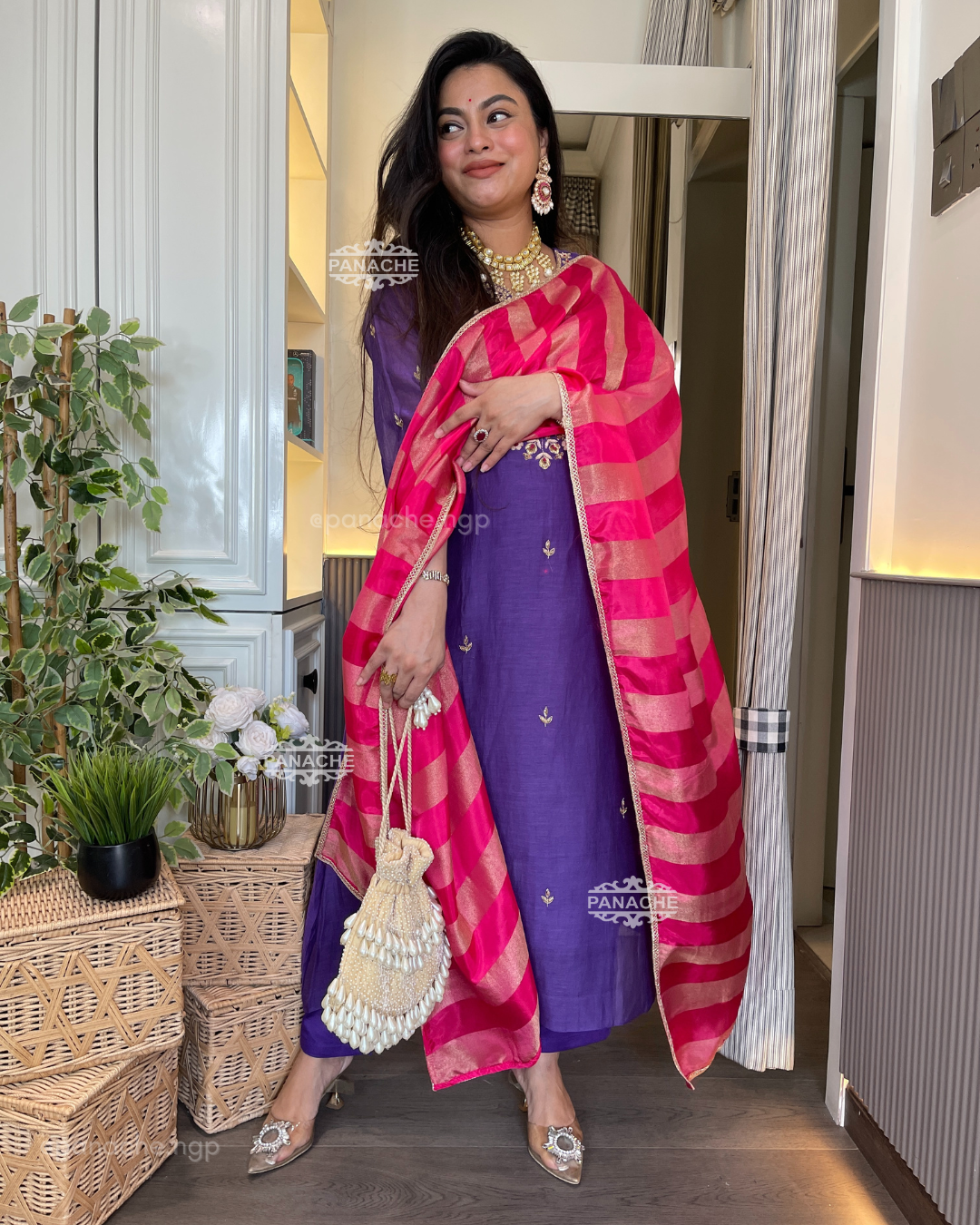 🟣 Kundan A-line Gota neckline with nakshi buttas on sleeves with a handwooven zari dupatta