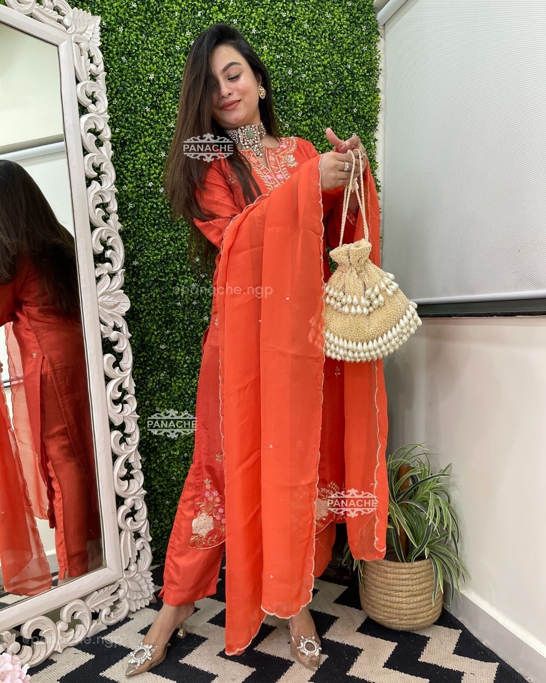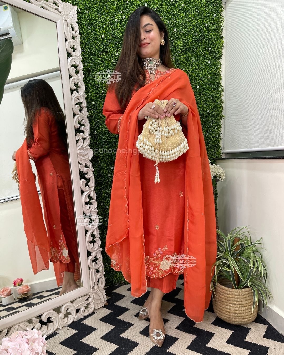 🟣 A festive colour and intricate and lovely handwork in kurta with Orgenza scalloped dupatta, applique cutwork daman of kurta is the highlight