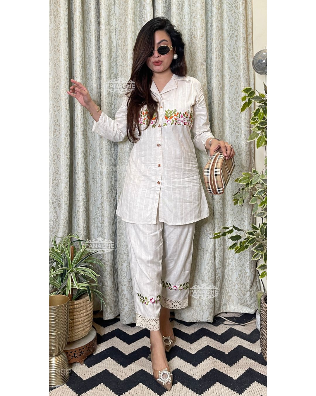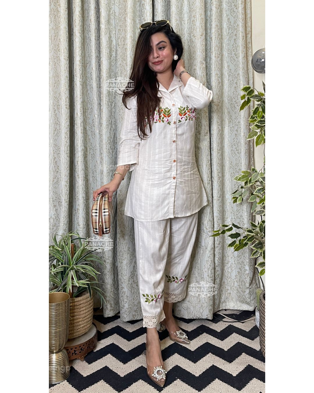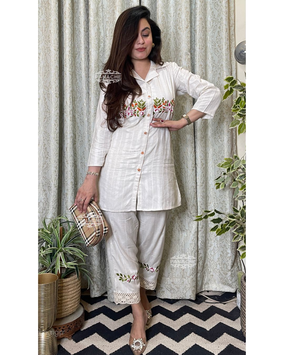 🟣 A self cotton coord with embroidery on kurta pants and details on pants