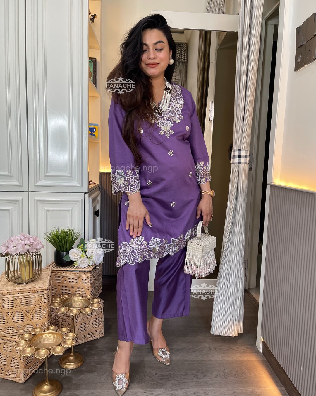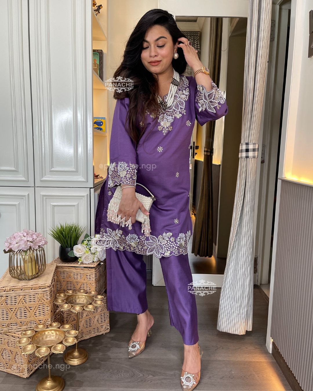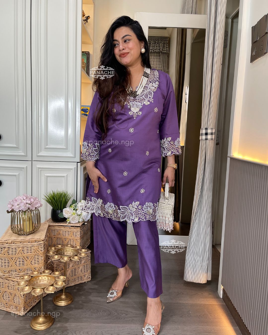 🟣 Cut pipe highlights on kurta with a heavier look and a simple pants, all the goodness coming from the colour and embroidery