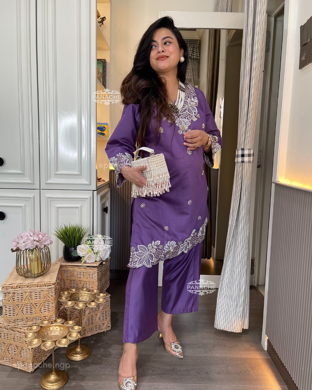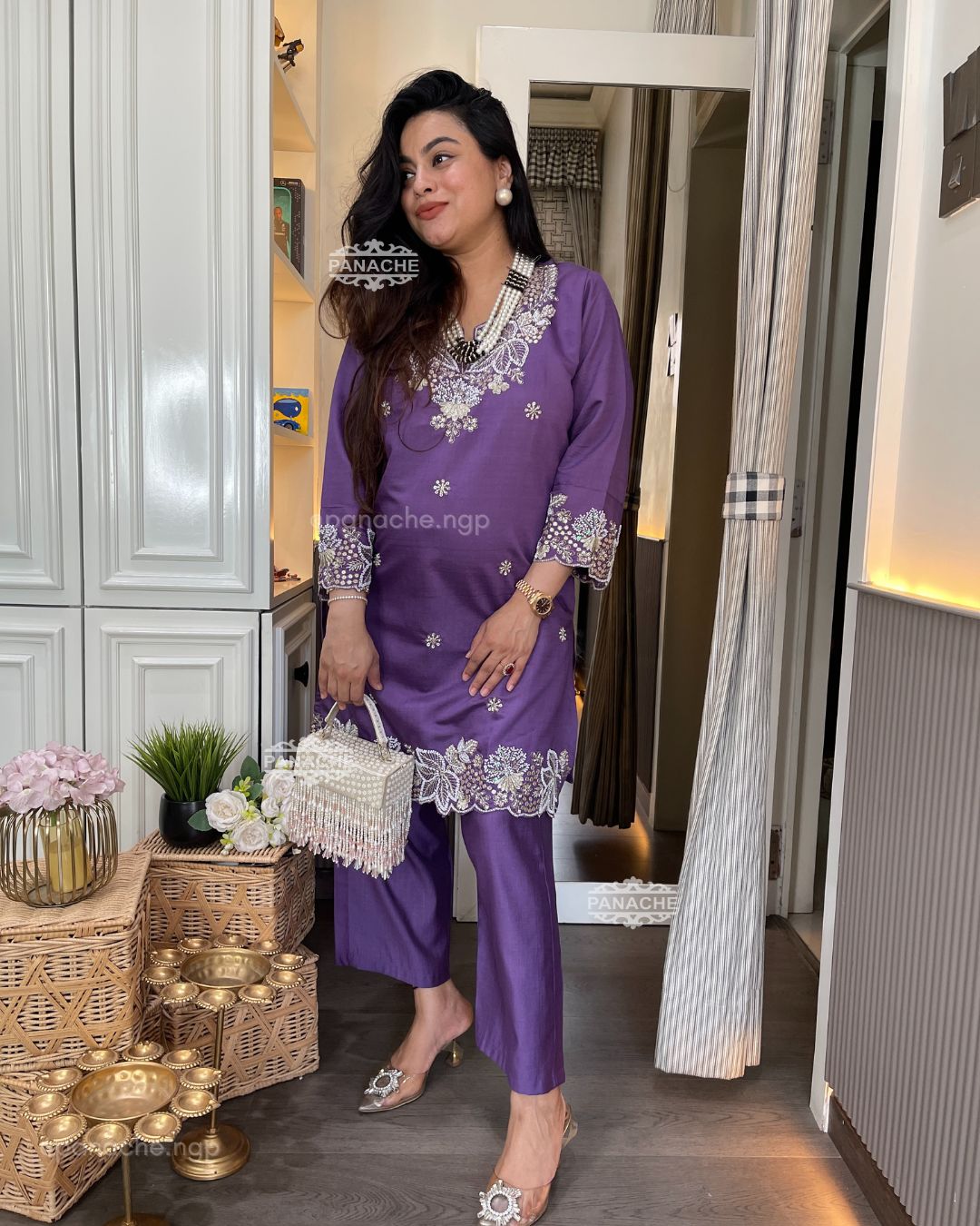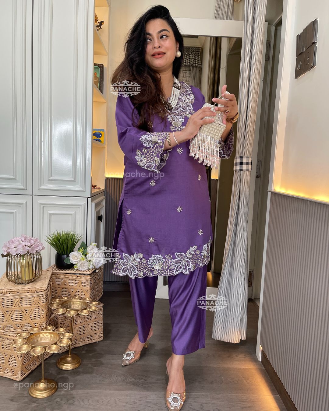 🟣 Cut pipe highlights on kurta with a heavier look and a simple pants, all the goodness coming from the colour and embroidery
