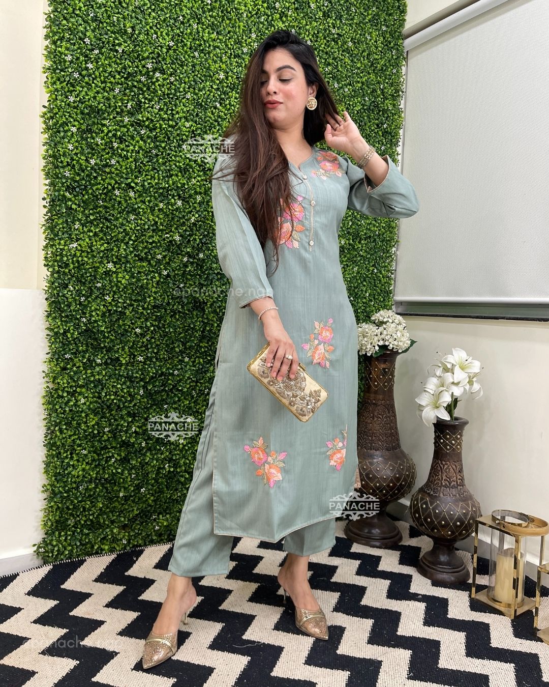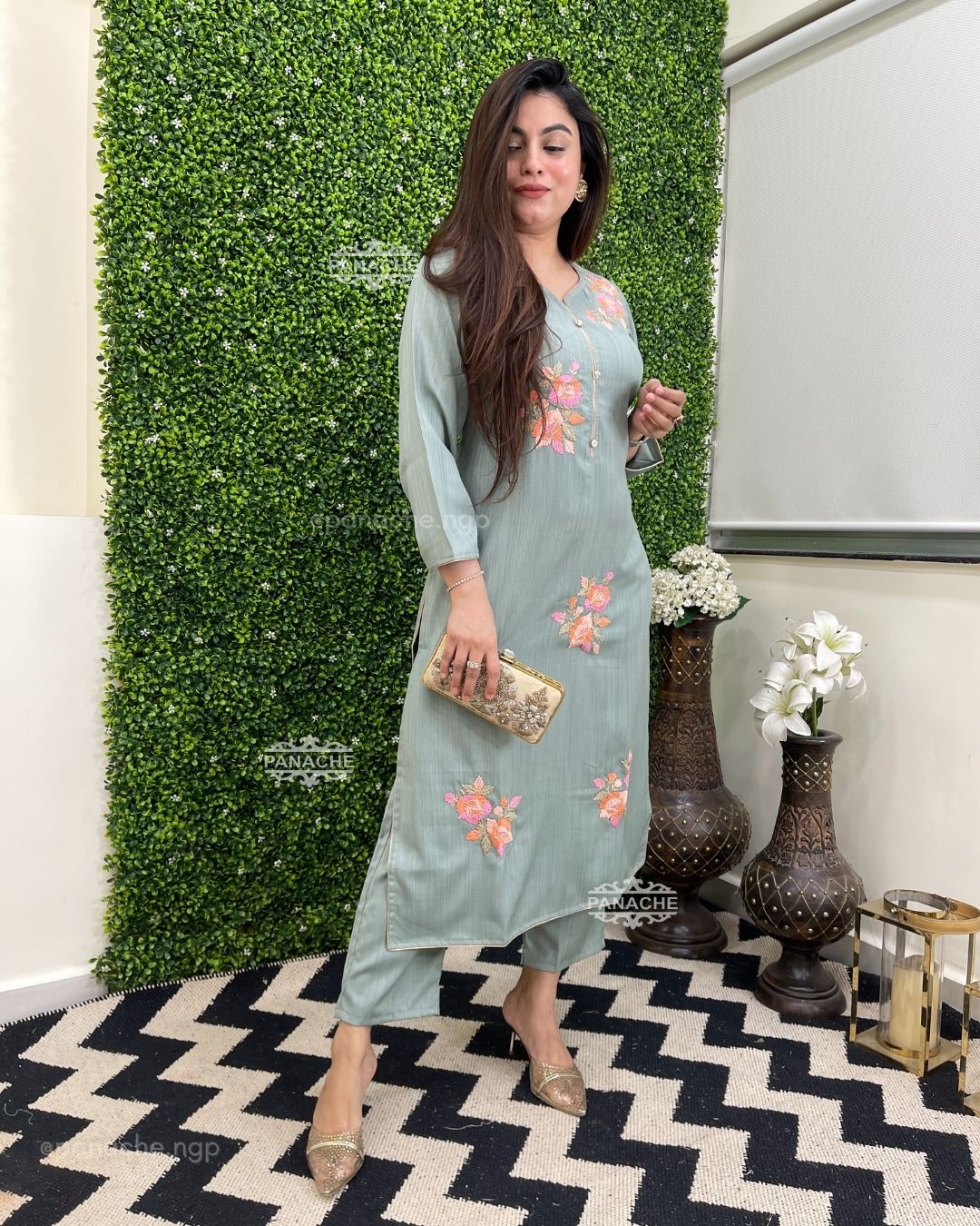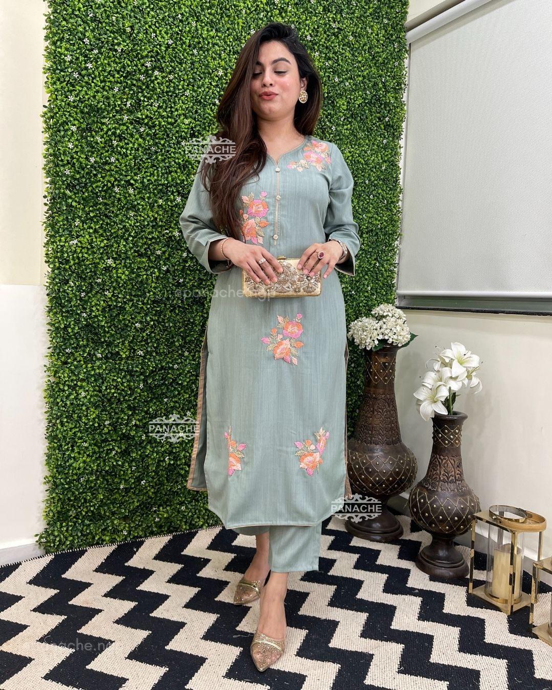 🟣 Sweetheart neckline with dabka nakshi floral embroidery on kurta with plain pants