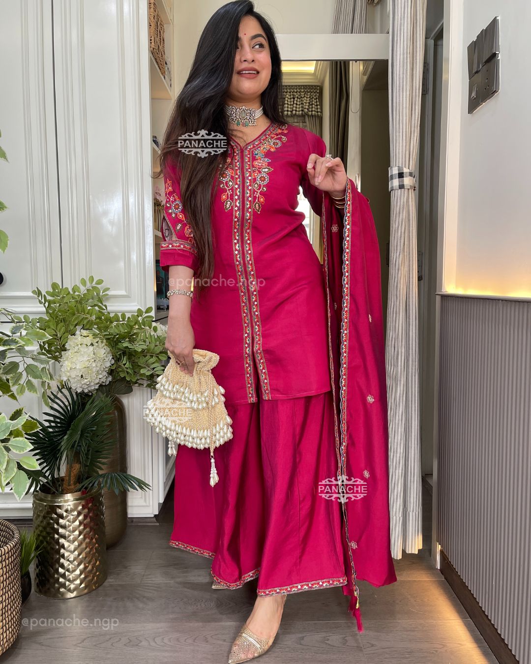 🟣 Machine work neckline with fancy sleeves and gharara with borders on dupatta
