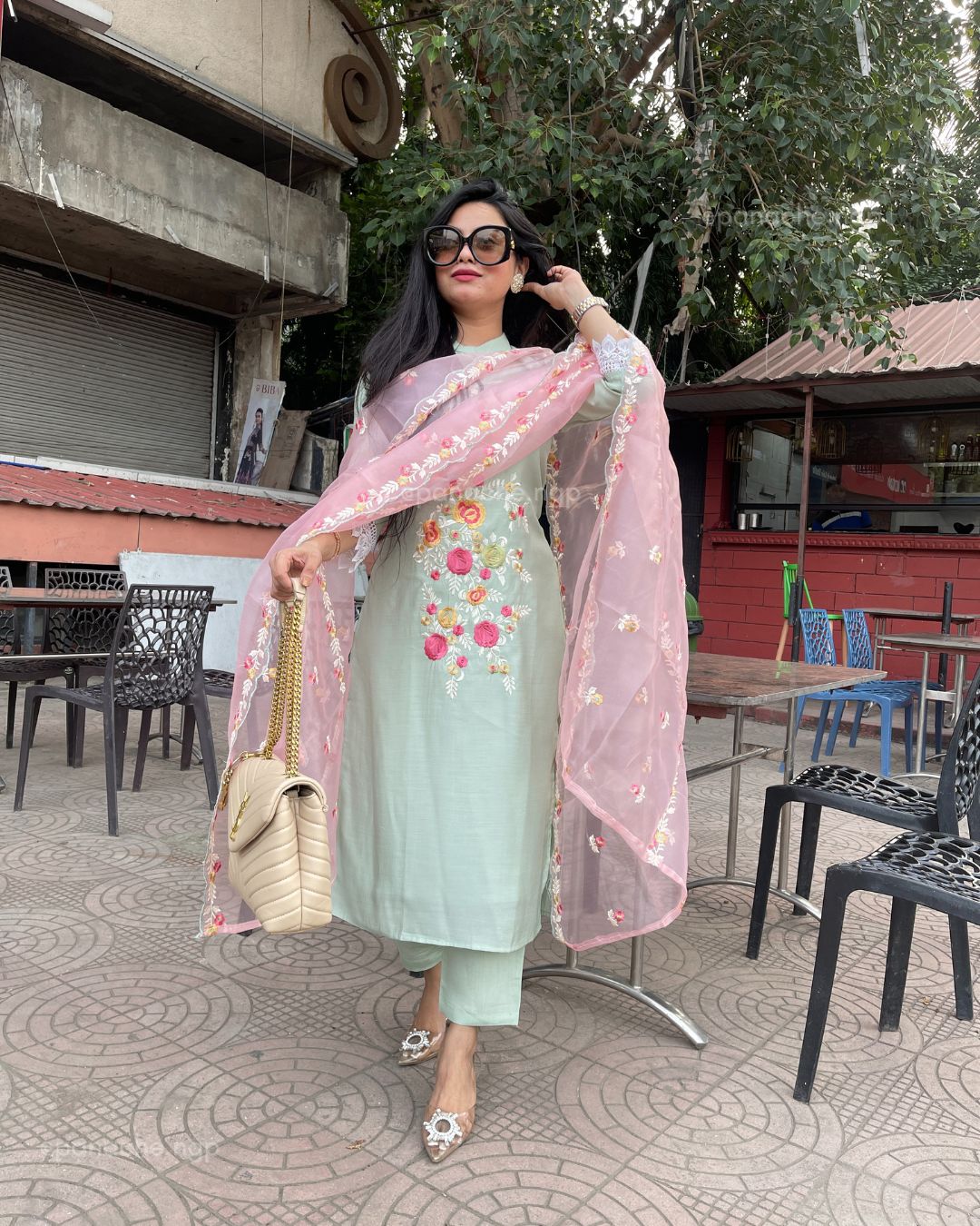 🟣 An embroidered standcollar kurta with beautiful cutwork on dupatta with small buttas all over