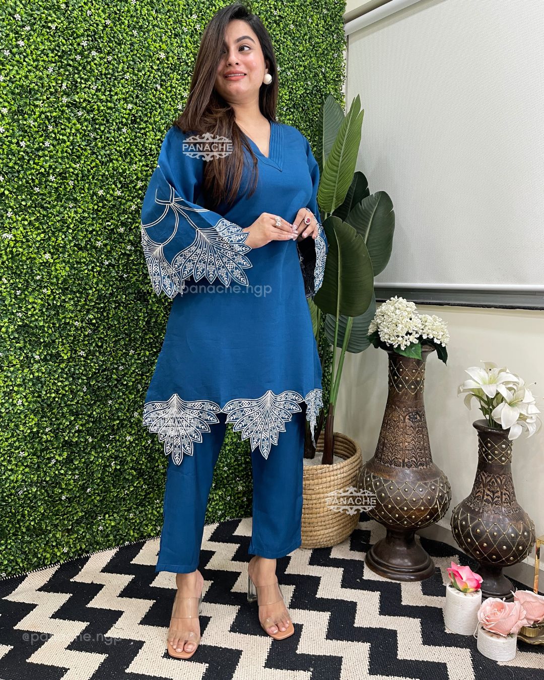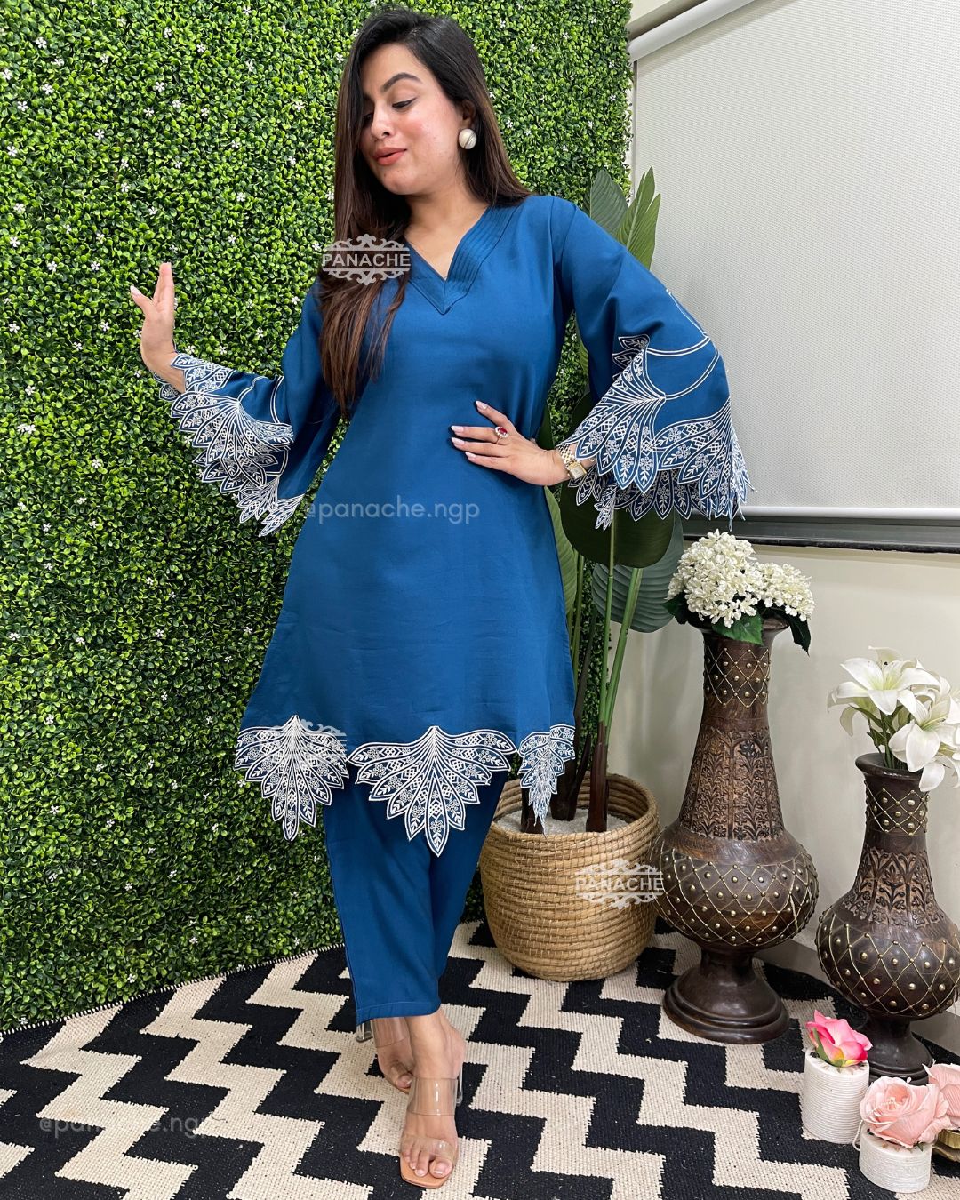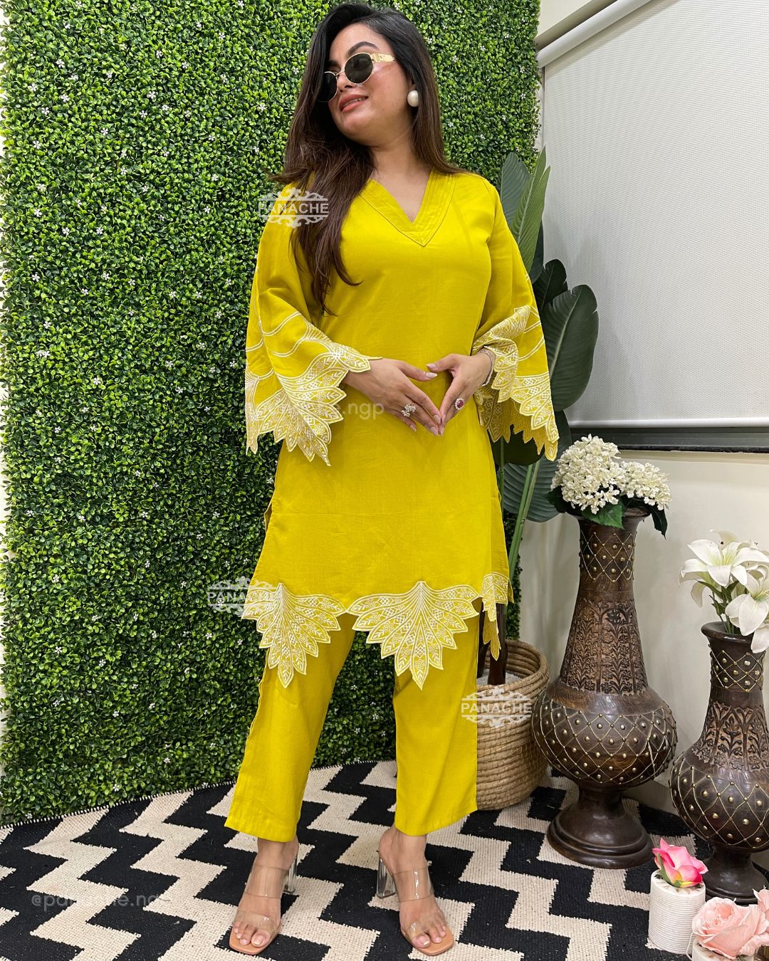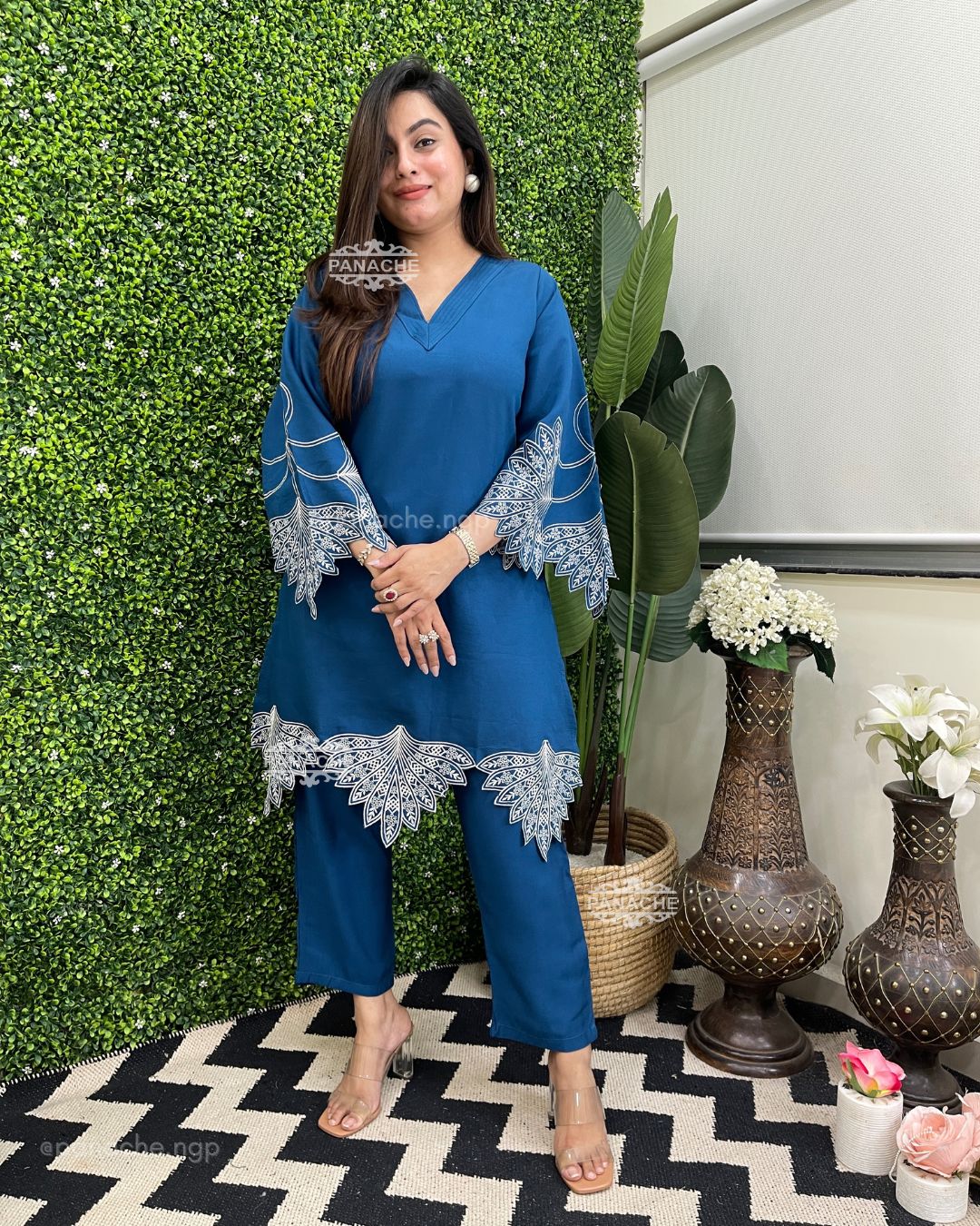 🟣 We need some solid colour coords with embroidery that makes it super stylish! Cutwork sleeves and front daman, pin-tucks v neck on top