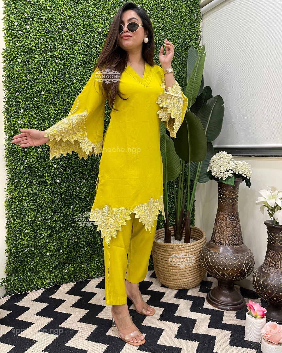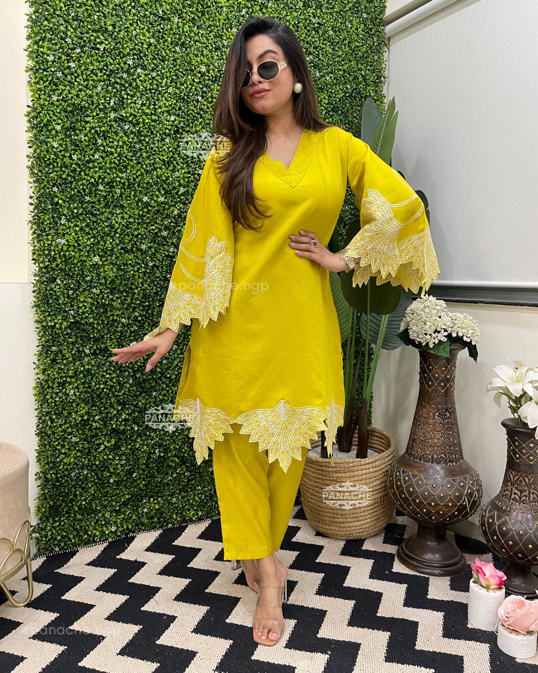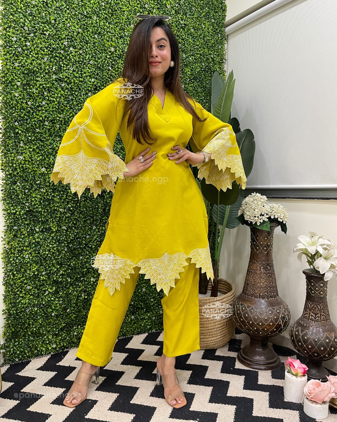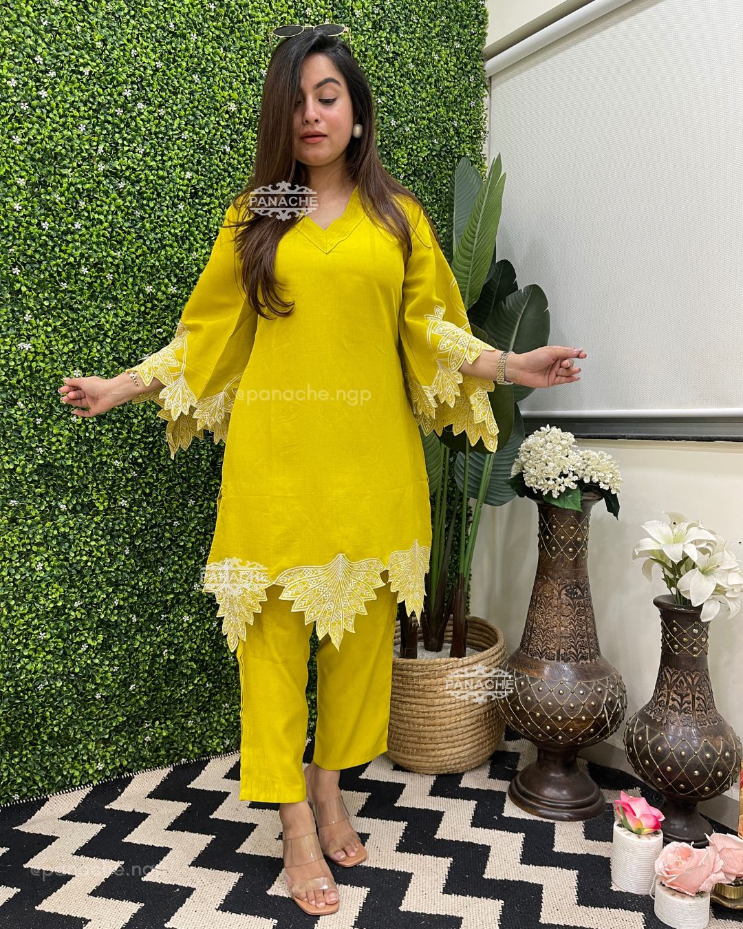 🟣 We need some solid colour coords with embroidery that makes it super stylish! Cutwork sleeves and front daman, pin-tucks v neck on top