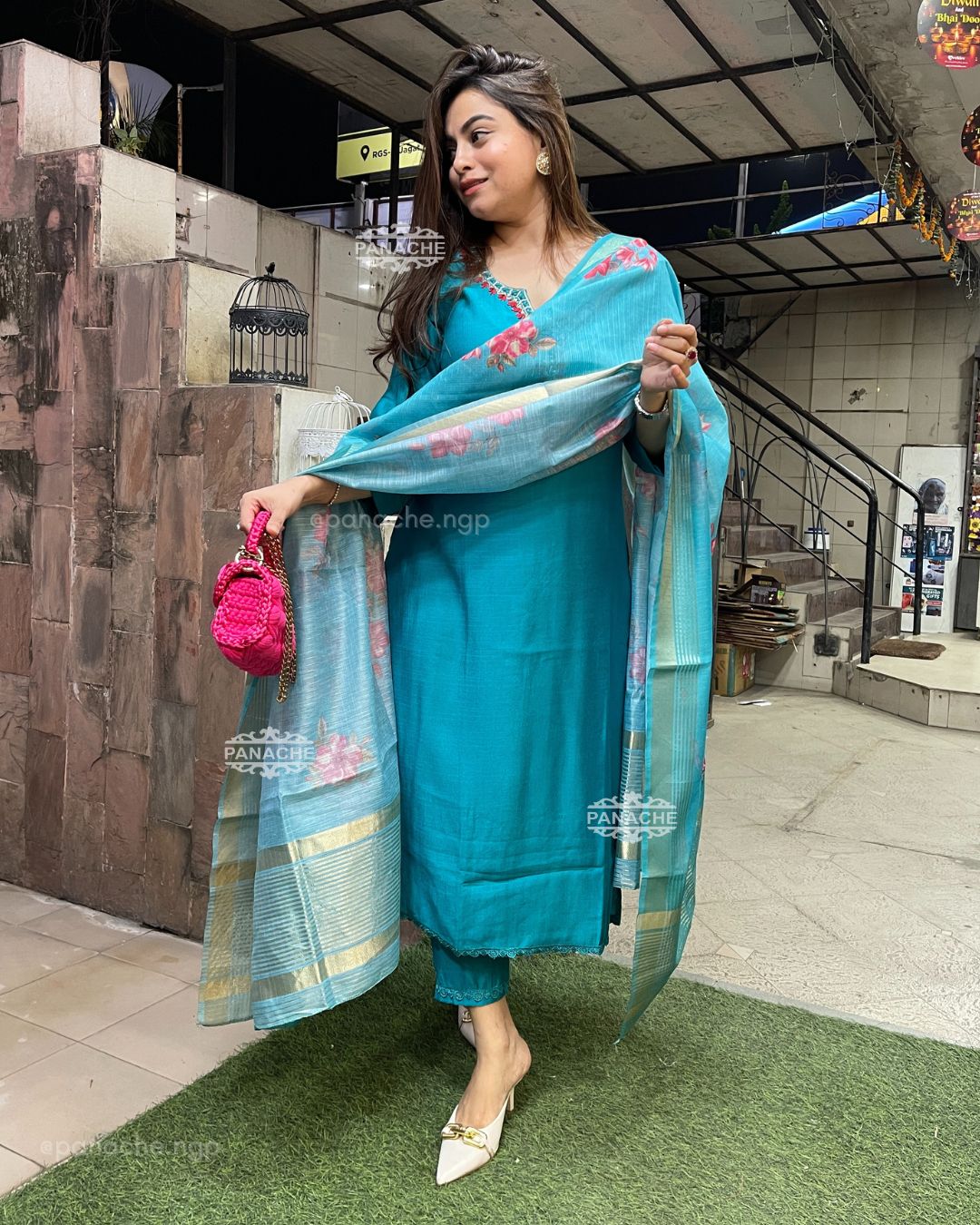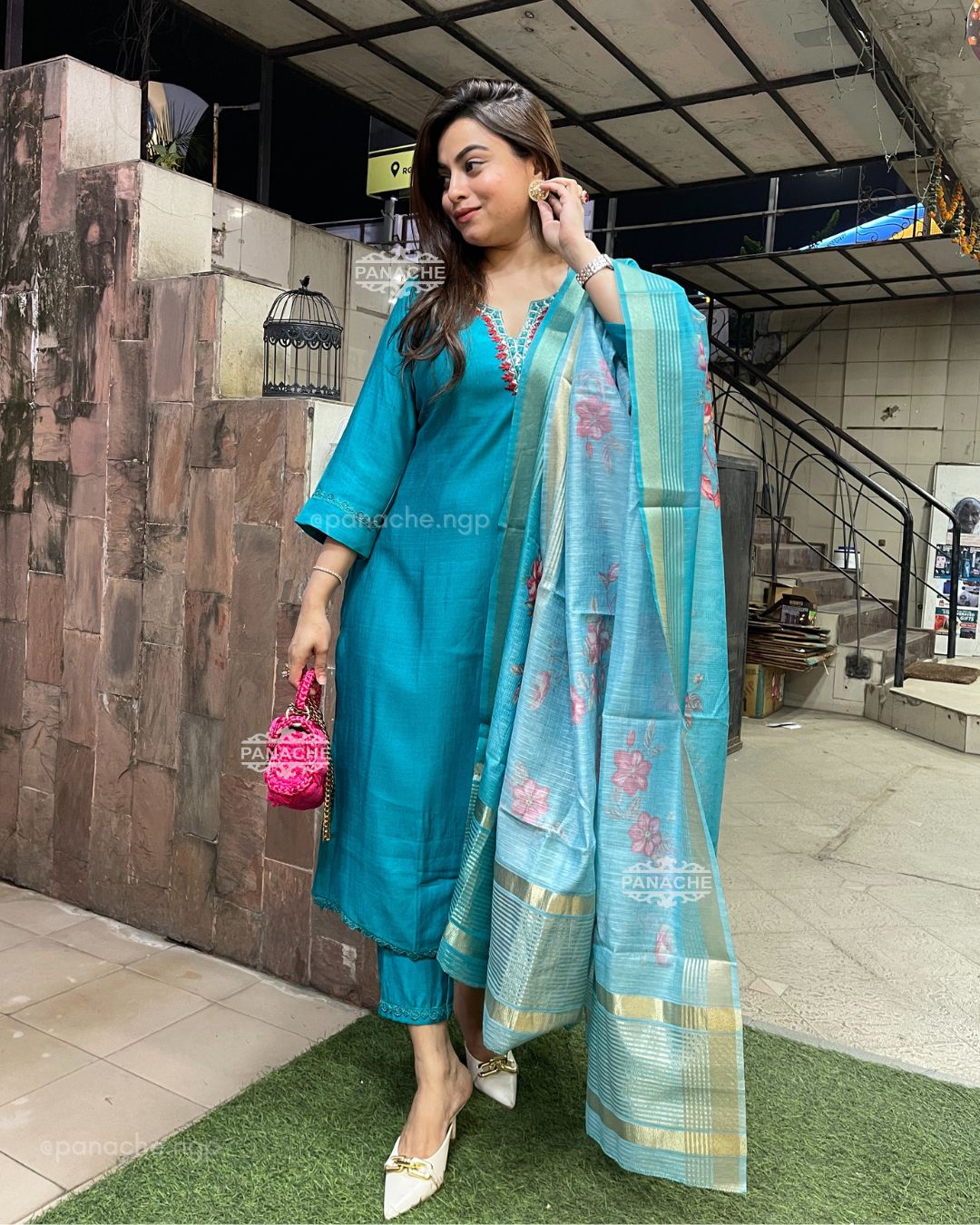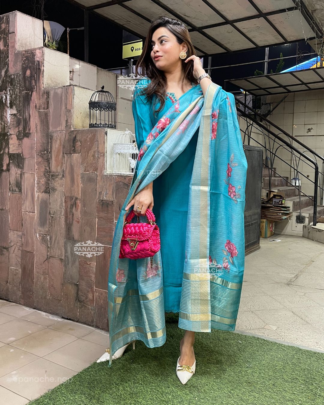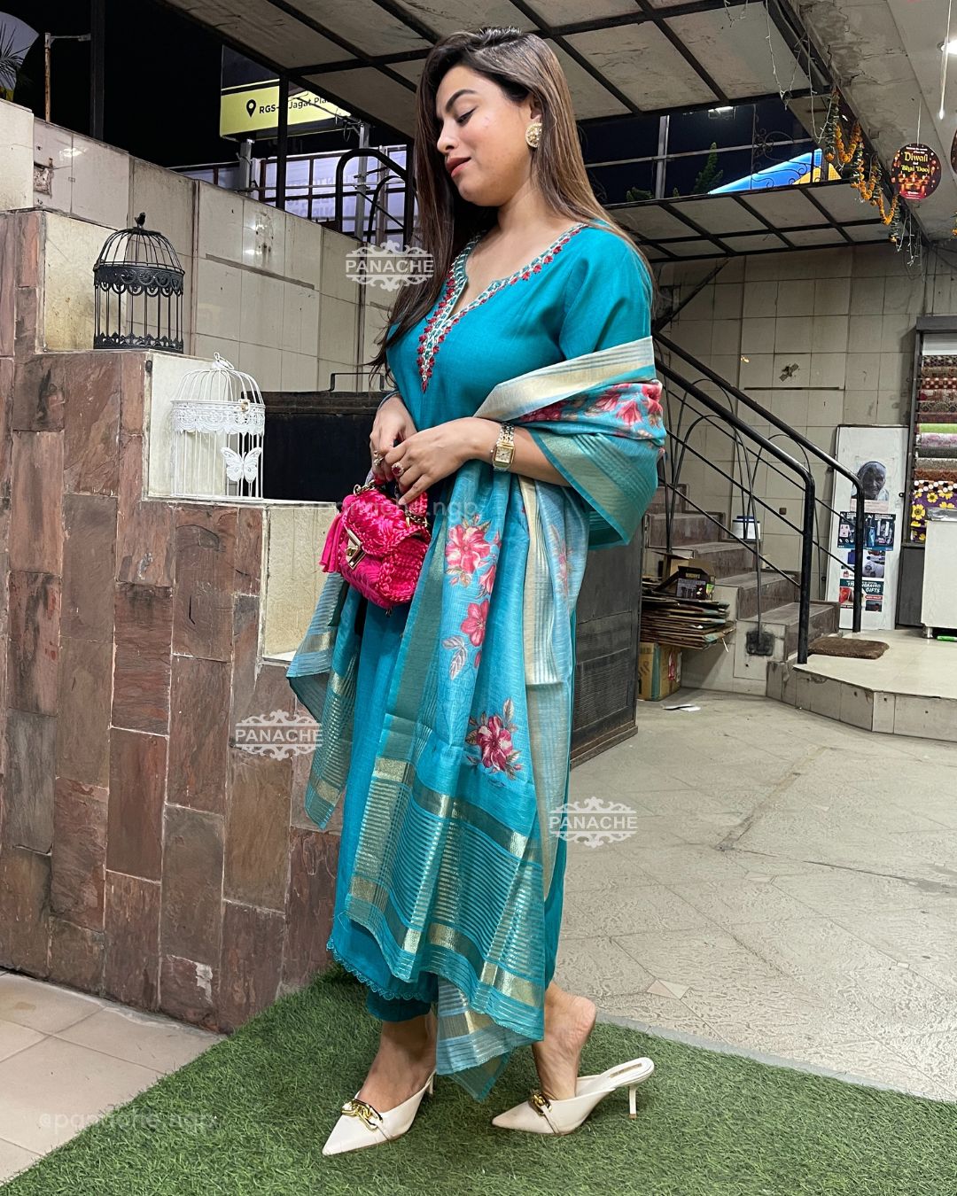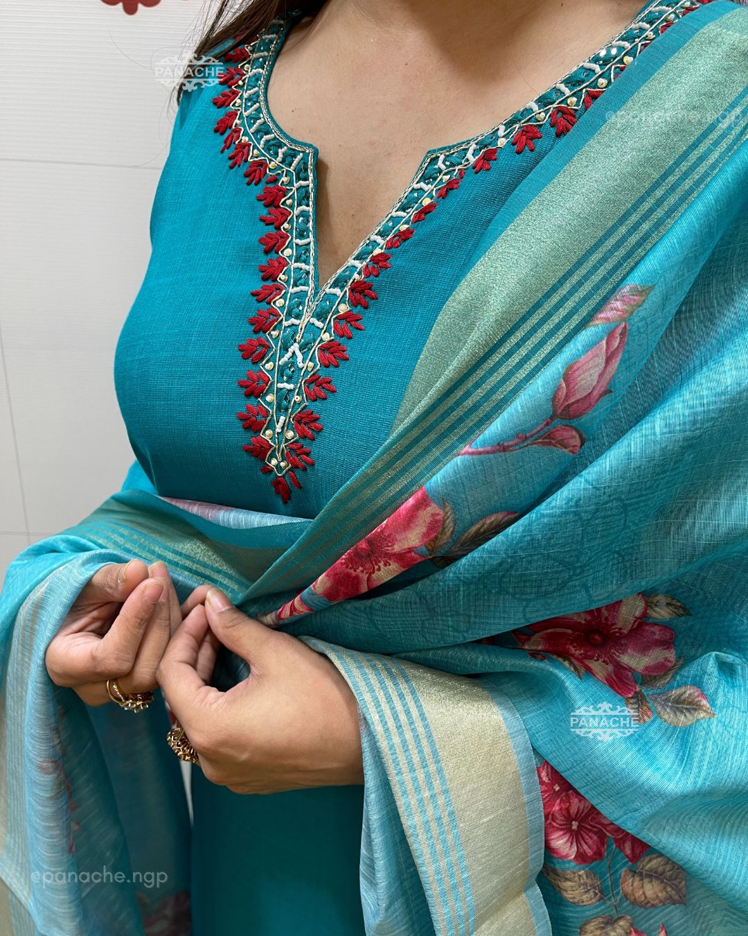 🟣 Sweetheart neckline with hand embroidery on kurta and floral dupatta with zari borders, Crosia lace on daman of kurta sleeves and daman of pants