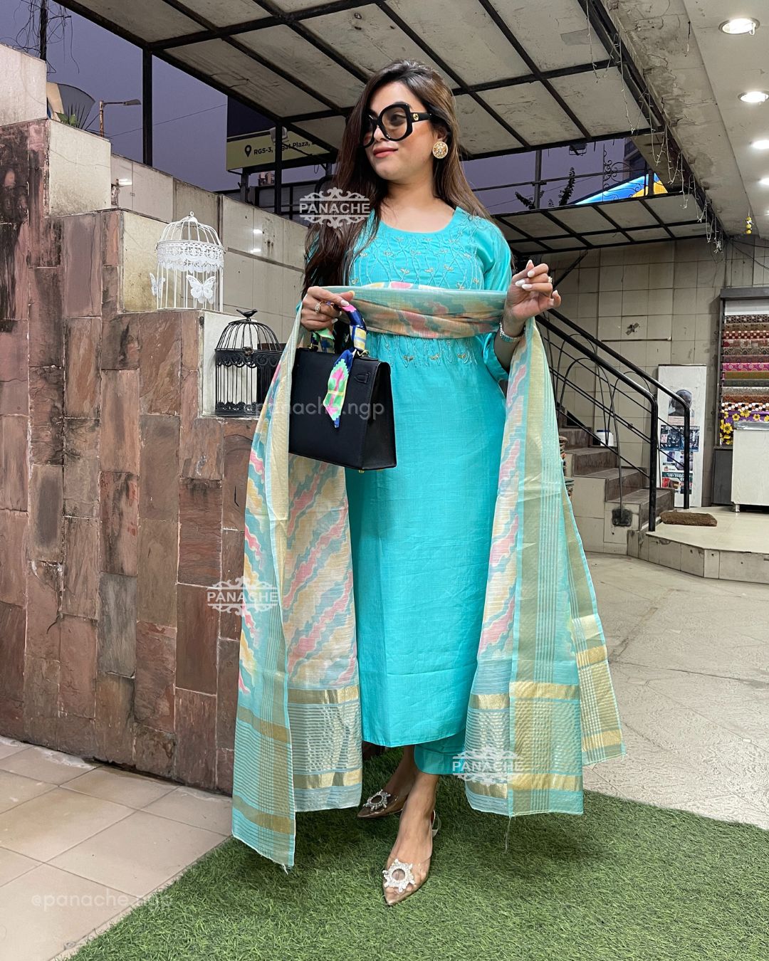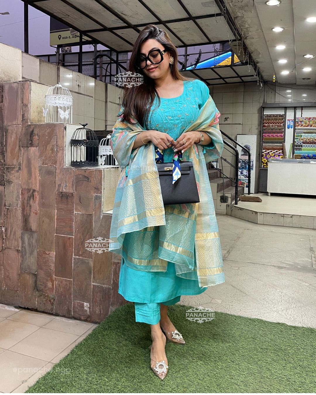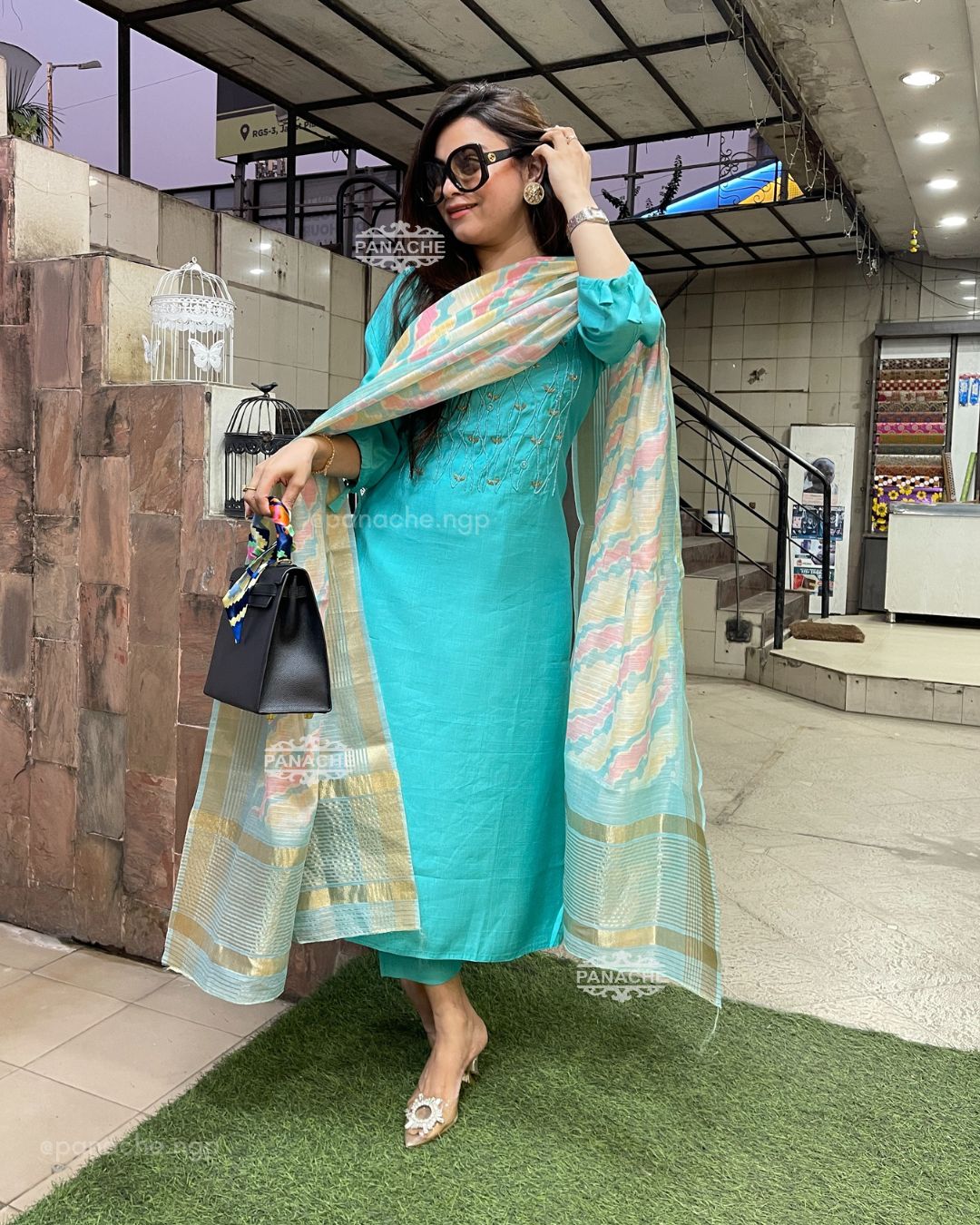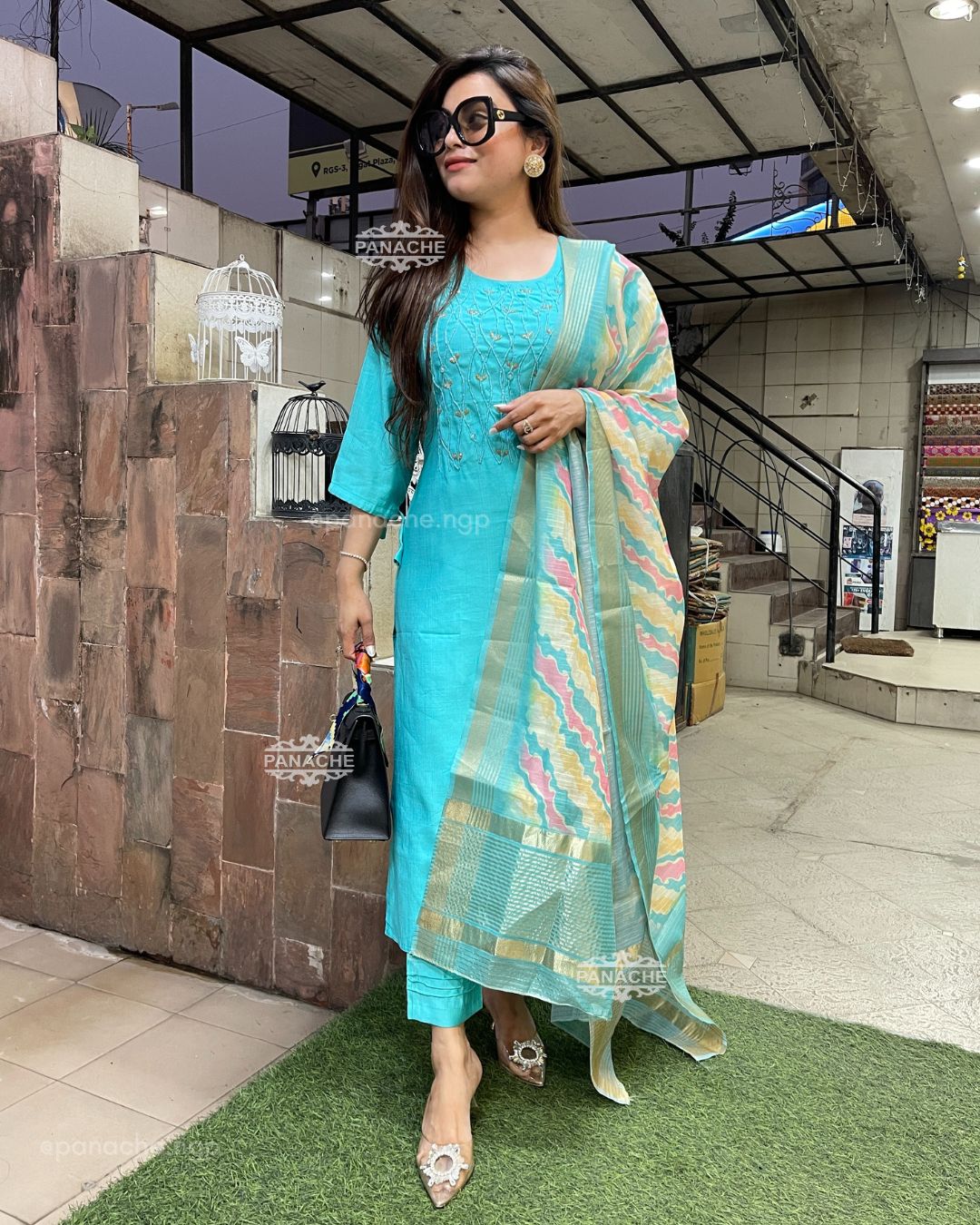 🟣 Wear set with printed dupatta with and cut pipe embroidery around neckline, tie sleeves to give a beautiful fitted look