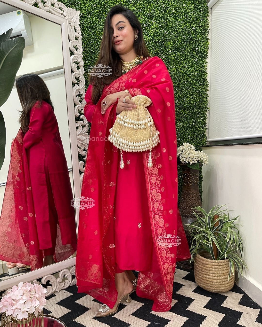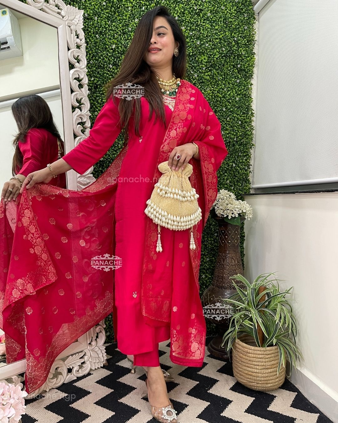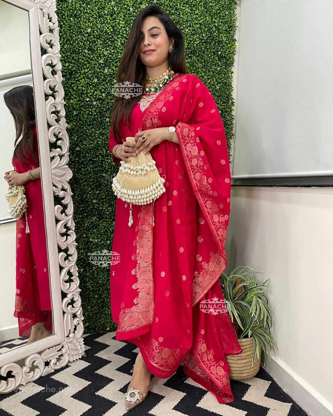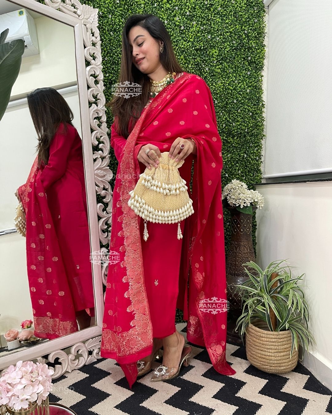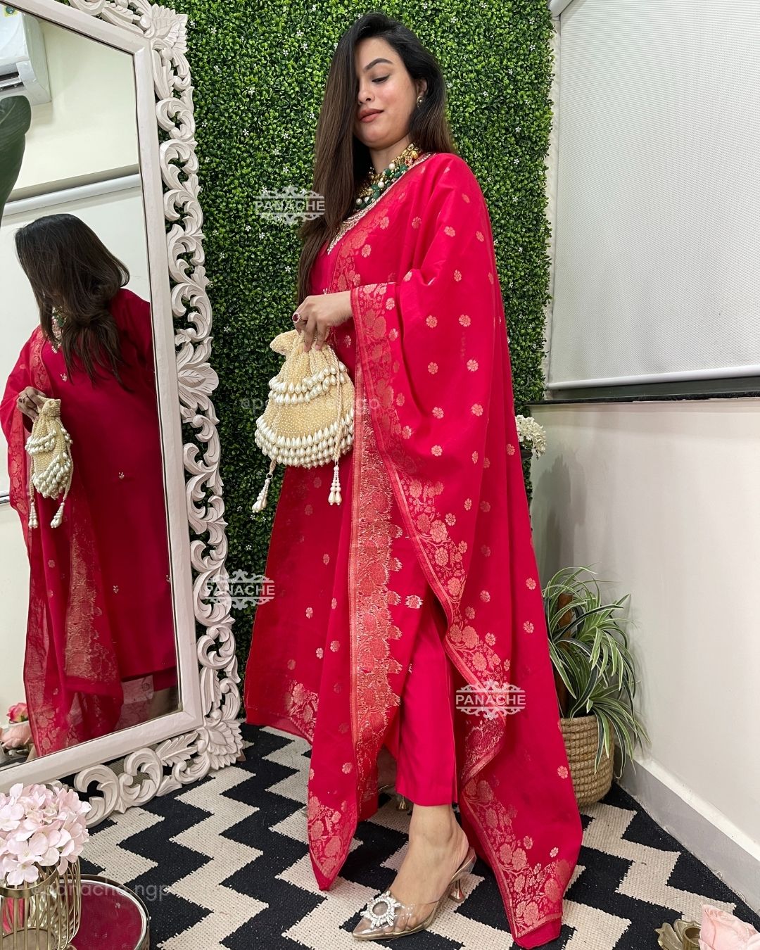 🟣 Detailed handwork on zardoz nakshi on neckline with small buttas all over kurta and a woven dupatta with plain pants