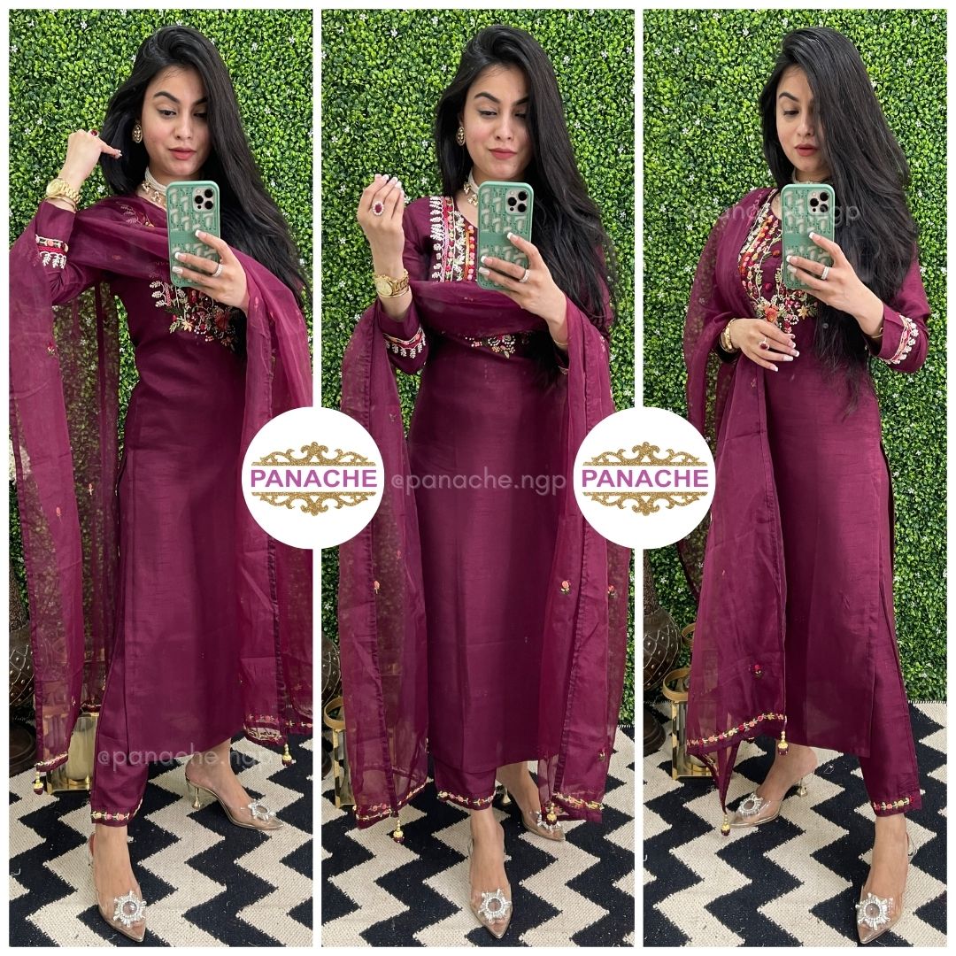 🟣 Details - French knot, resham , complete handwork on yolk of kurta , sleeves, daman of pants with handwork tassels