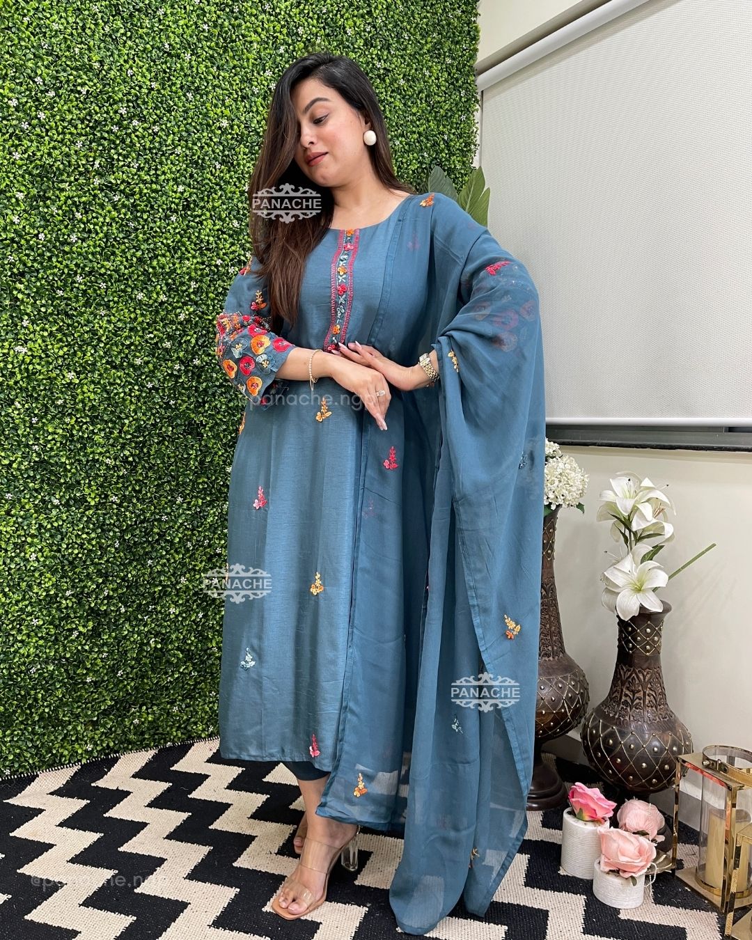🟣 French knot work on sleeves button patti and small buttas all over kurta, with a beautiful buttis dupatta makes this one a easy buy