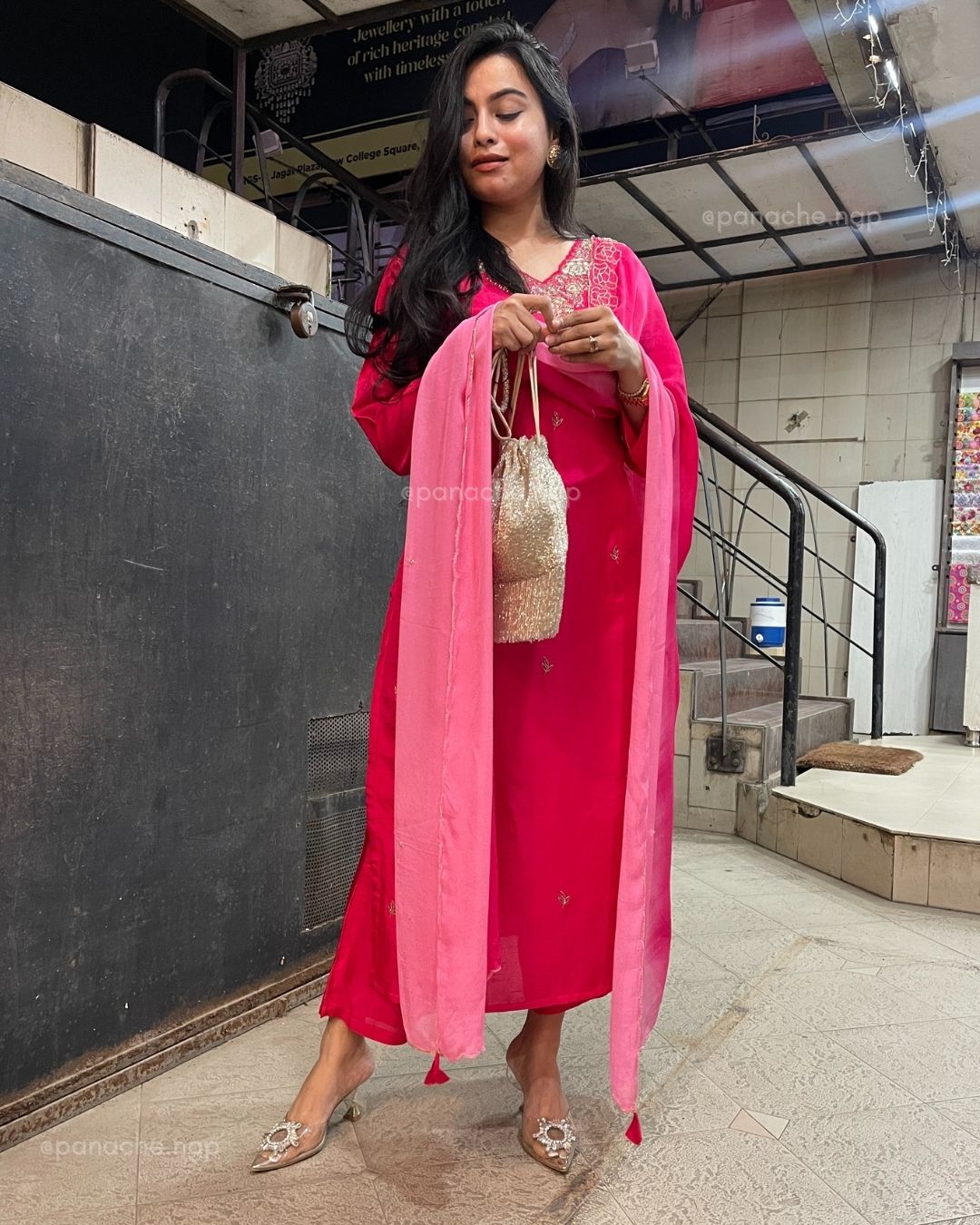 🟣 Details- Pure handwork on neckline with beautiful contrast threads n beads , a handwork broach on dupatta with cut pipe scallop dupatta on all sides and tassels