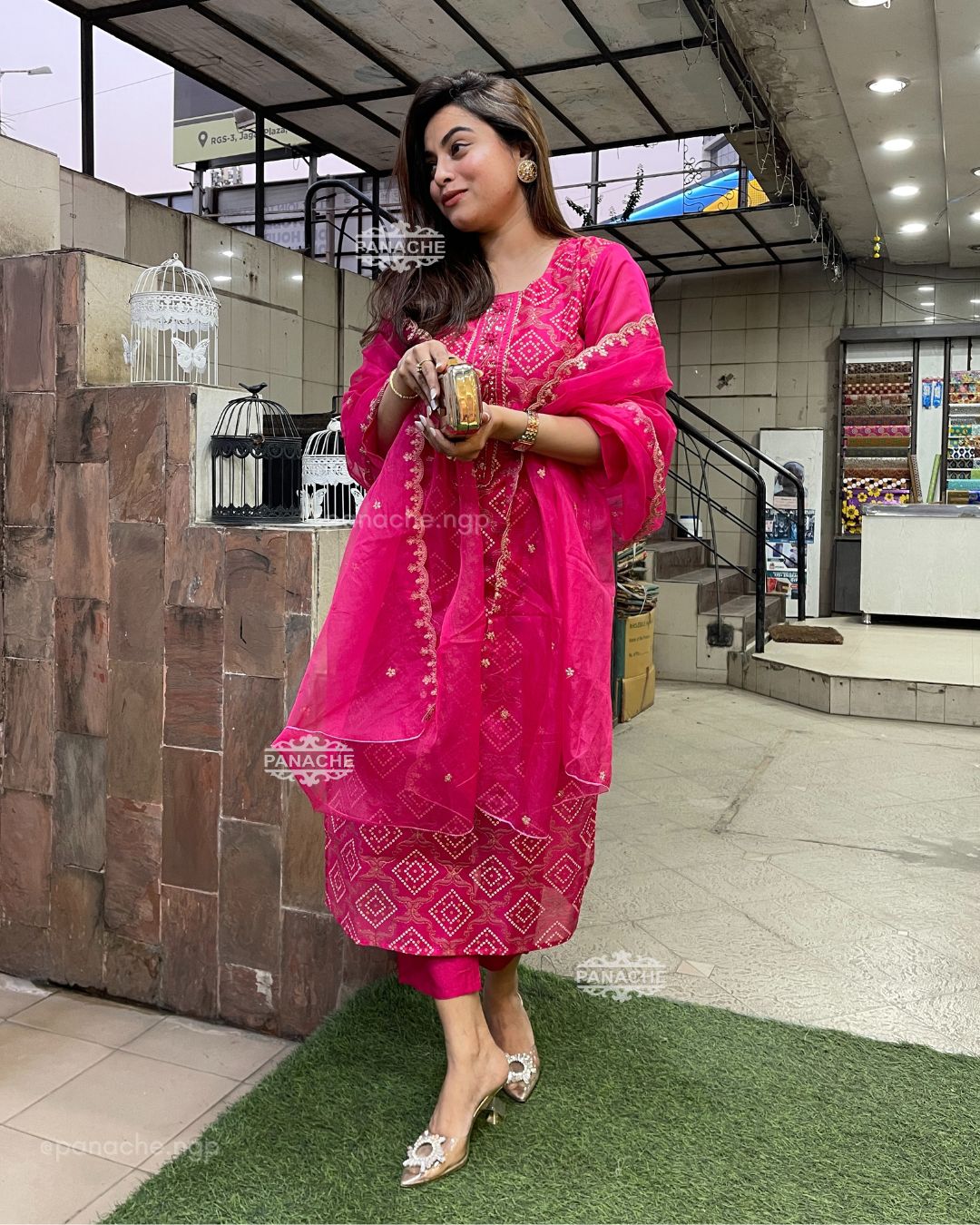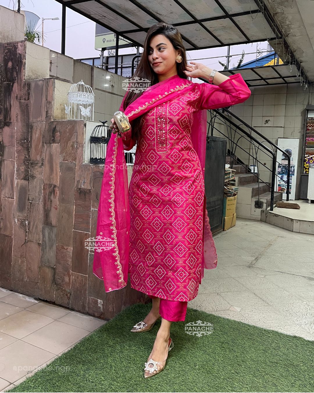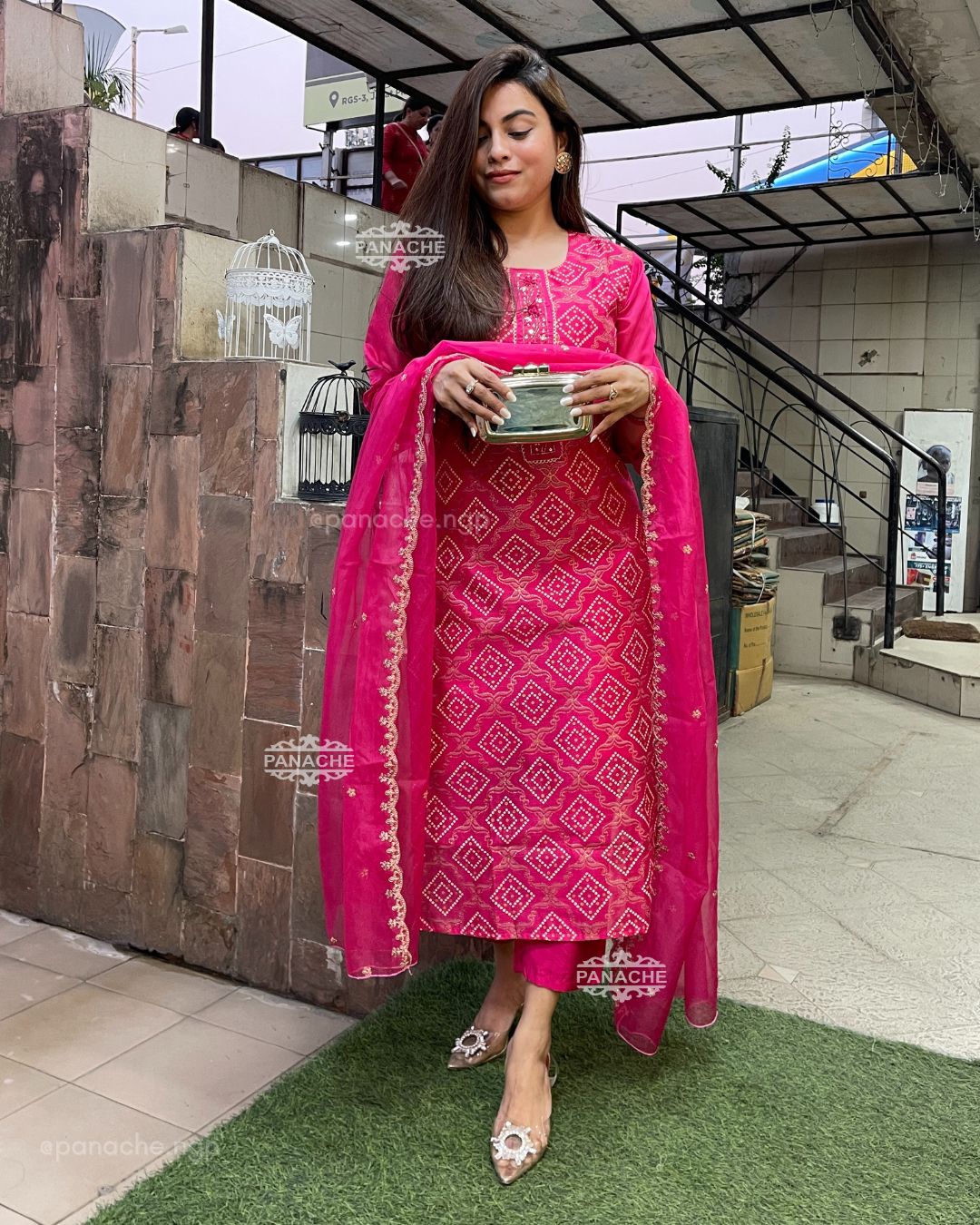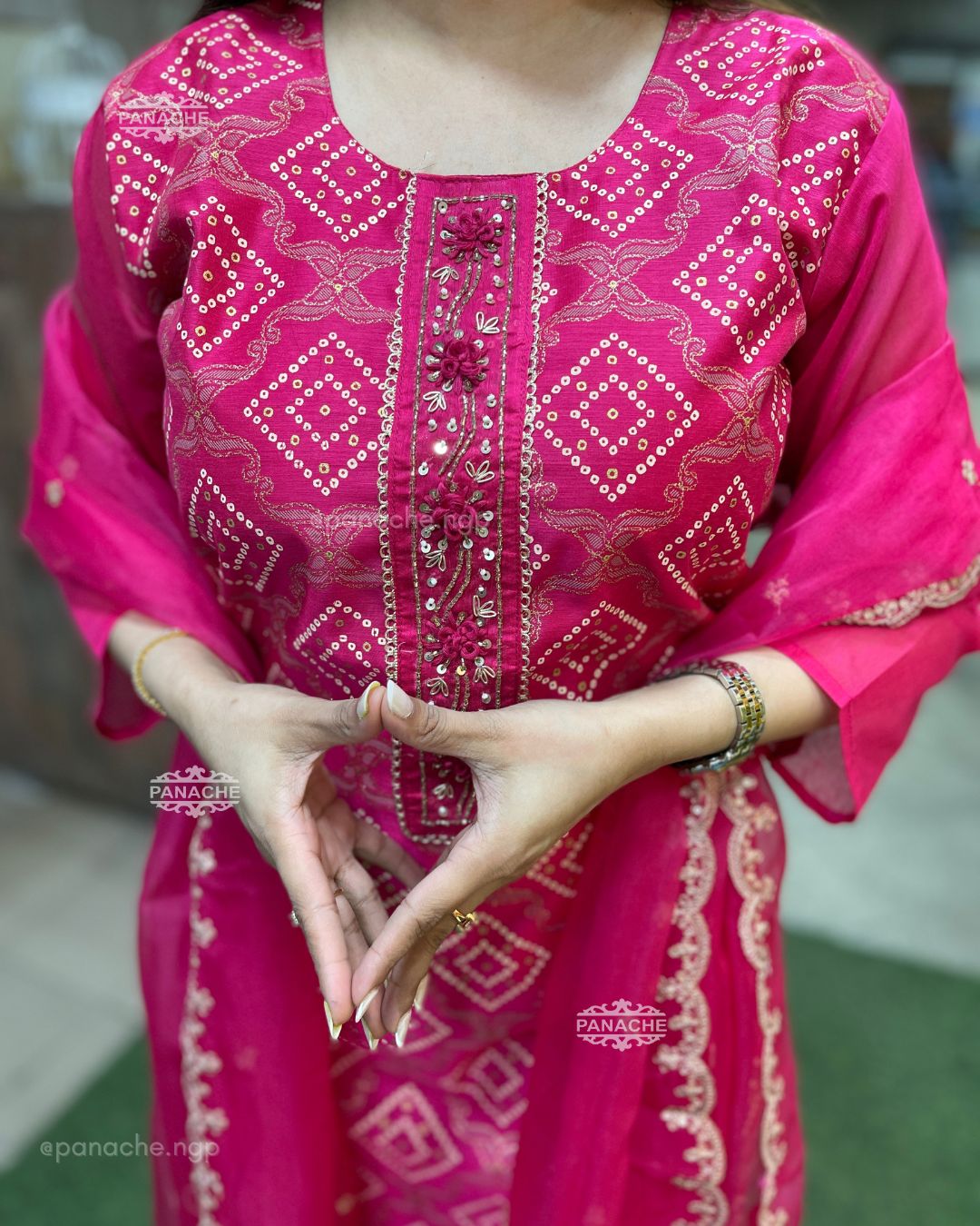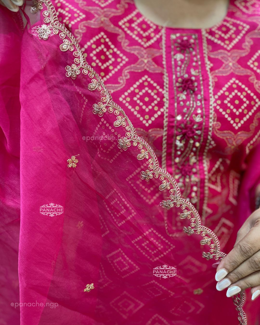 🟣 Bandhani kurta with plain sleeves and highlights on button patti with beautiful scallop embroidered dupatta