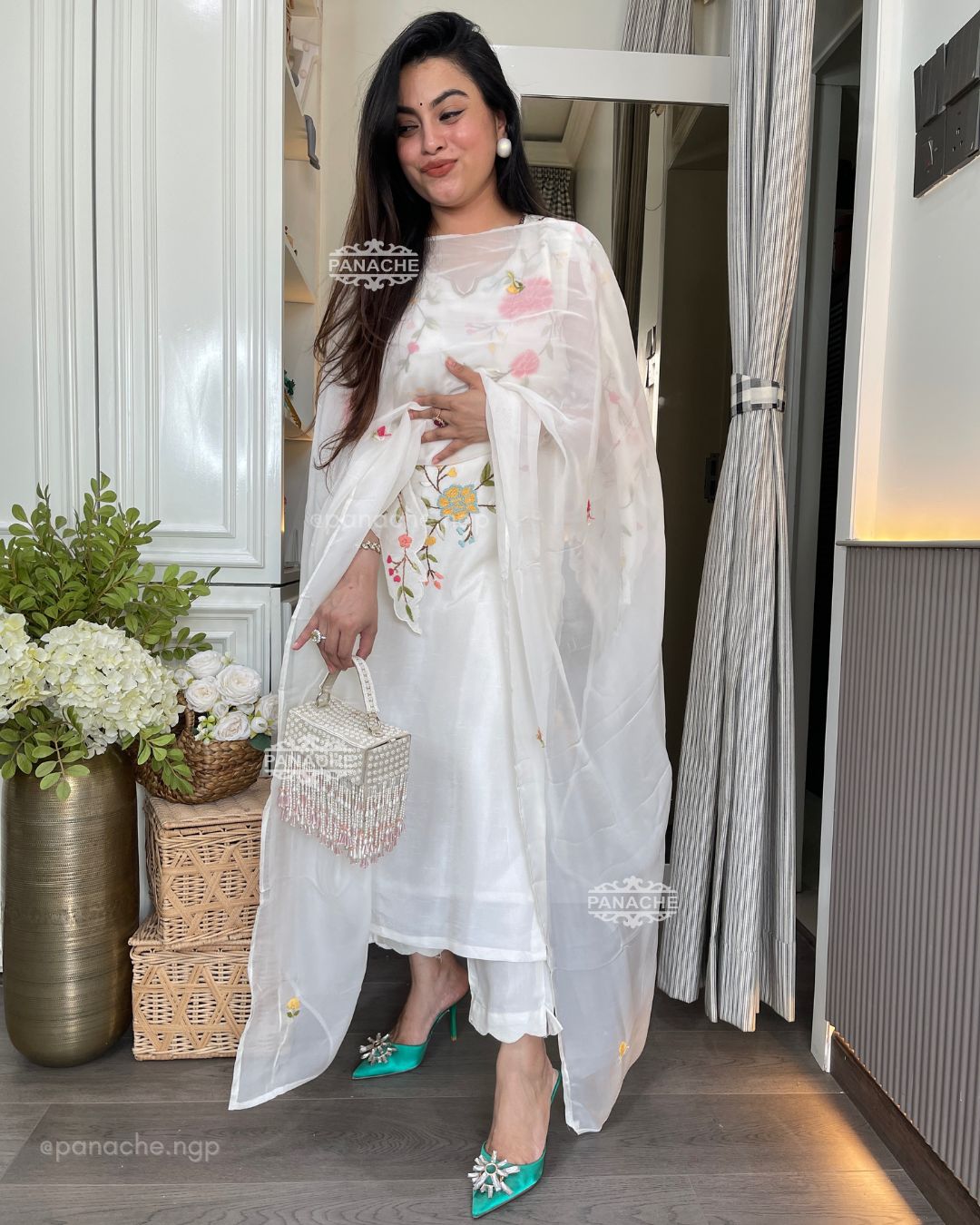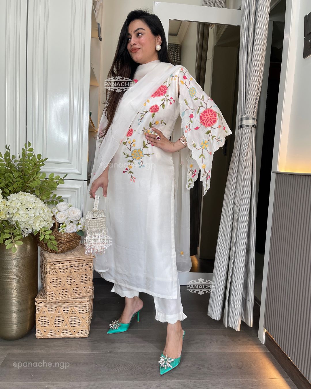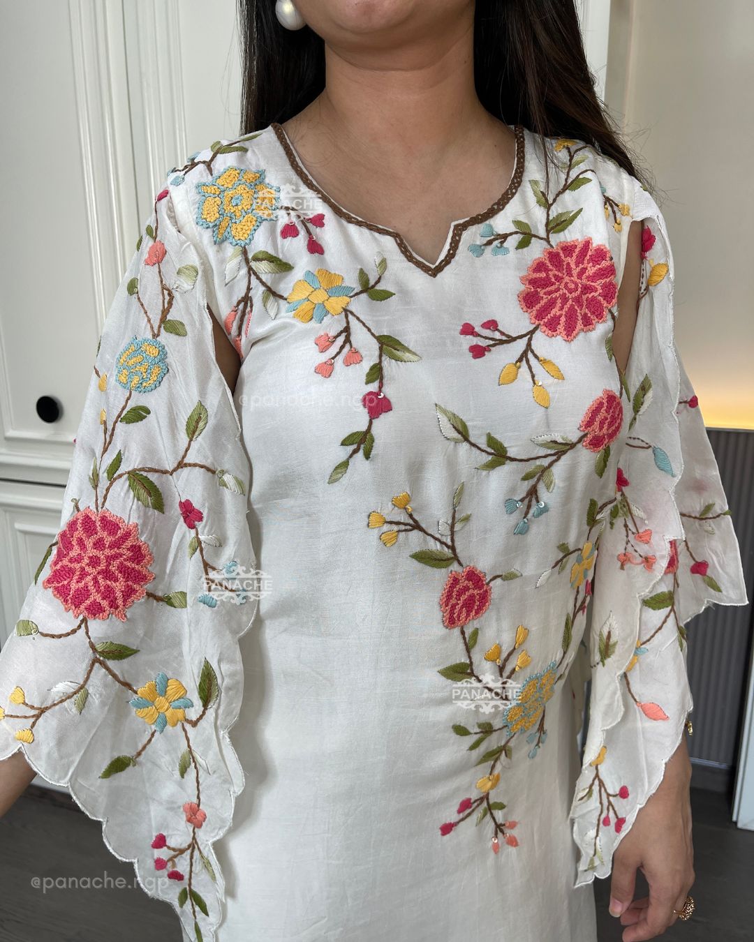 🟣 A twist with sleeves, cape sleeves (sleeves provided inside), frenchknot thread work on neckline with jaal sleeves and scalloped pants