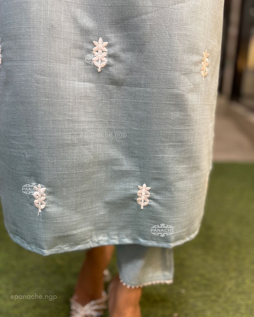 🟣 A soft fabric to compliment with thread white embroidery and small buttas all over kurta with white Crosia on sleeves and pants