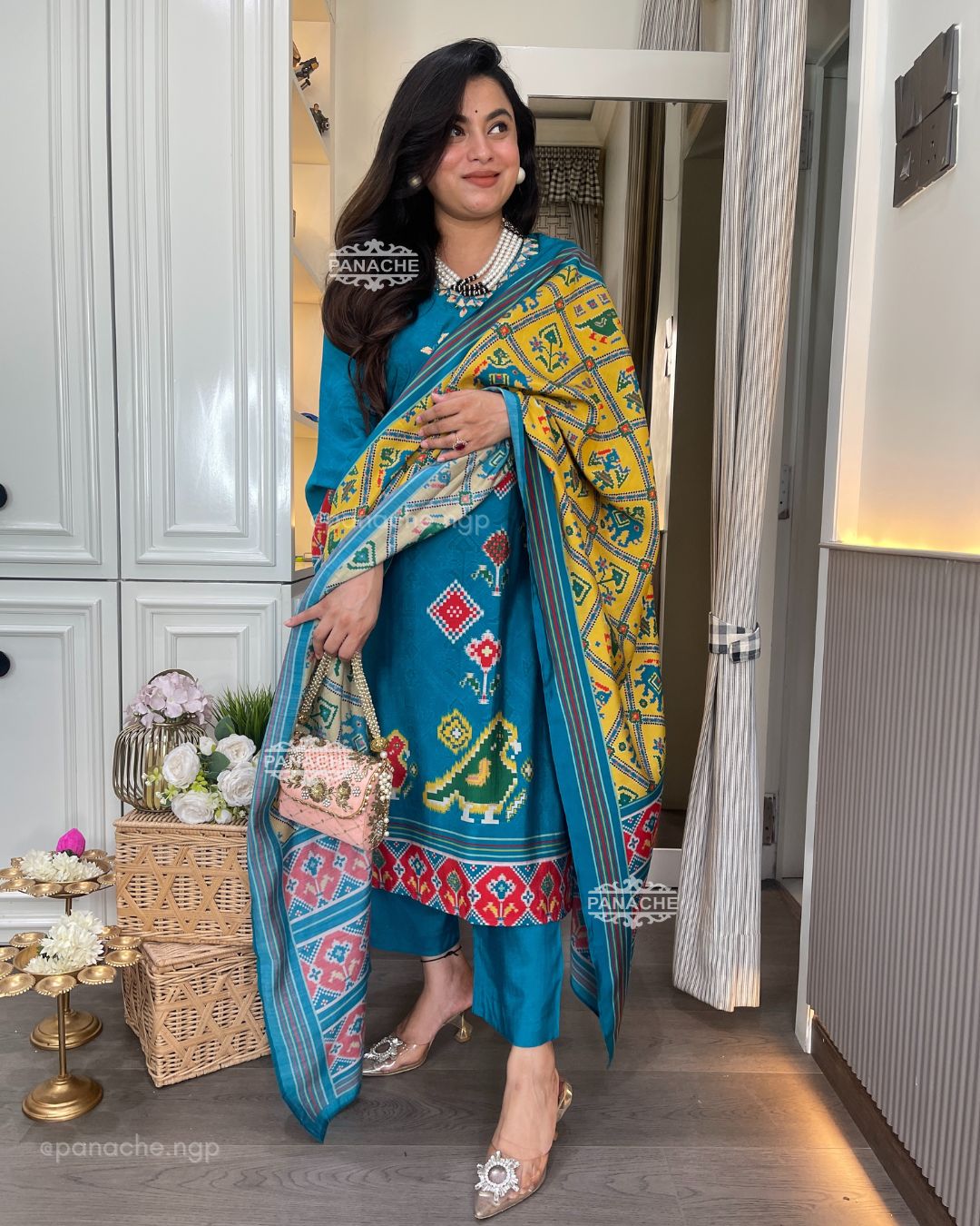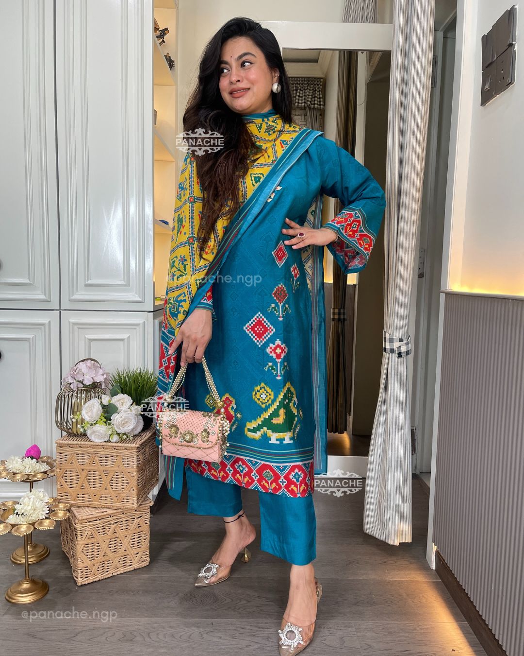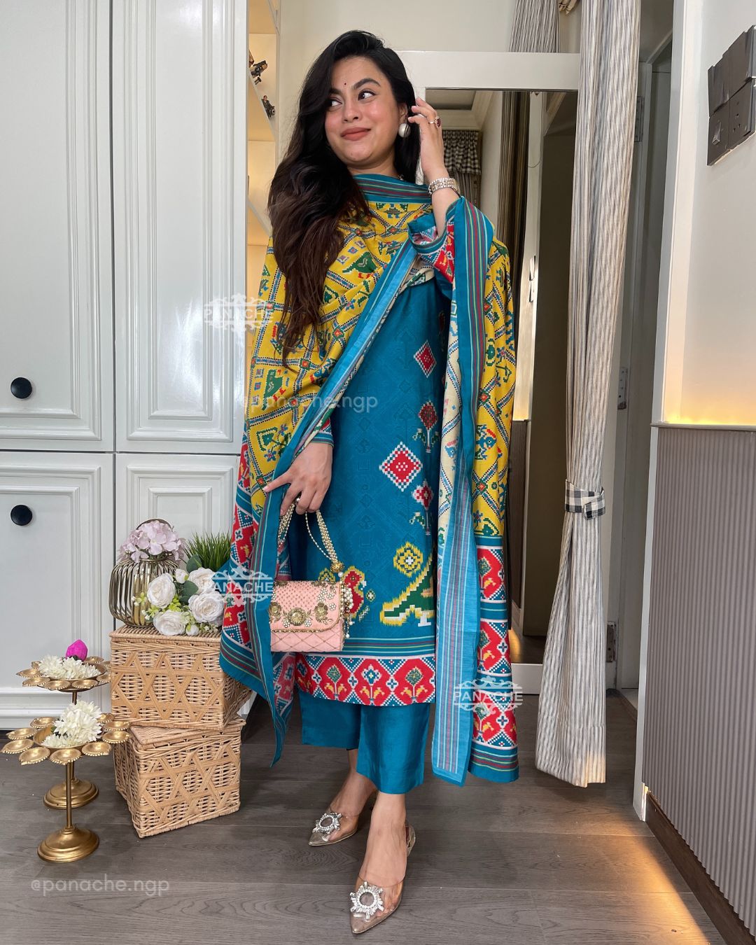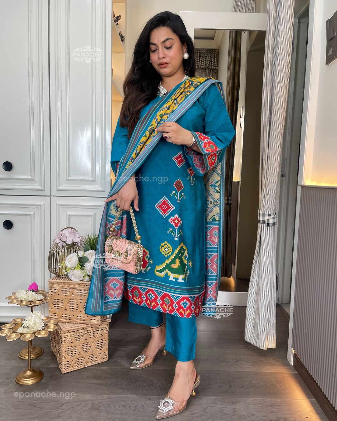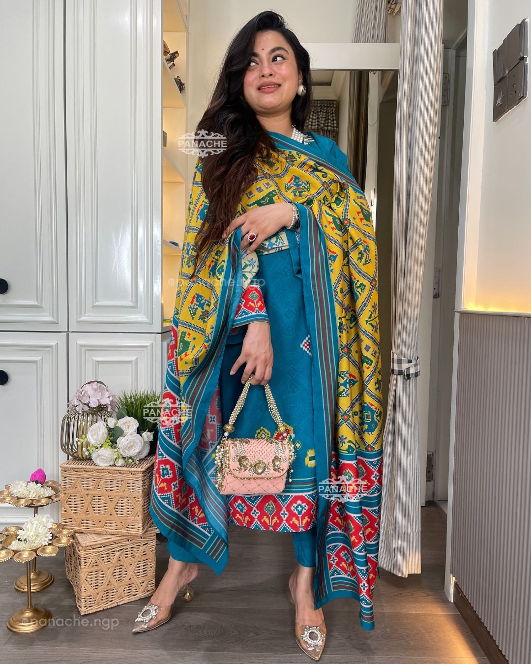 🟣 Mirror work neckline with placement of ikkat print on Daman and a heavy dupatta
